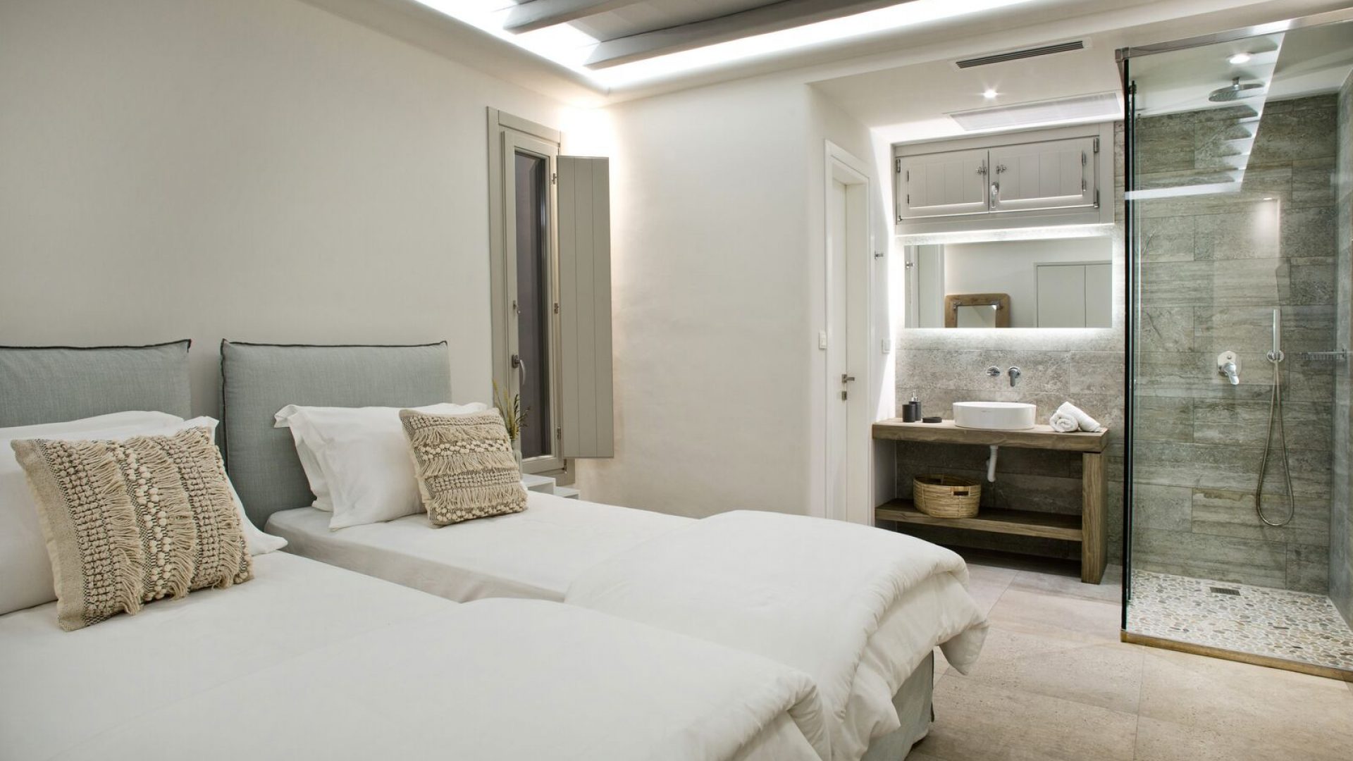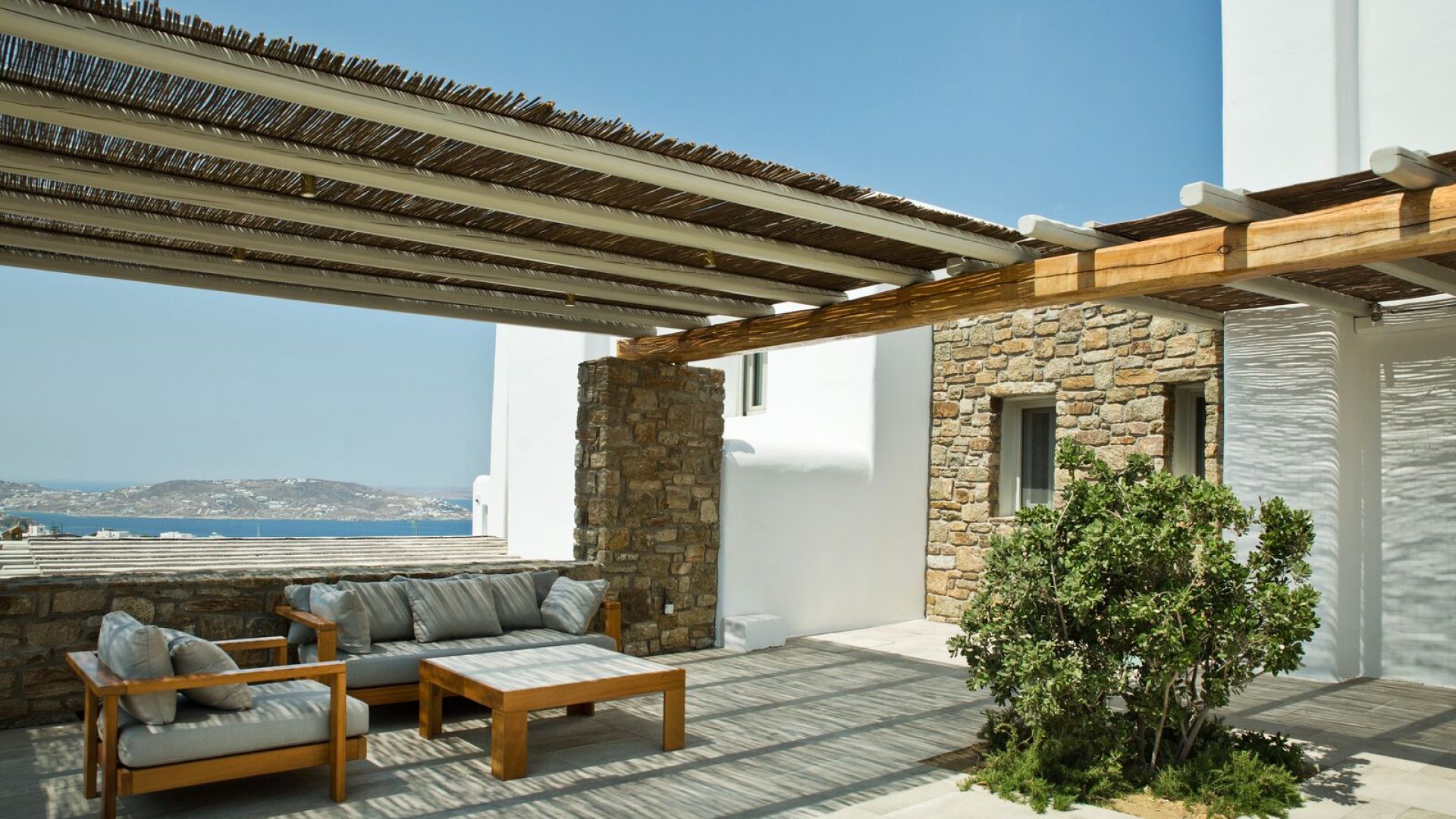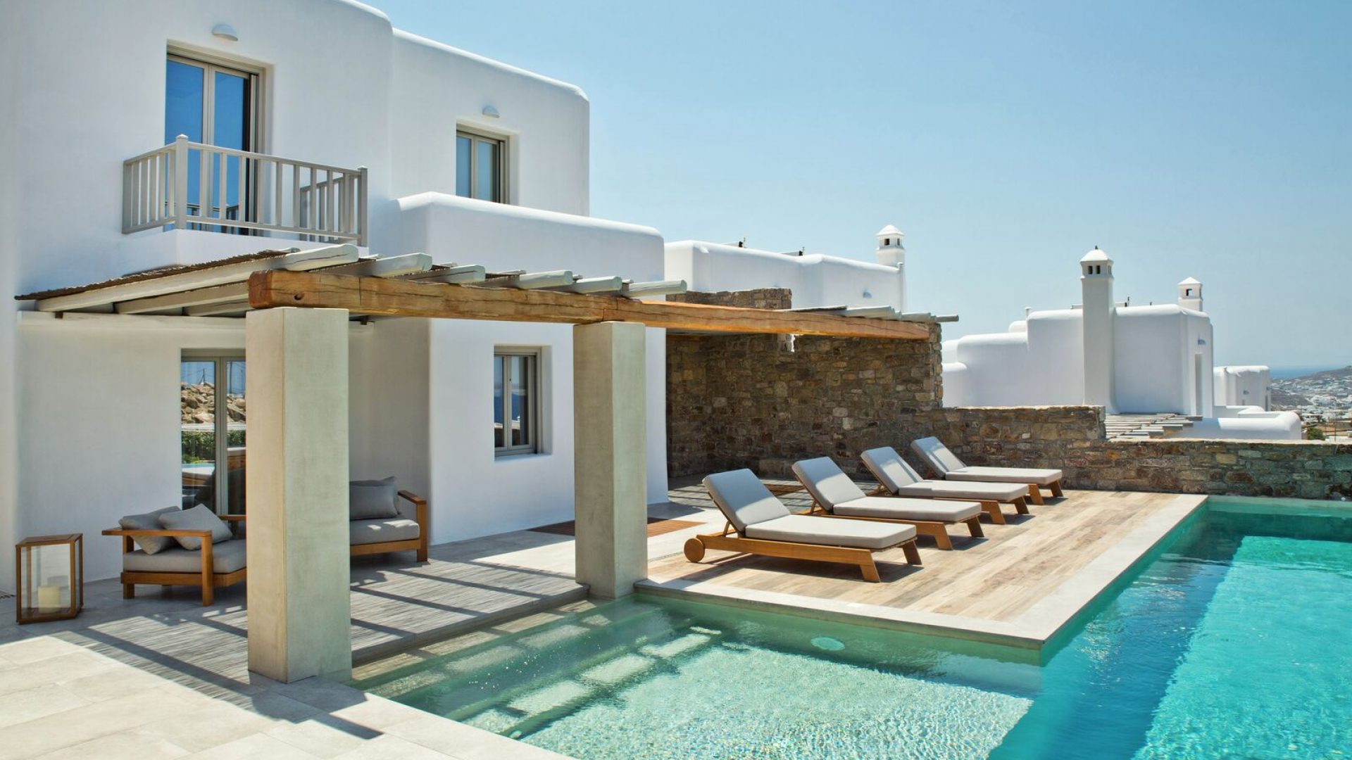 Staying at the Aria Mykonos Villa means you have the whole world in your hands: quiet and serene homelike evenings, a beautiful view of the port and the neighboring islands, access to dreamlike beaches and a walk away from the legendary dining, shopping, and clubbing that attracts visitors from around the world!