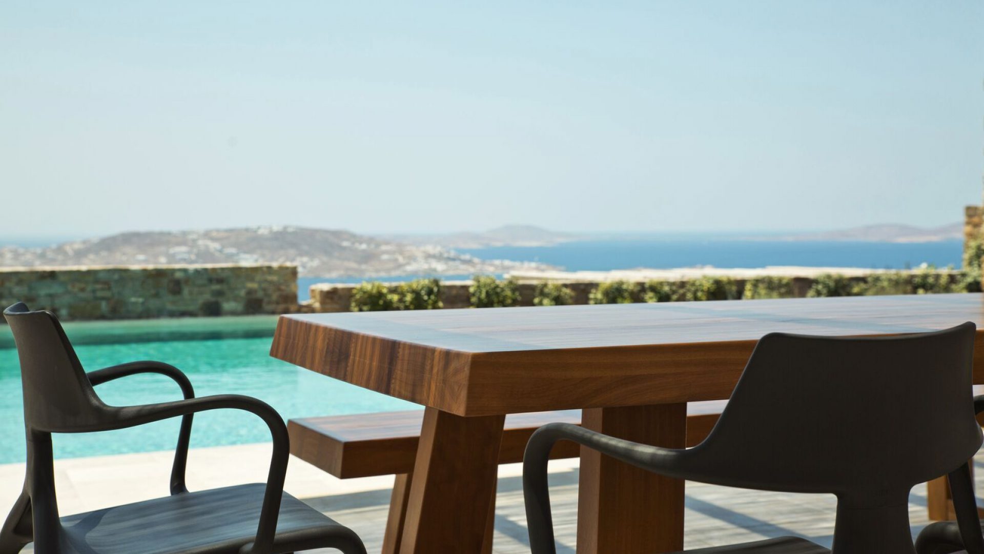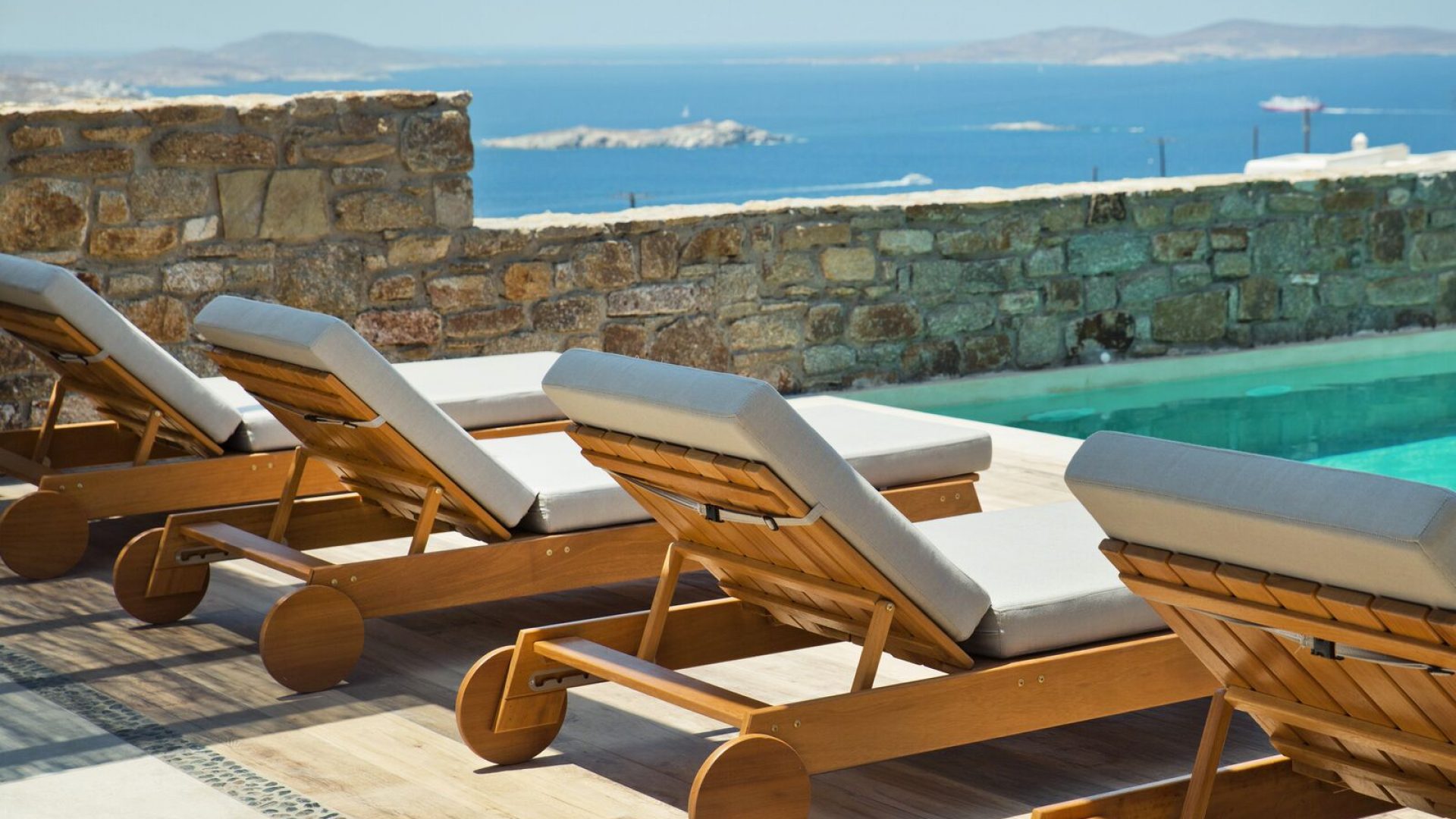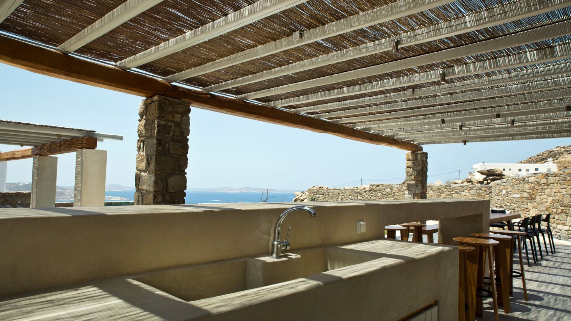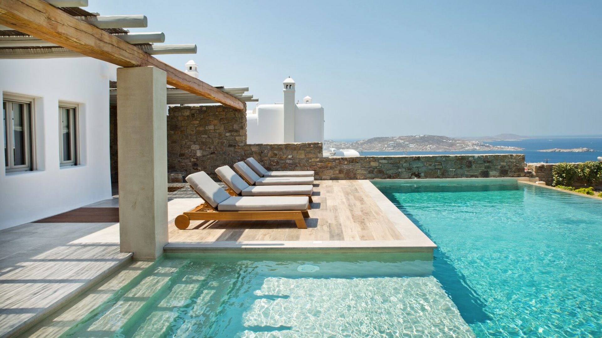 The luxury villa bears its own magic touch; the special qualities of coolness, calmness, and a breathtaking view of the island and the Aegean Sea.