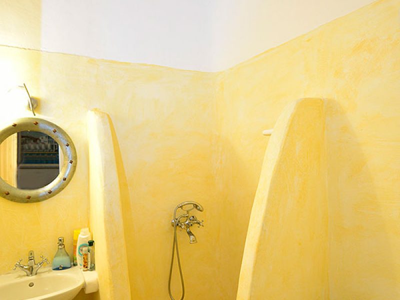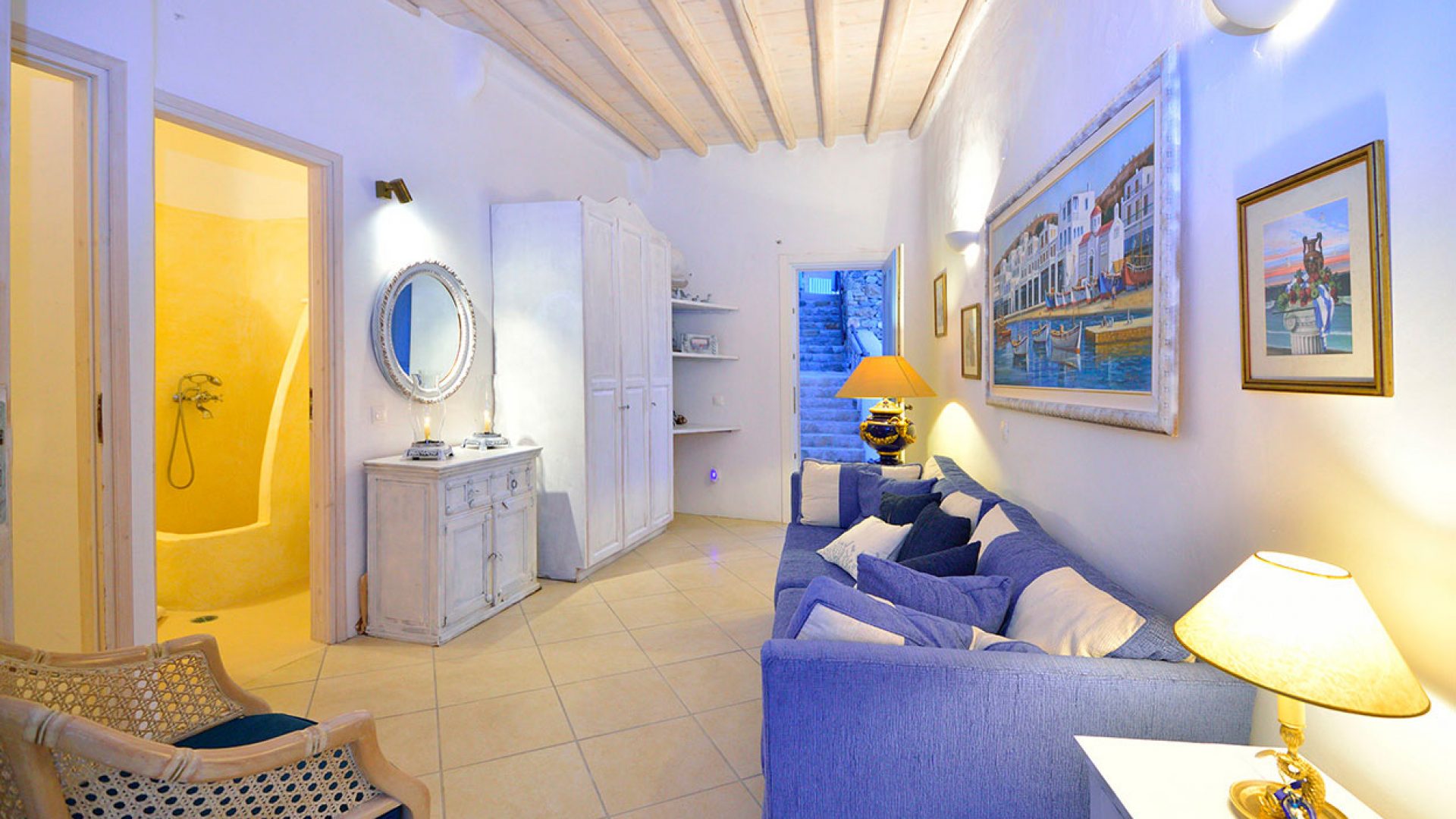 An outdoorsy approach which of course does not compromise “indoor living”, the property’s interiors are colorful and cozy with a traditional Cycladic design which involves the living room and the kitchen on the entrance floor while all bedrooms are located on the lower level. As in the outdoor areas, wood is a dominant element in Mykonos Gem’s furnishing with several unique pieces that give a sense of home away from home to the guests.