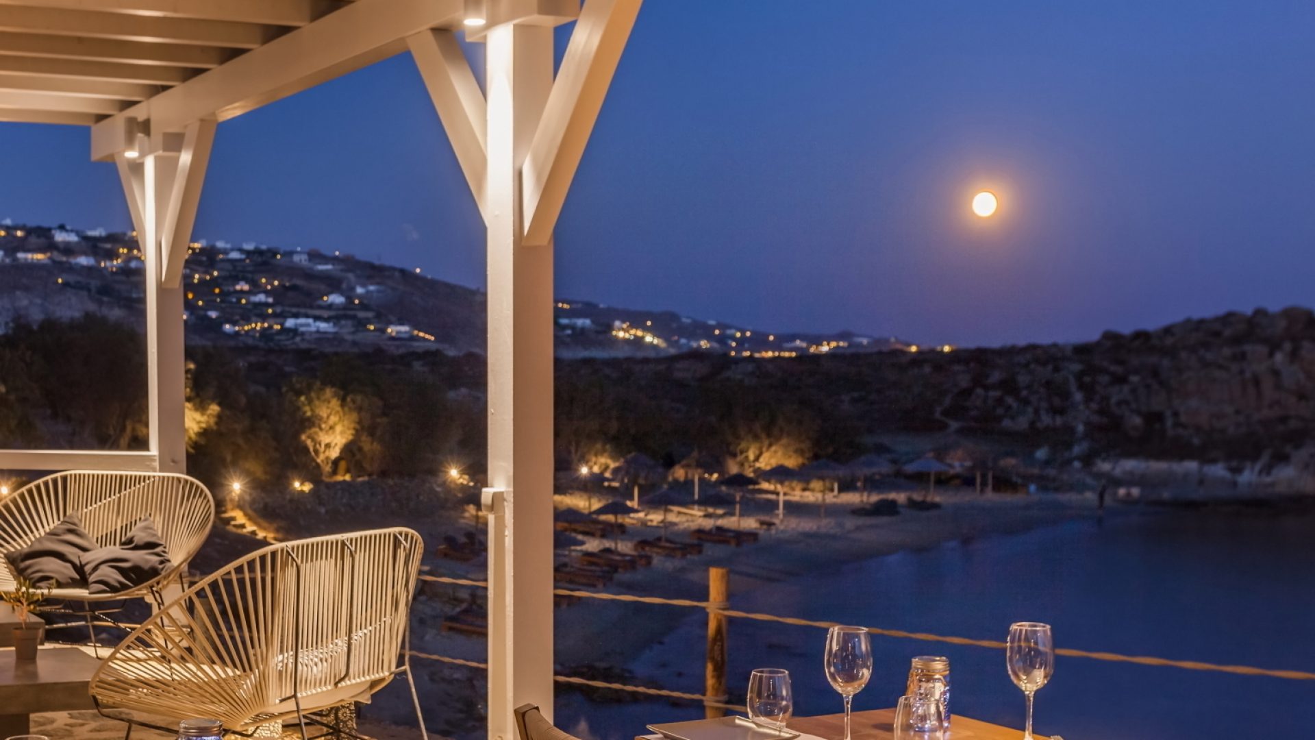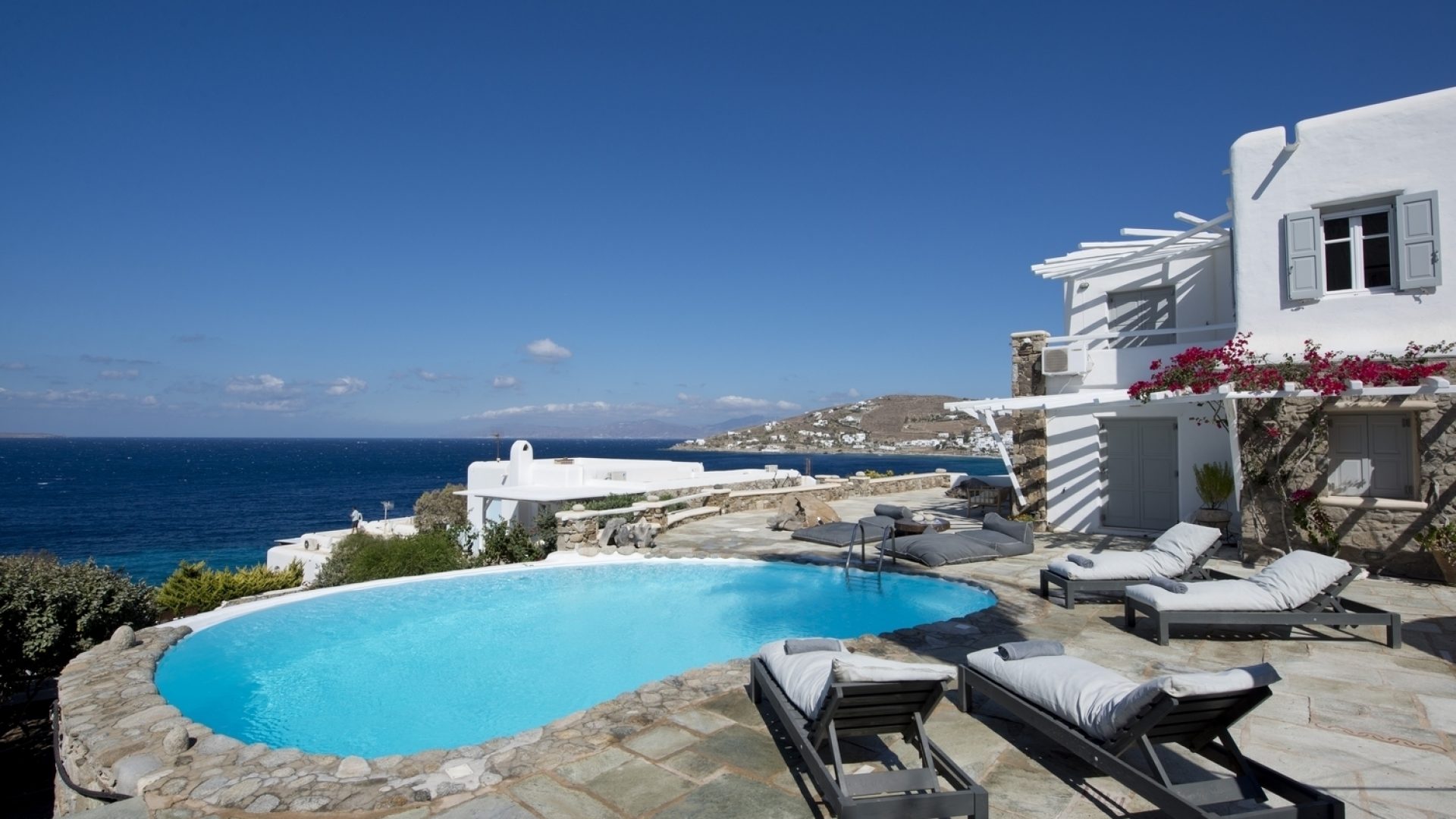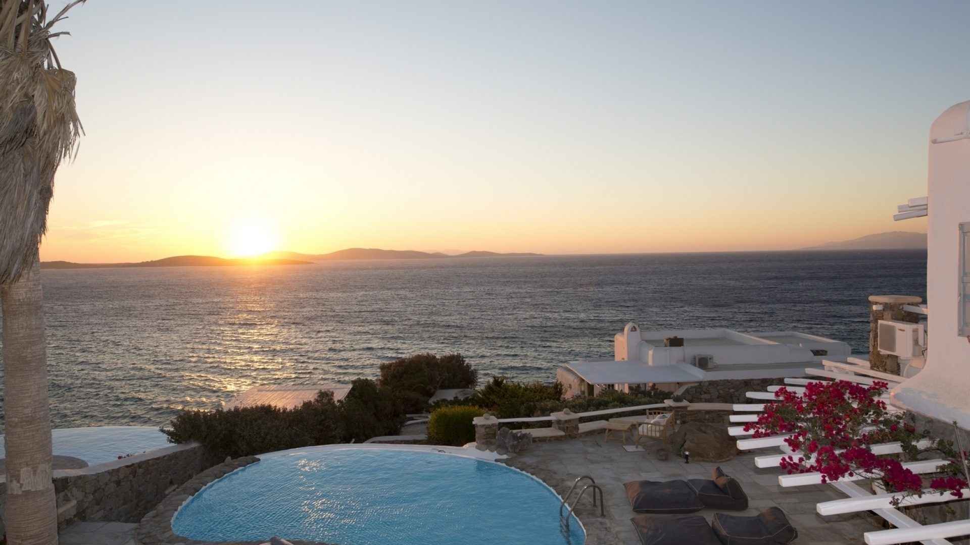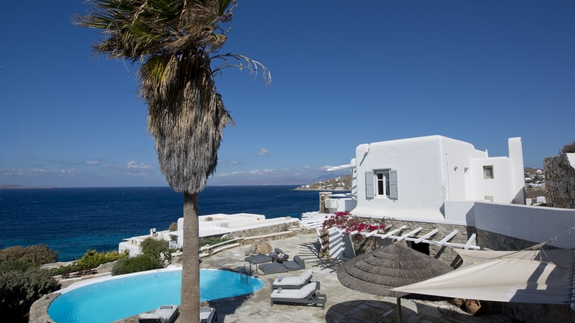 The property is located on the Aleomandra peninsula on the elite south-western shore of the island and a short distance from the fashionable beaches at Kapari, Ornos, and Psarou.