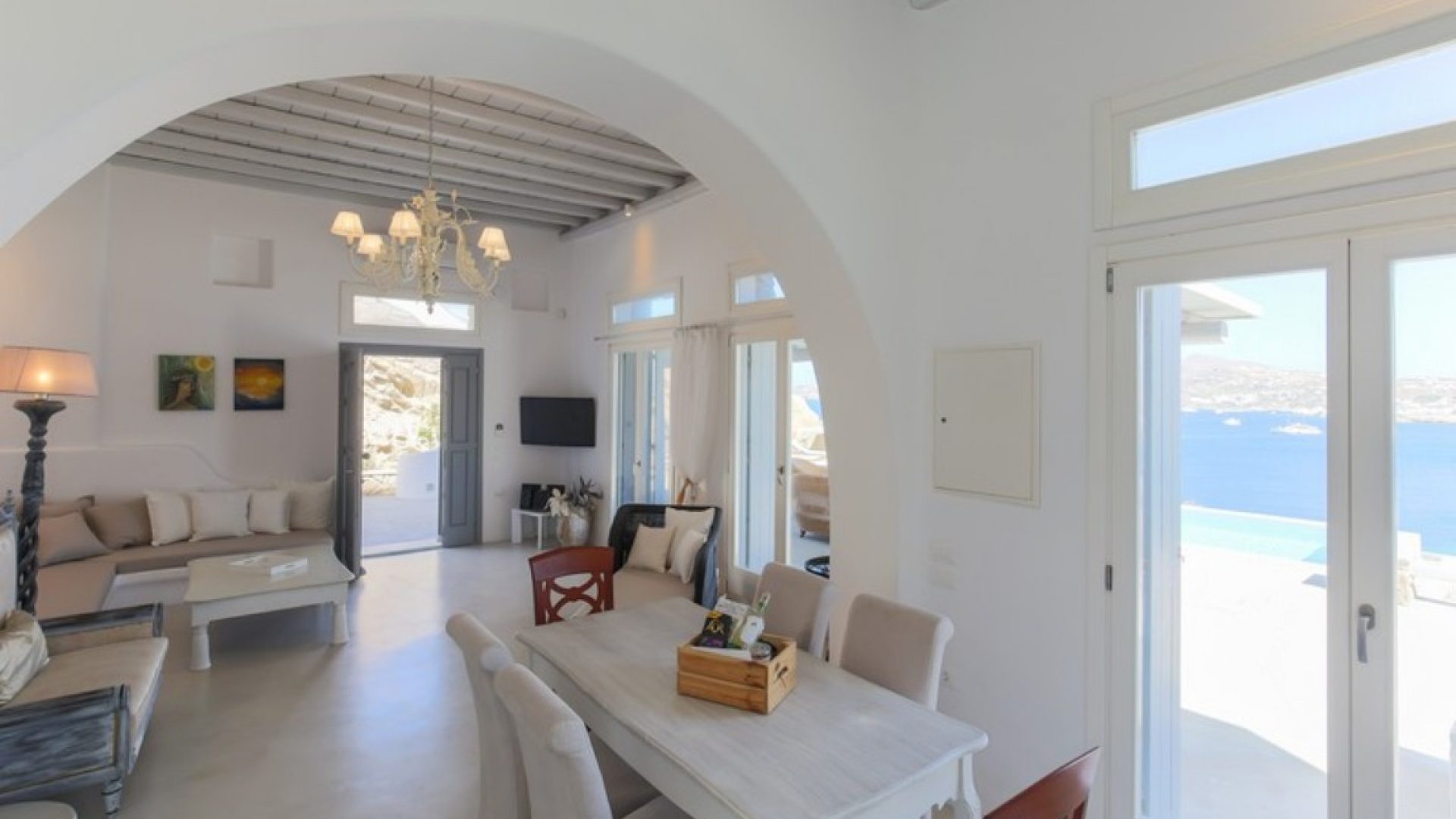 A 160 square meters, two-level property, all in white, perched on a hillside with breath-taking, panoramic views over the Aegean Sea boasting a large open plan living area indoors and outdoors and offering privacy and seclusion in a very idyllic spot.
