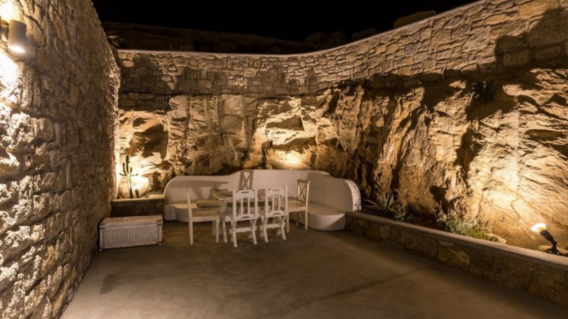 A hillside hideaway in a secluded nearly rural area although close to the town, where you can relax after a long day at the magnificent beaches of the island or a long night in the vivid nightlife. Carved on a hill, 50 m from the coast, in an extraordinary setting framed by beautiful countryside, it blends uniquely in the rocky topography of its hillside, prime and unspoiled, setting.
