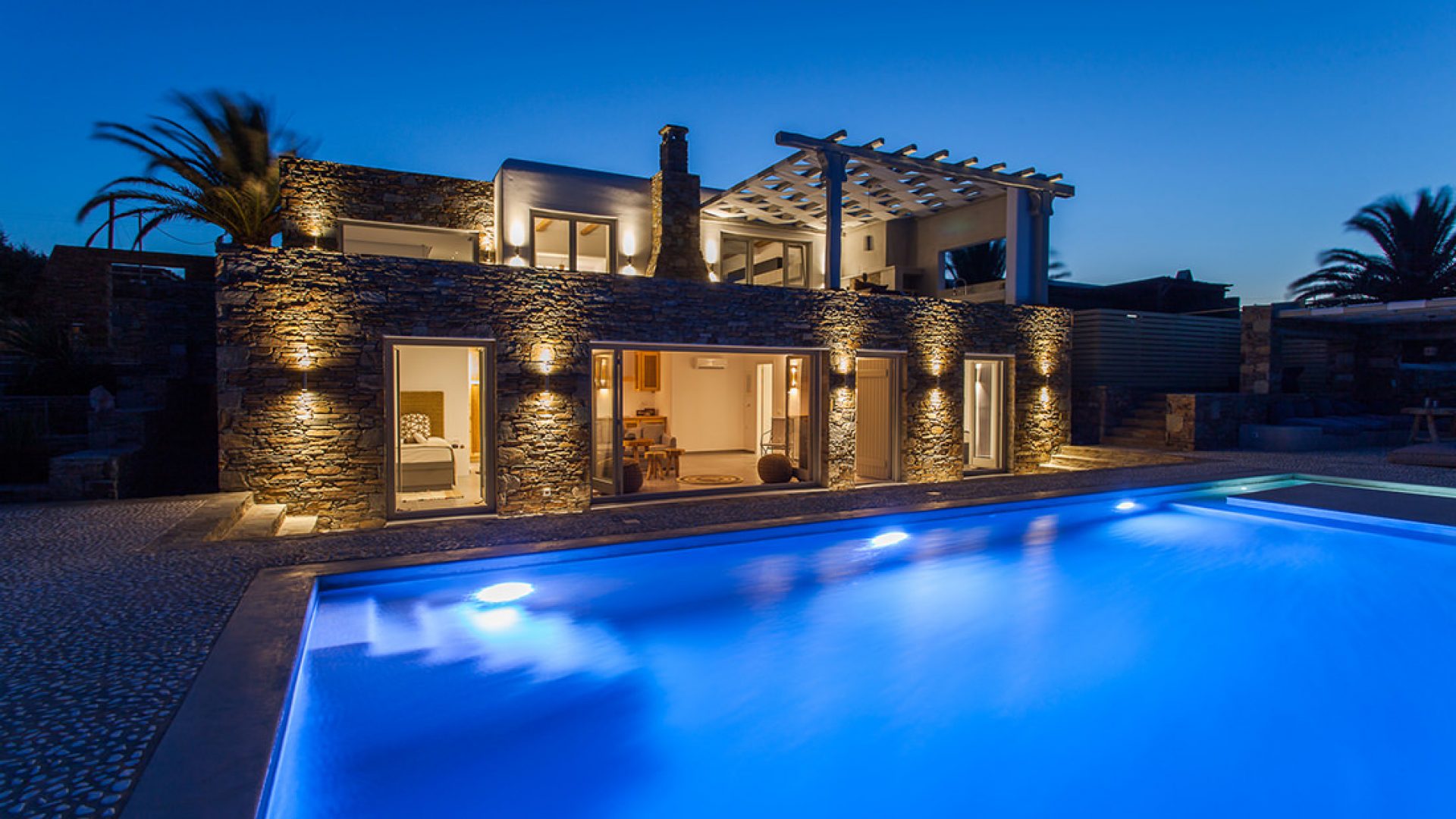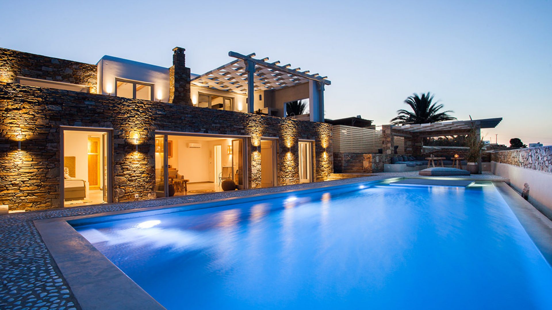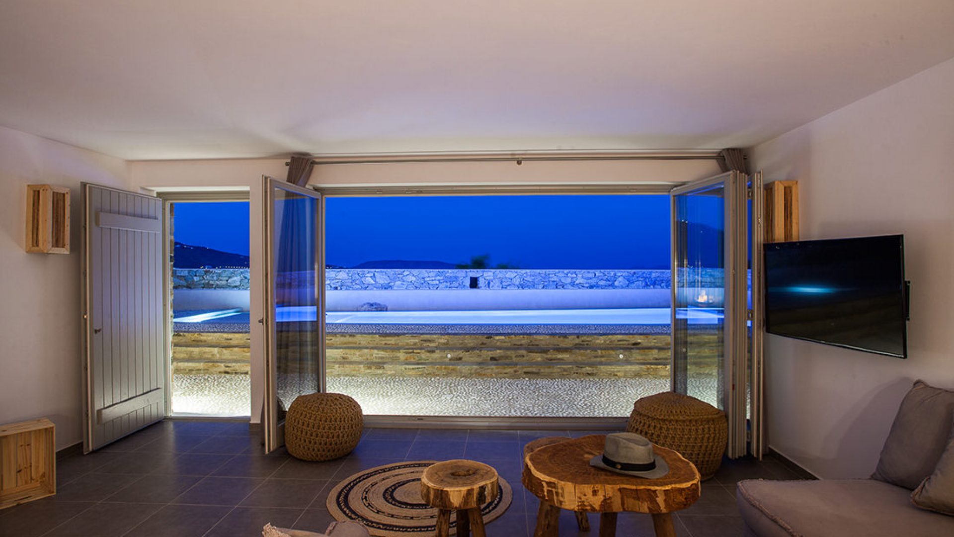 Pioneering a timeless contemporary Cycladic architecture, influenced by traditional Greek tone, Myconian Principal Villa has been designed to flow elegantly between indoor and outdoor living. Interior has been eclectically signed, vastly incorporating natural materials like local Myconian stone as well as massive parts of wood; delivering absolute comfort in breath-taking surroundings, making you feel like home, away from home.