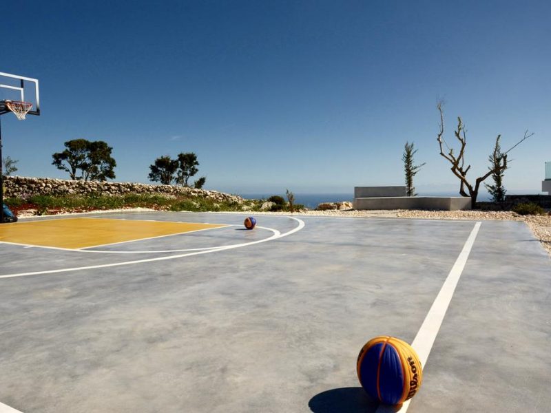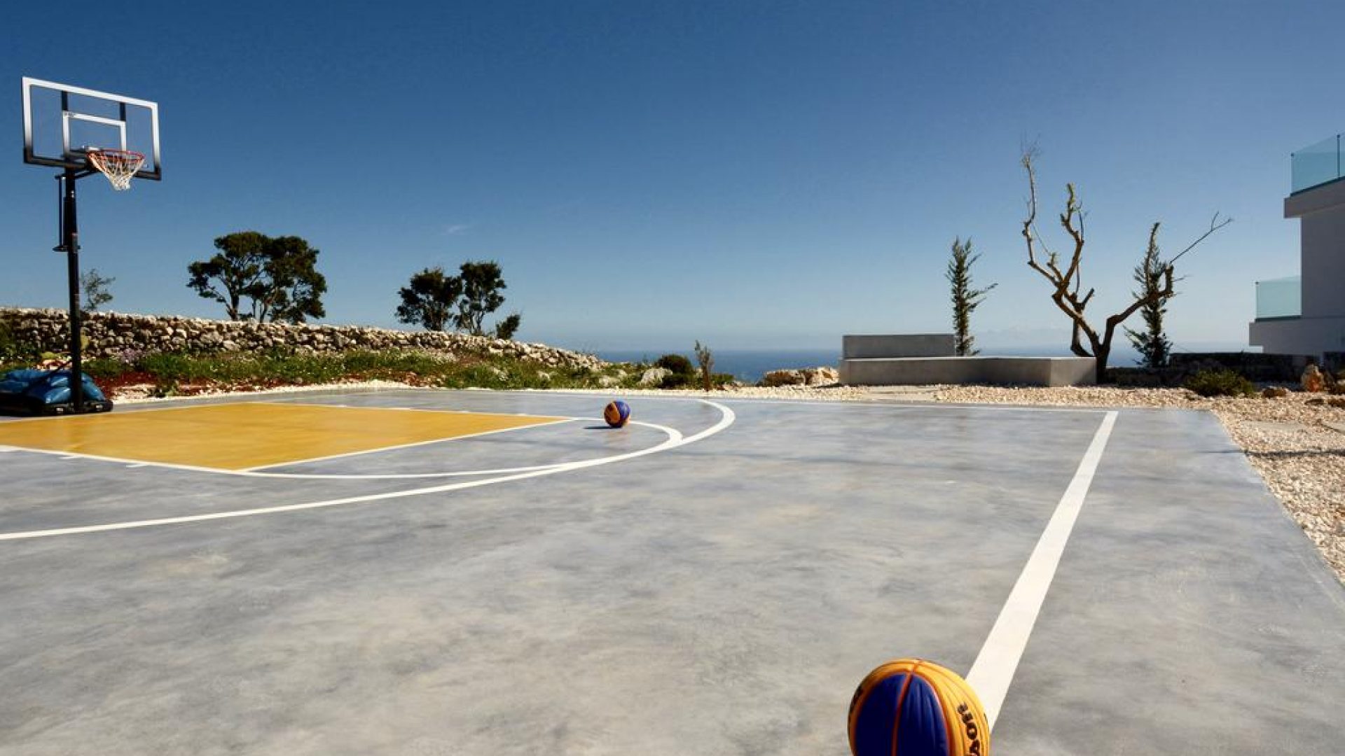 The villa boasts generous outdoor space within its large gated property: with an impressive three-side infinity pool, a half basketball court and a helipad.