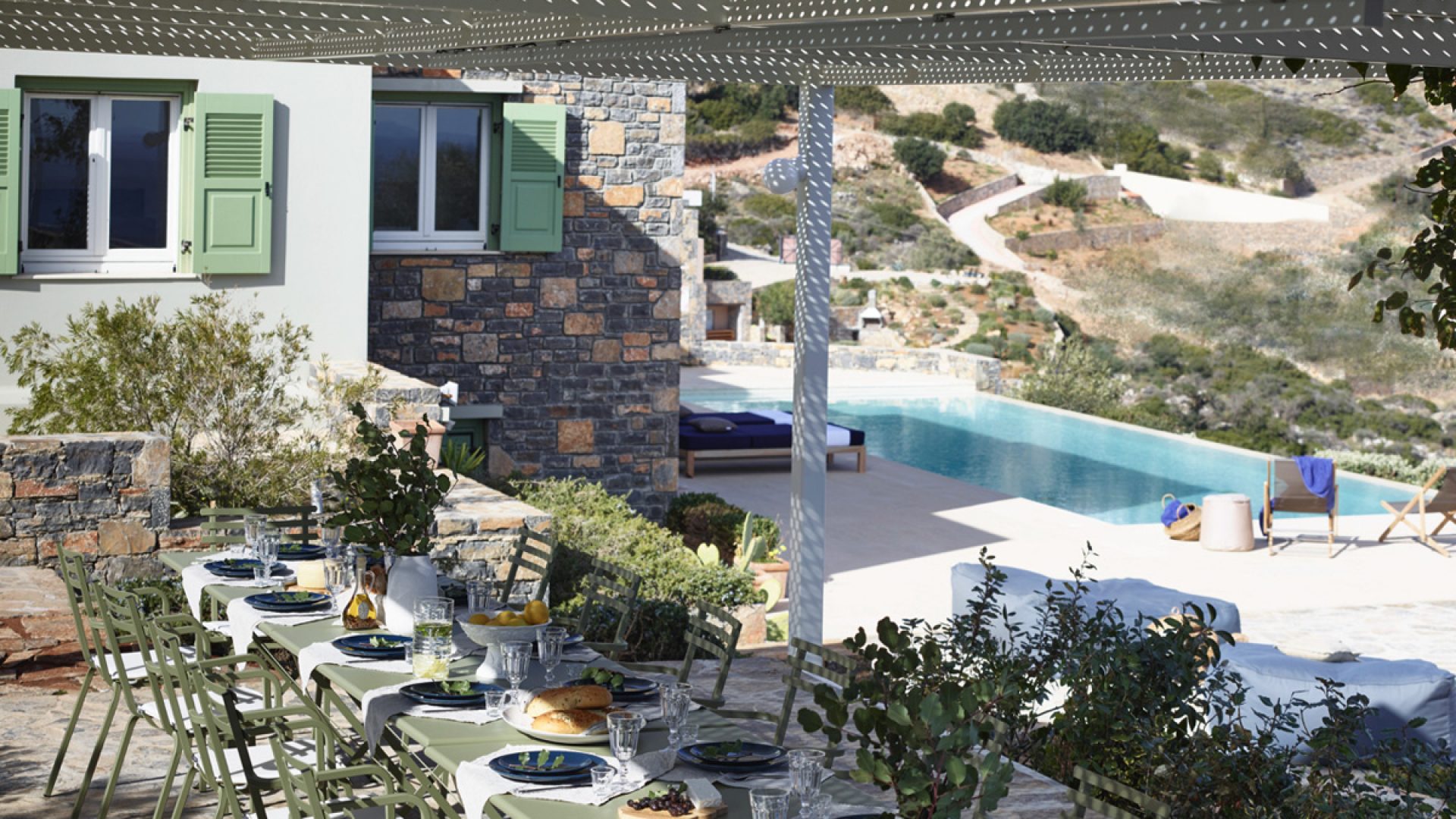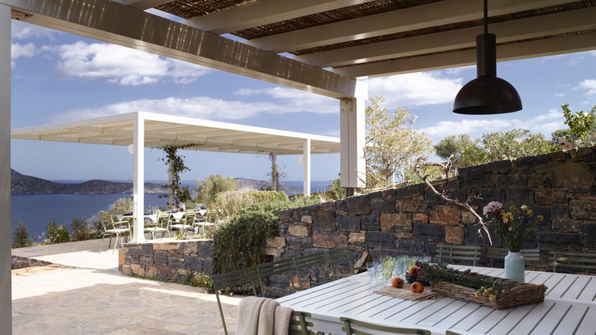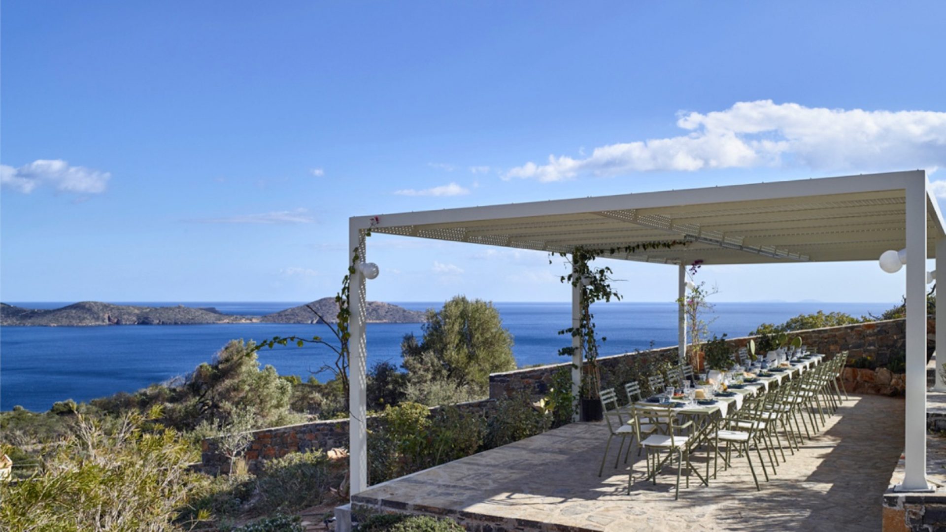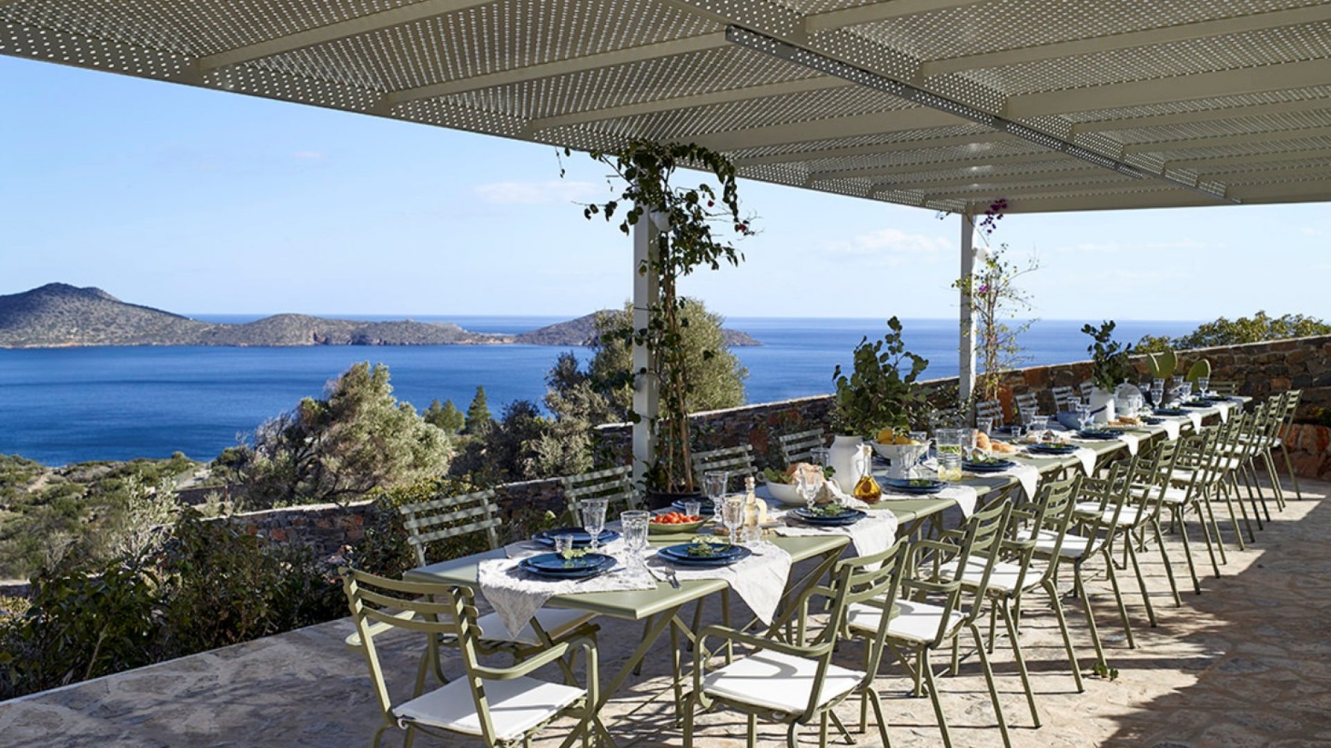 We offer various shaded dining areas in both Villas. This year there is a new lightweight pergola structure. It can seat up to thirty guests at one long dining table and has stunning views of the Mediterranean.