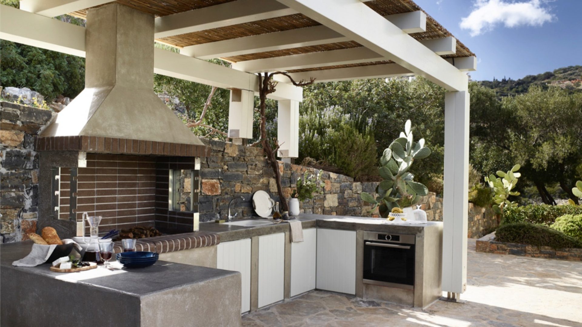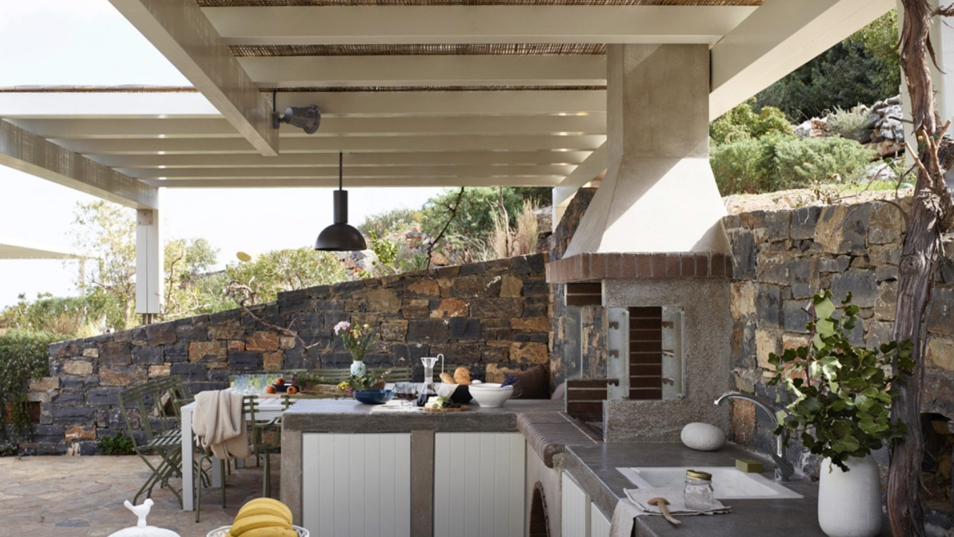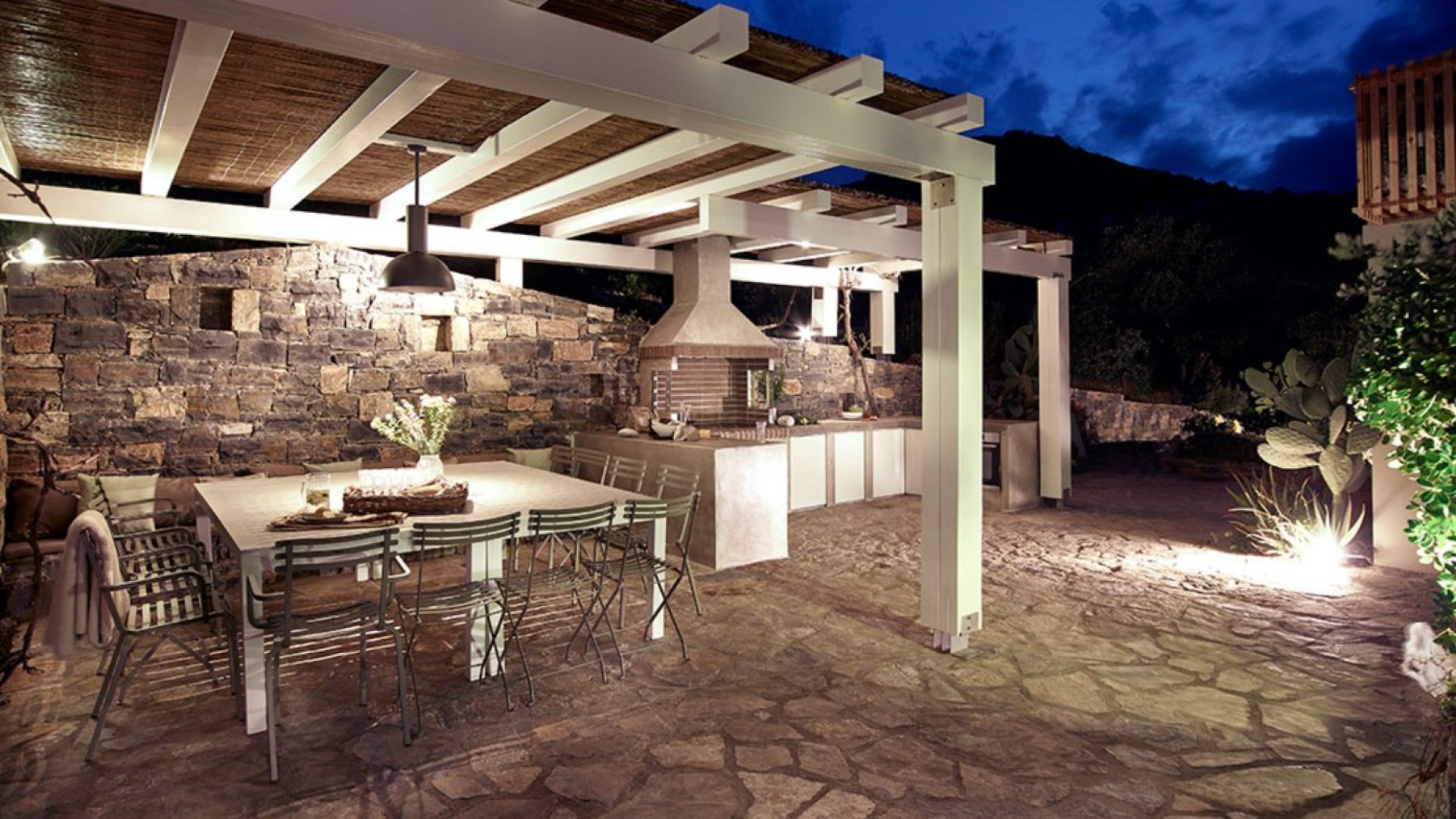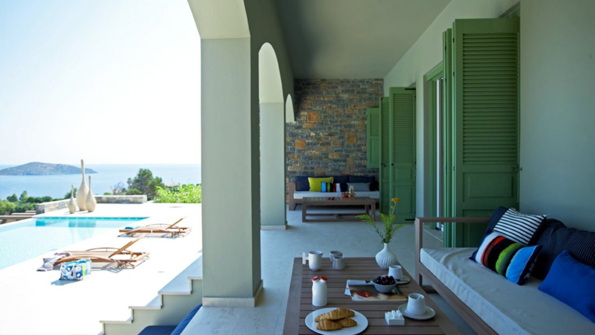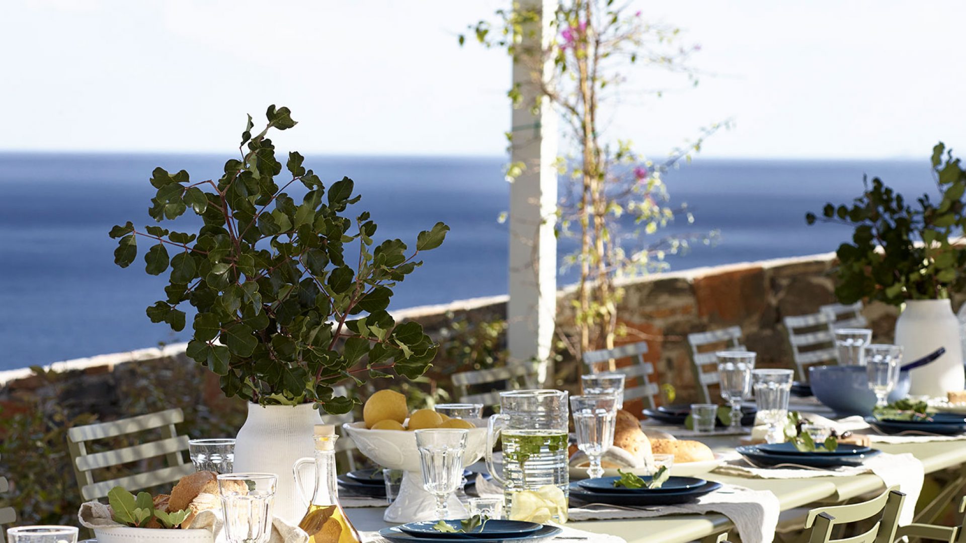 We offer various shaded dining areas in both Villas. This year there is a new lightweight pergola structure. It can seat up to thirty guests at one long dining table and has stunning views of the Mediterranean.