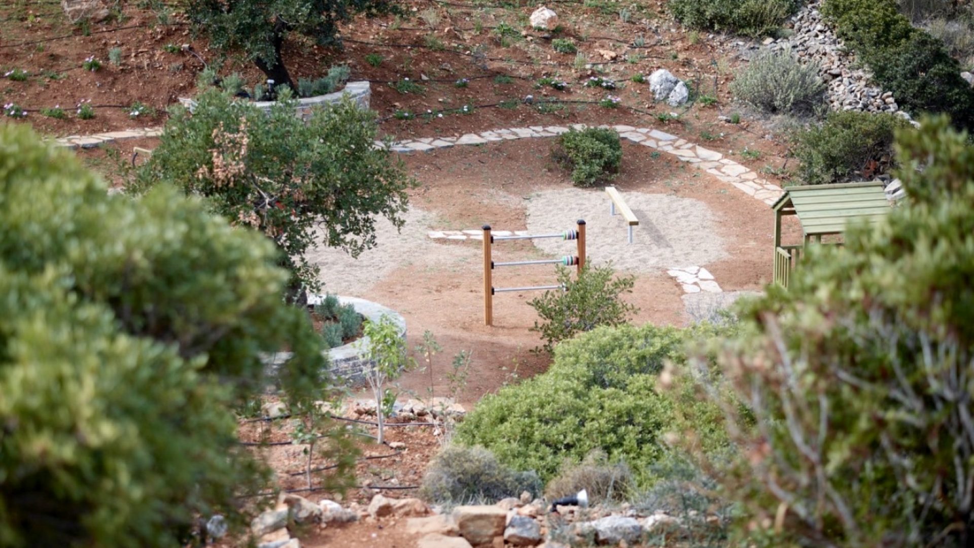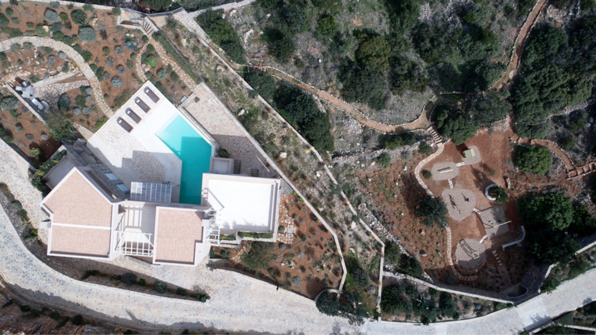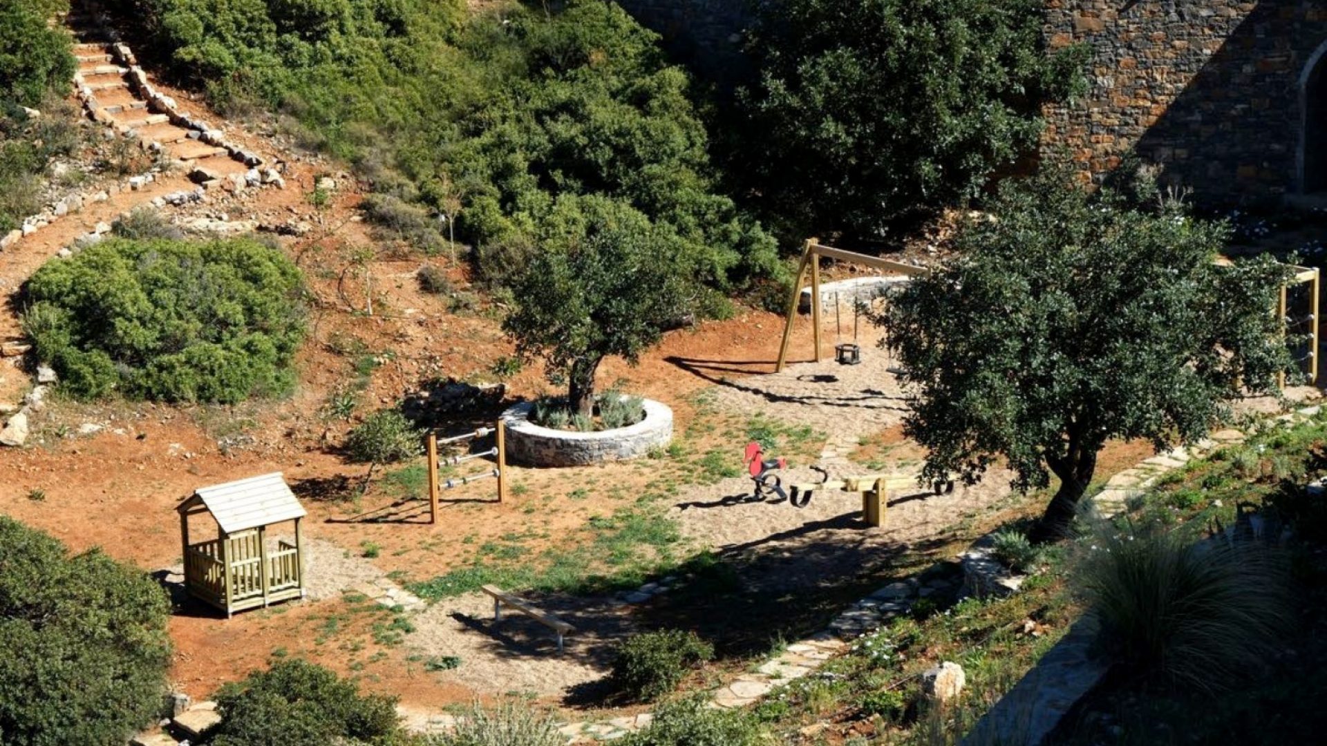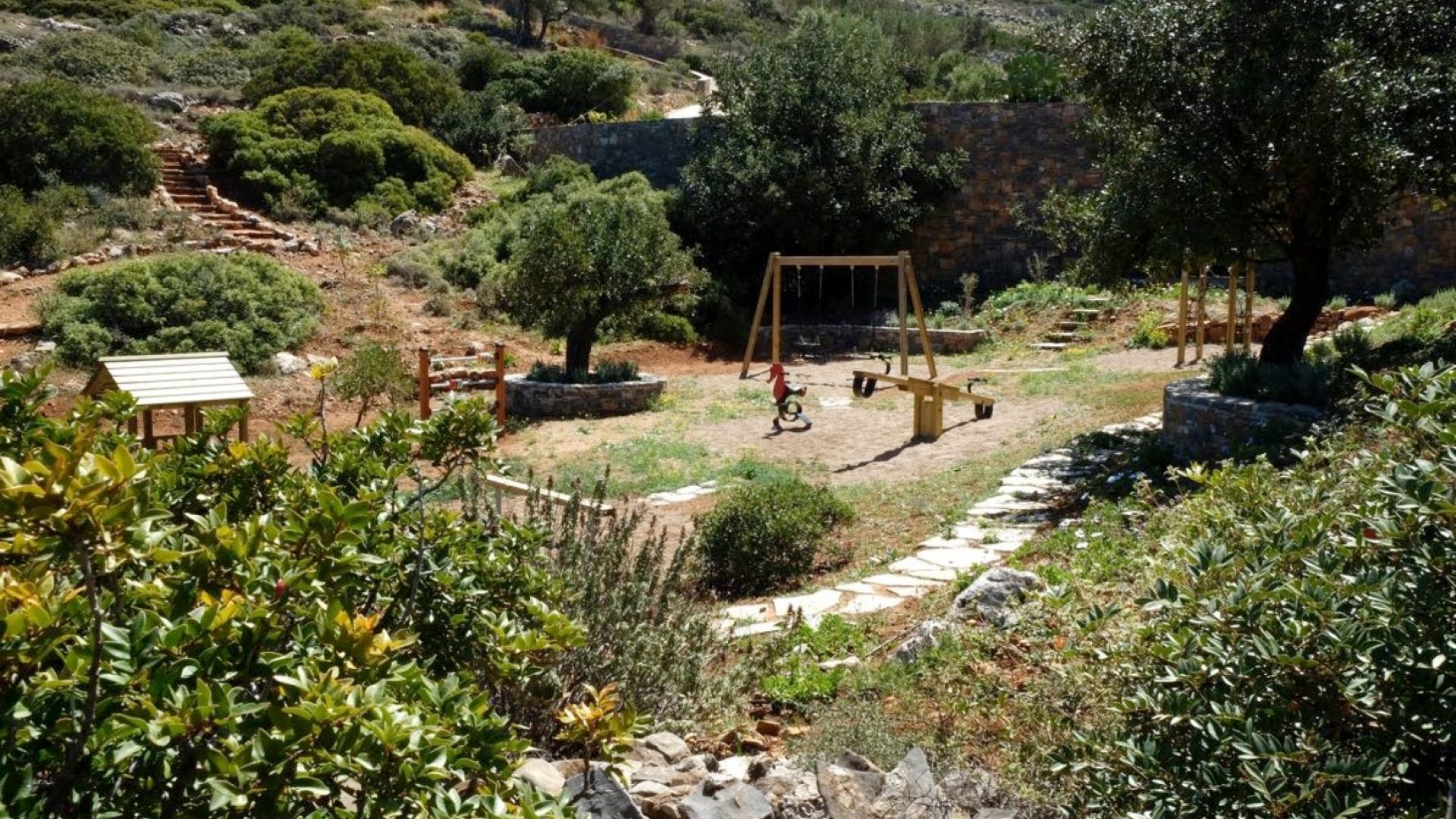 The unique piece of land lays at 13,700 square meters (or 1.37 hectares). It houses two of the most exclusive properties available in Crete. New to the estate this year is a secluded, scenic private playground. All the play equipment there is fabricated from timber in Finland. Within the estate are also various carefully designed paths through the olive trees and local vegetation. This gives you the chance to live in and enjoy the Cretan environment and nature to the fullest.