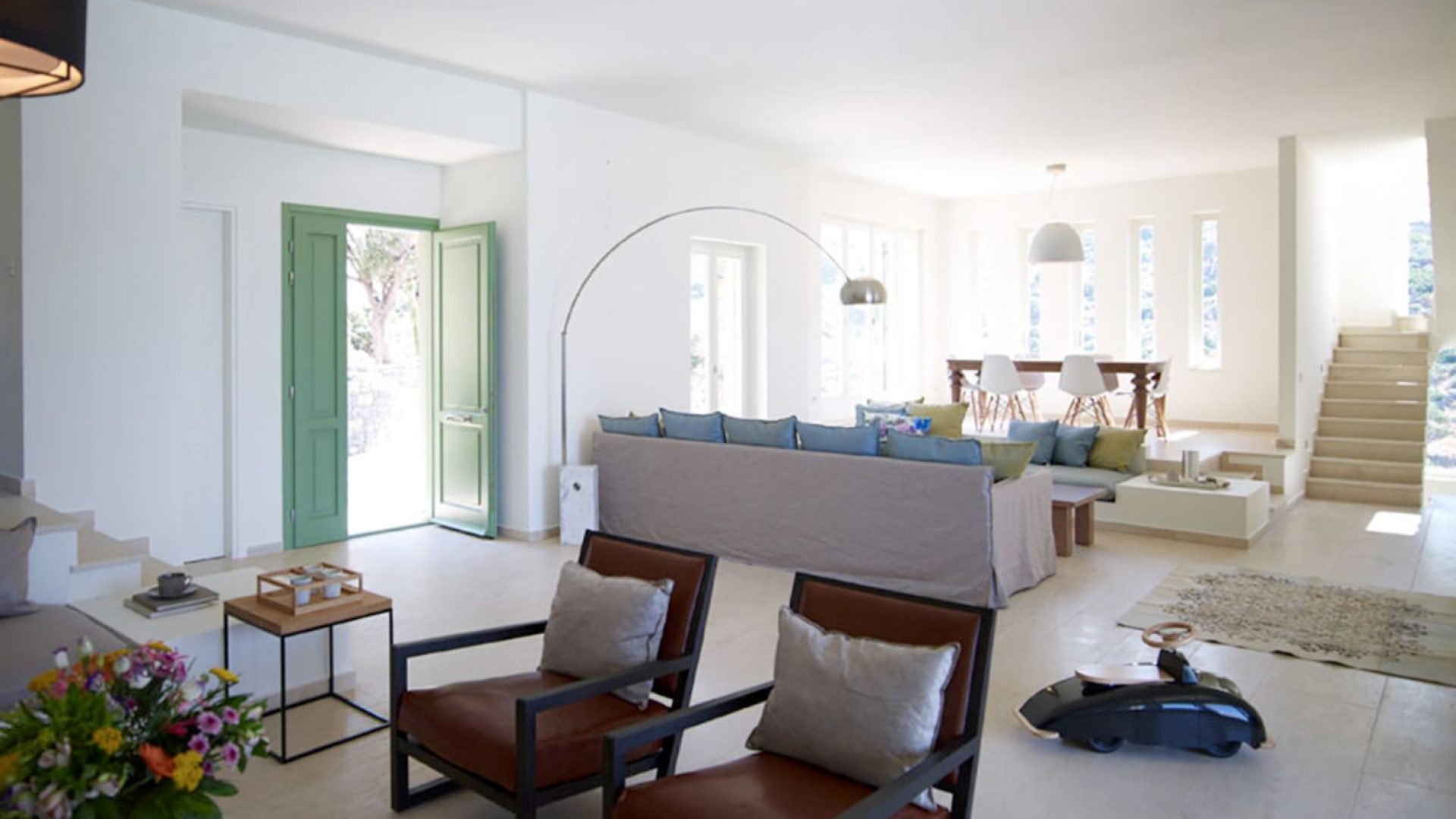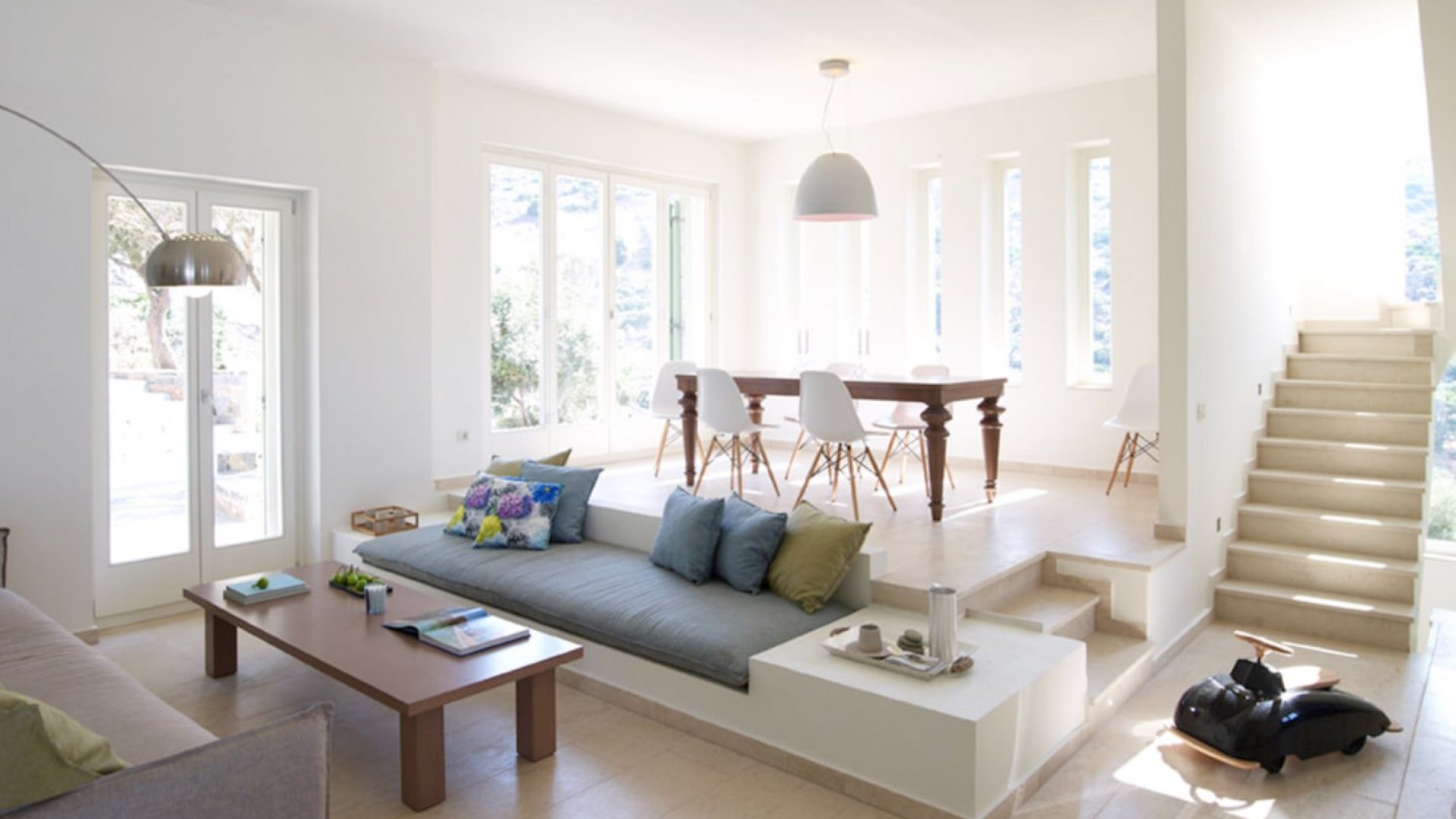 Spacious open-plan and sun flooded living and dining area with high ceiling, fireplace, Satellite TV and DVD player, sofas, dining table (seats approx. 8) and study area. French doors open onto the shaded lounge terrace with access to the pool area