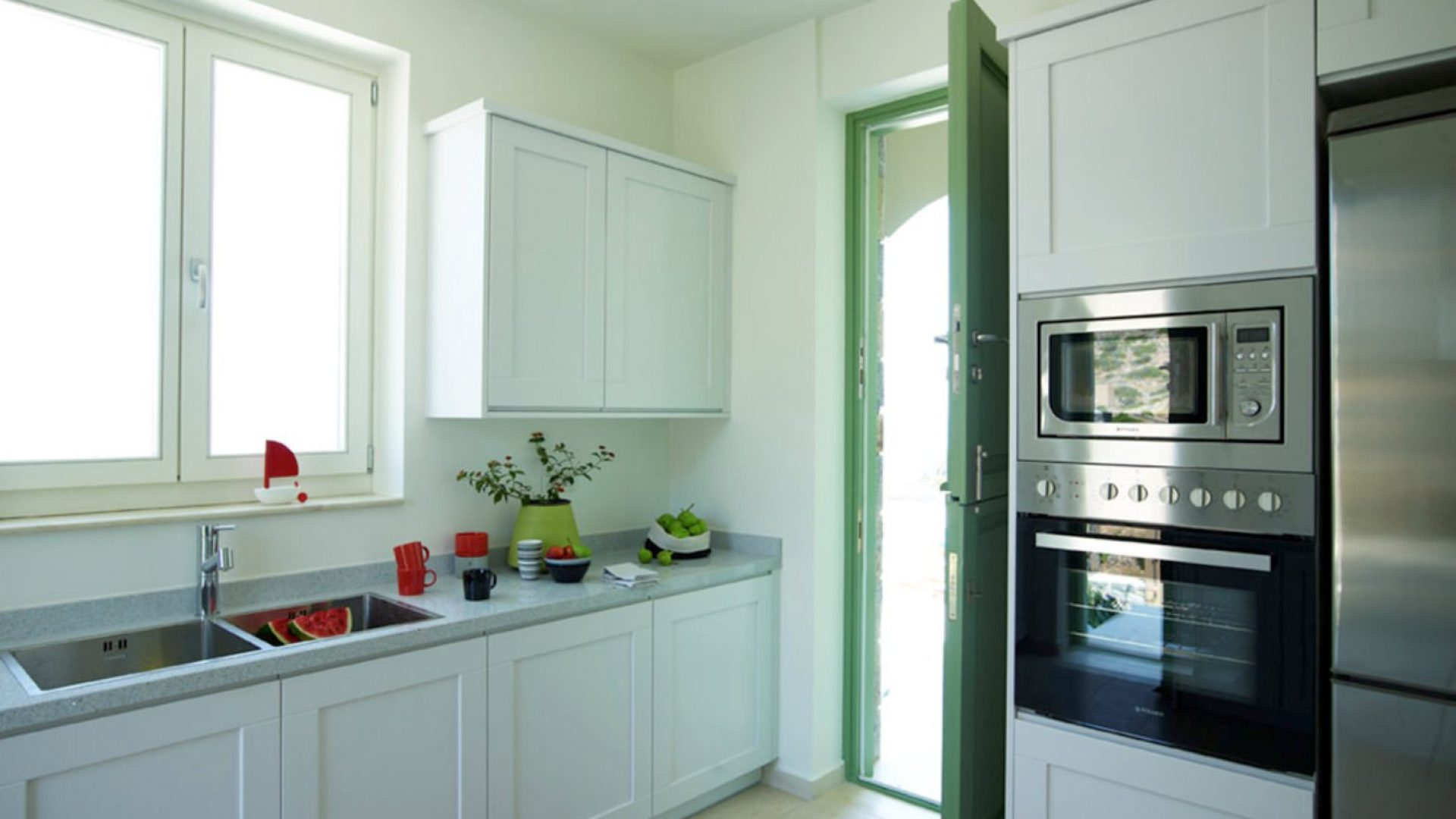 Fully-equipped kitchen with door leading to the outdoor terrace, W.C.