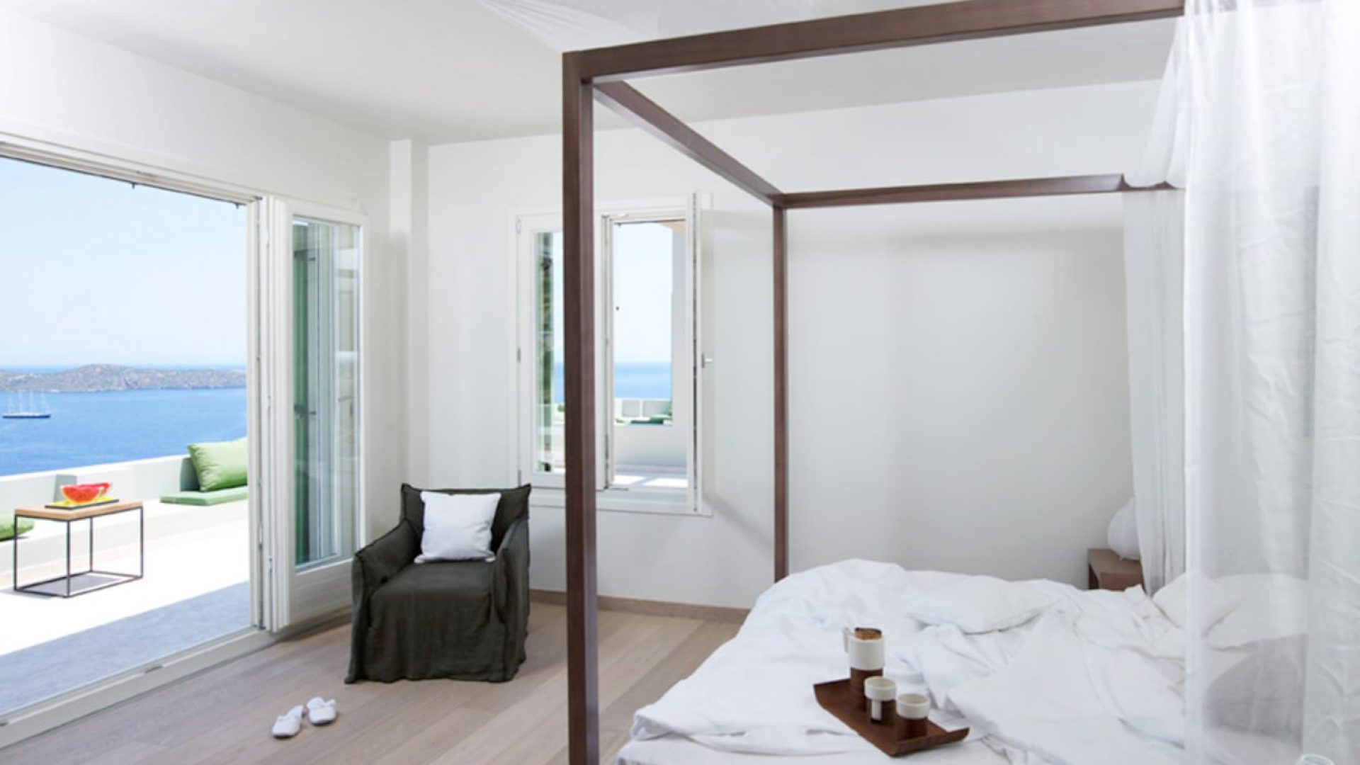 Master bedroom (1.80m four-poster bed) with en-suite bathroom, closets and private terraces with sea views