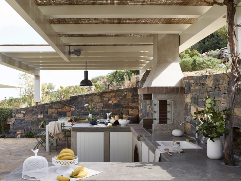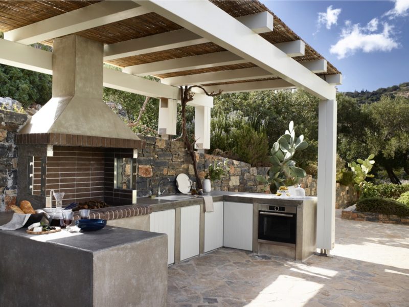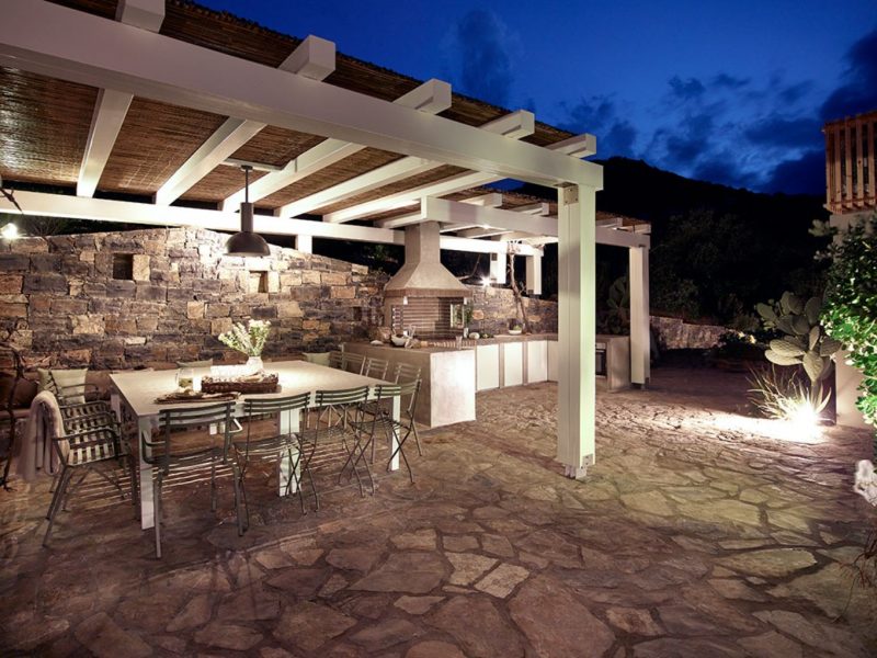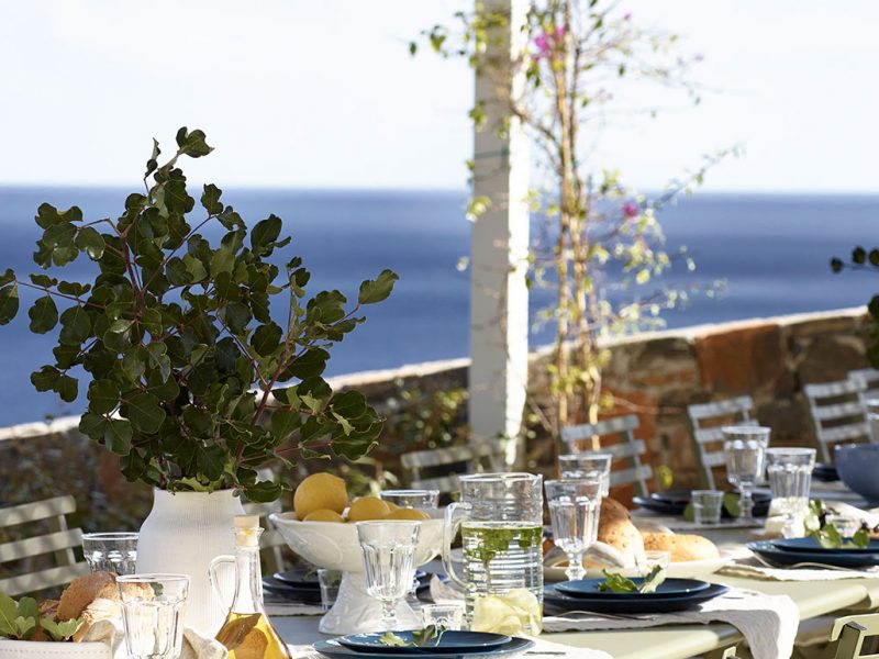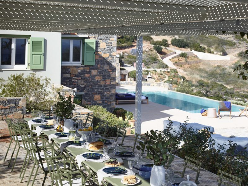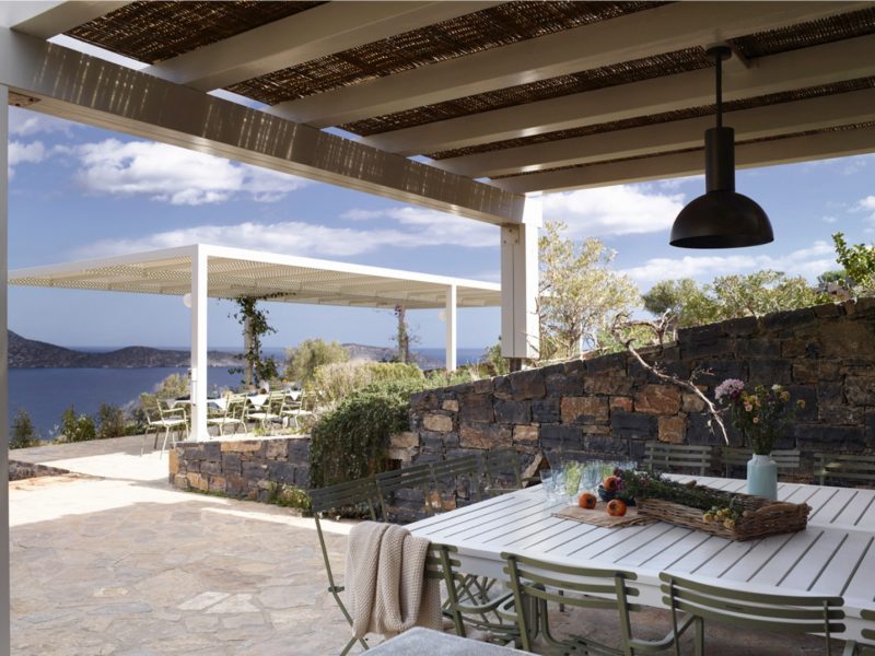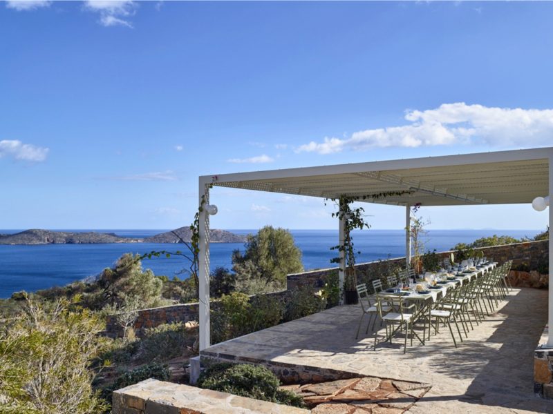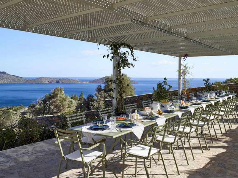 We offer various shaded dining areas in both Villas. This year there is a new lightweight pergola structure. It can seat up to thirty guests at one long dining table and has stunning views of the Mediterranean.