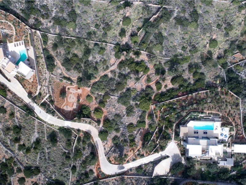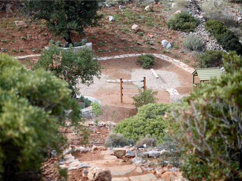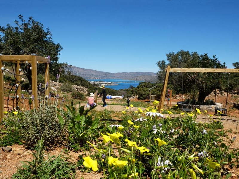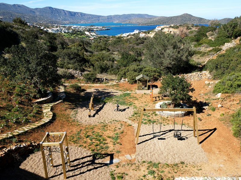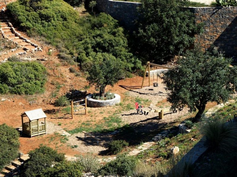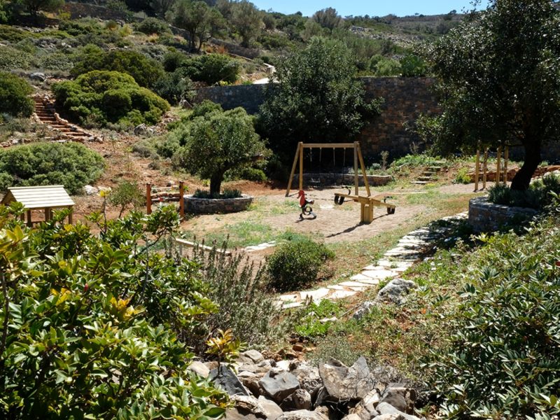 The unique piece of land lays at 13,700 square meters (or 1.37 hectares). It houses two of the most exclusive properties available in Crete. New to the estate this year is a secluded, scenic private playground. All the play equipment there is fabricated from timber in Finland. Within the estate are also various carefully designed paths through the olive trees and local vegetation. This gives you the chance to live in and enjoy the Cretan environment and nature to the fullest.
