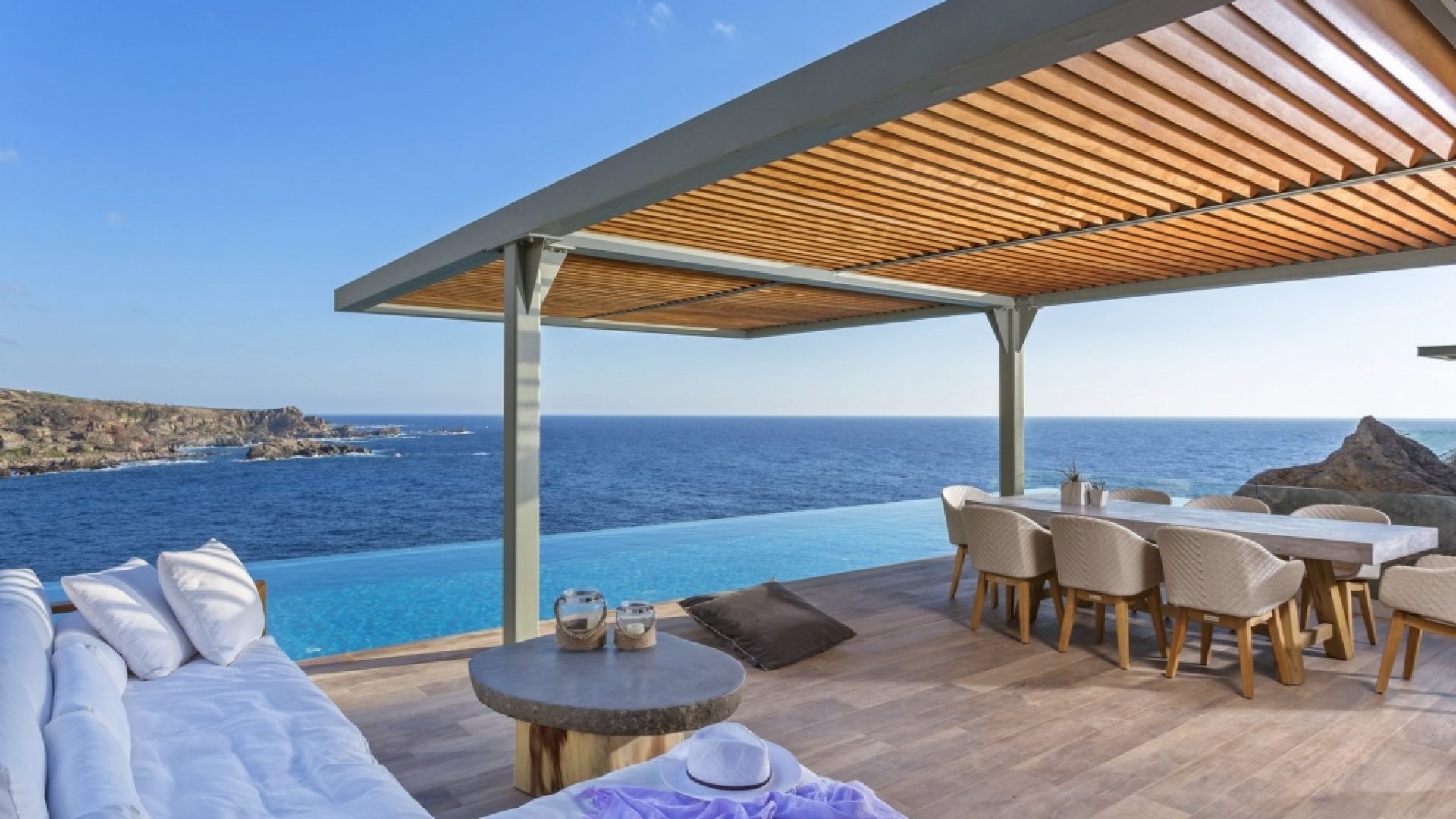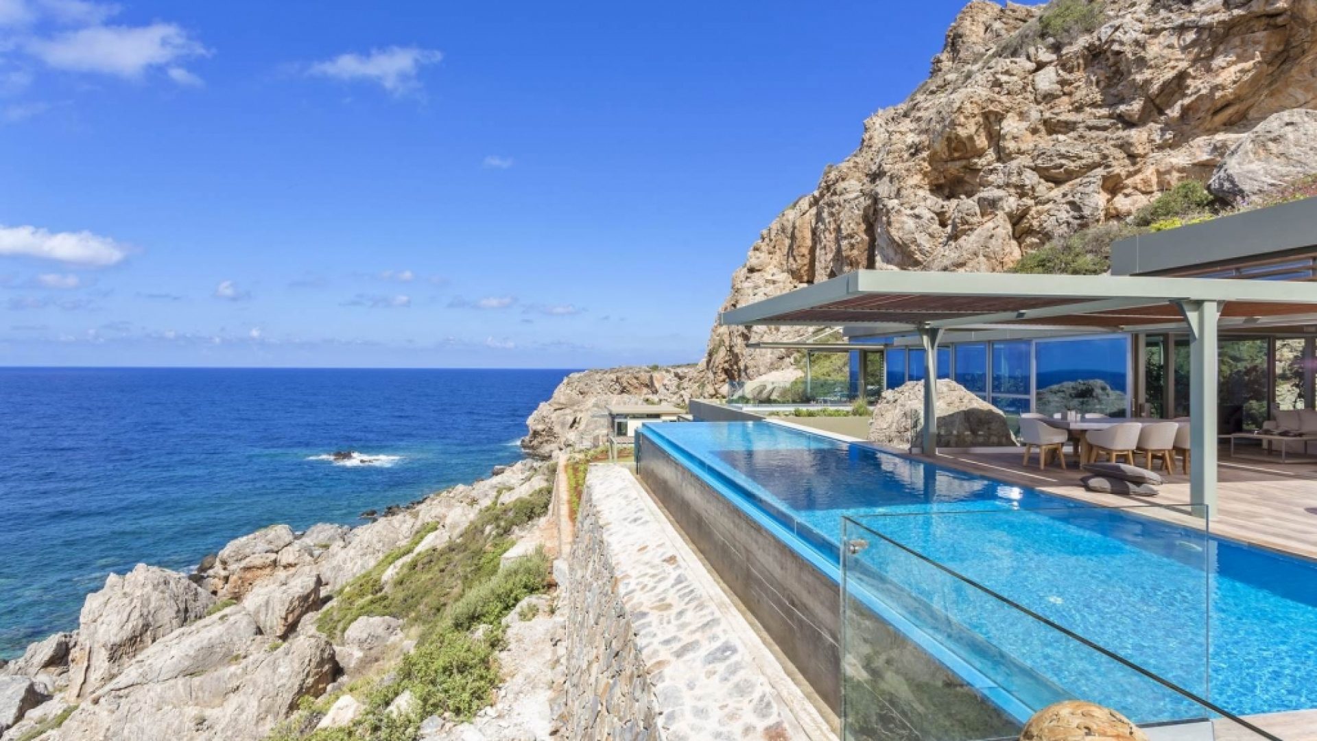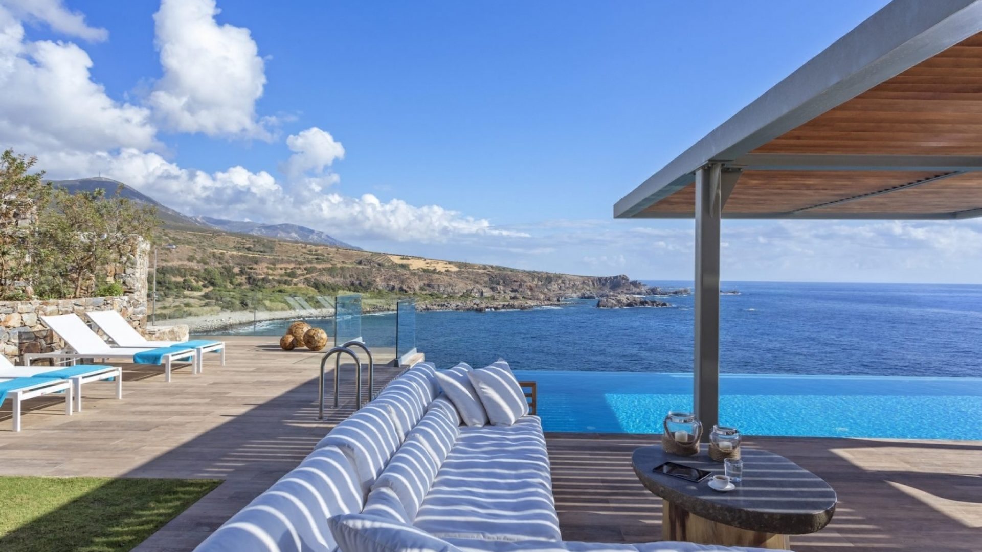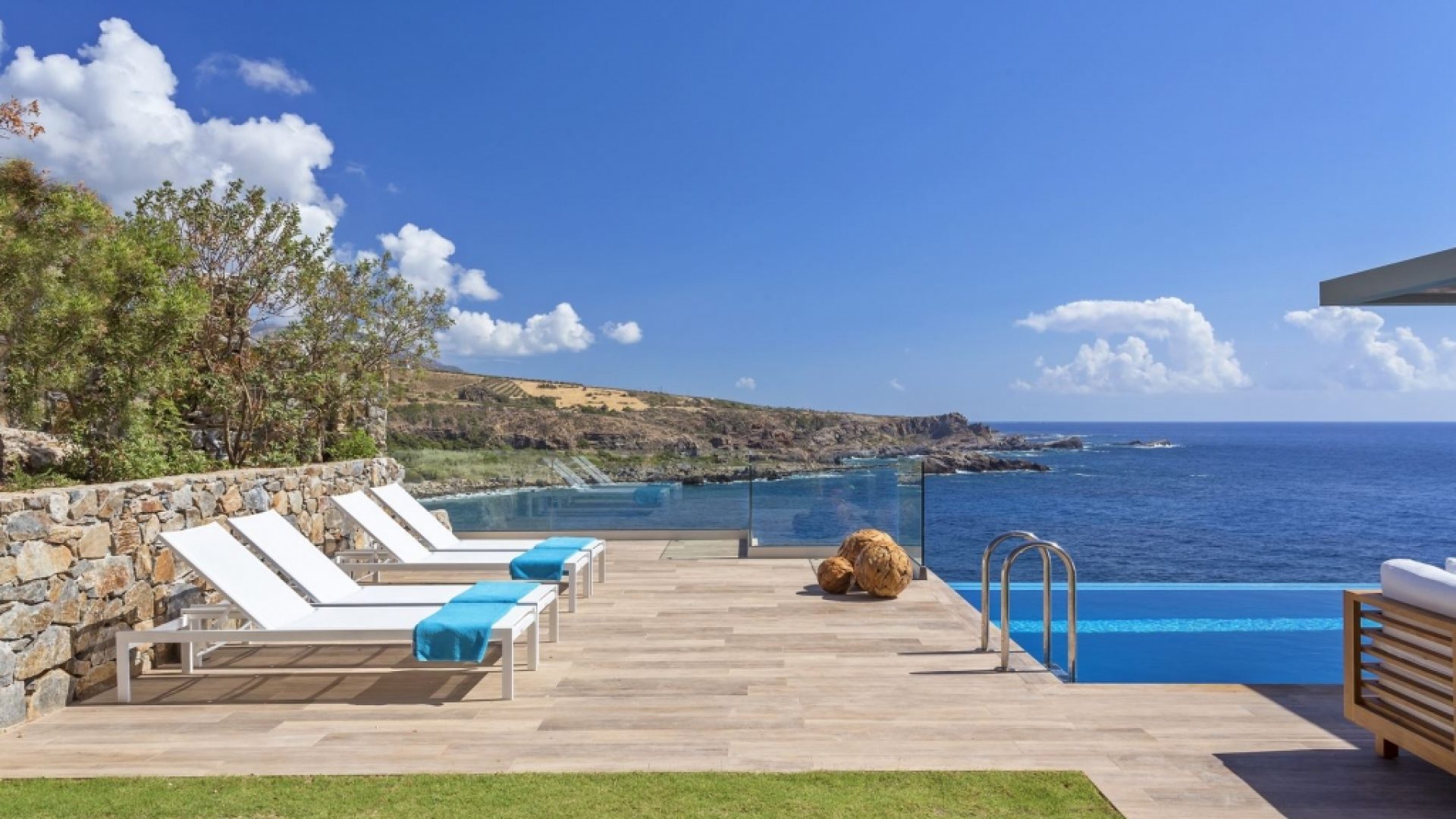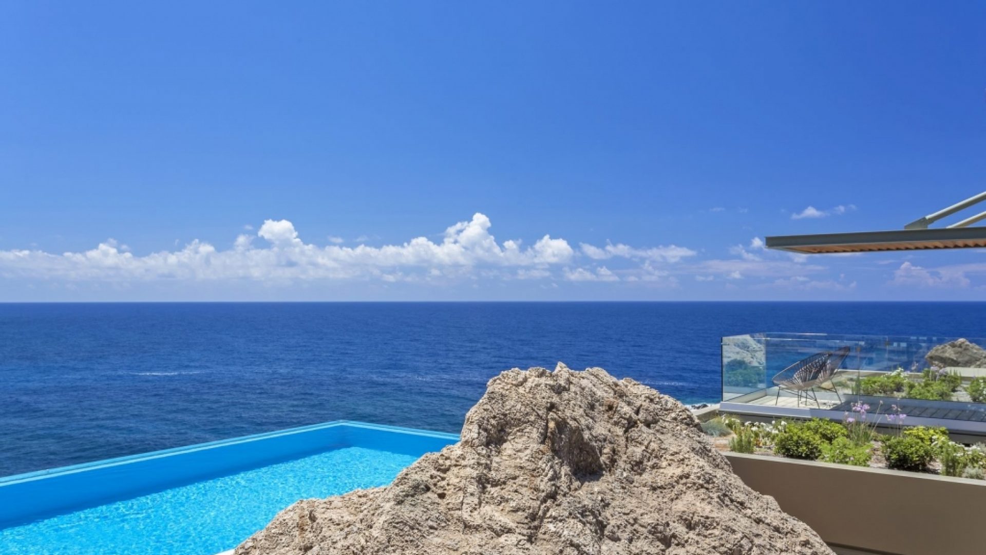 Layering itself down the side of a rocky cliff, the villa is cut into the landscape effortlessly embracing the elements of nature. Details, such as the big rock which has been turned into an element of the structure, or the small waterfall linking the property’s main pool with a plunge pool a level below, create a restful sanctuary of peace and serenity just a stone’s throw from the beach. Meanwhile, the pool’s glass edge makes you feel as though the water flows right into the sea! Throughout the villa guests are encouraged to indulge in a joyful sense of harmony, which appeals to devotees of the Cretan spirit.