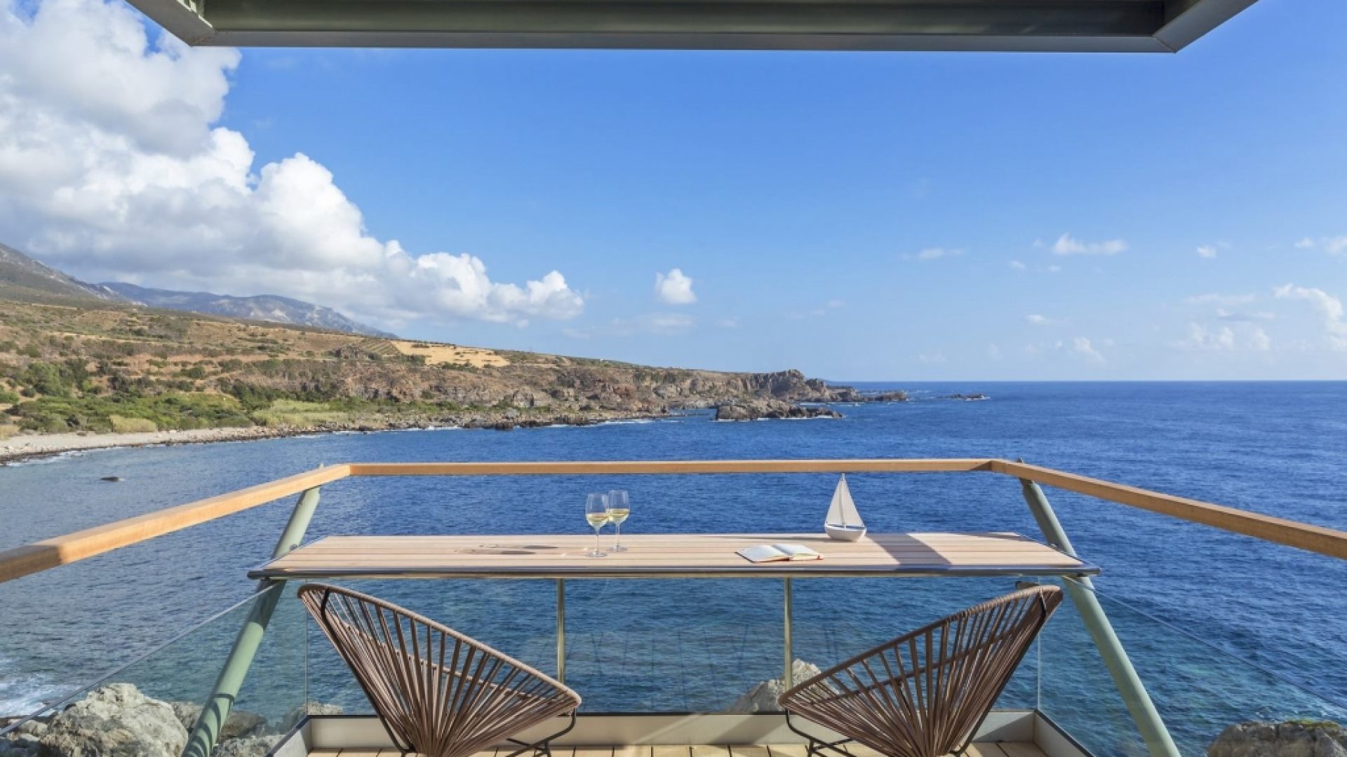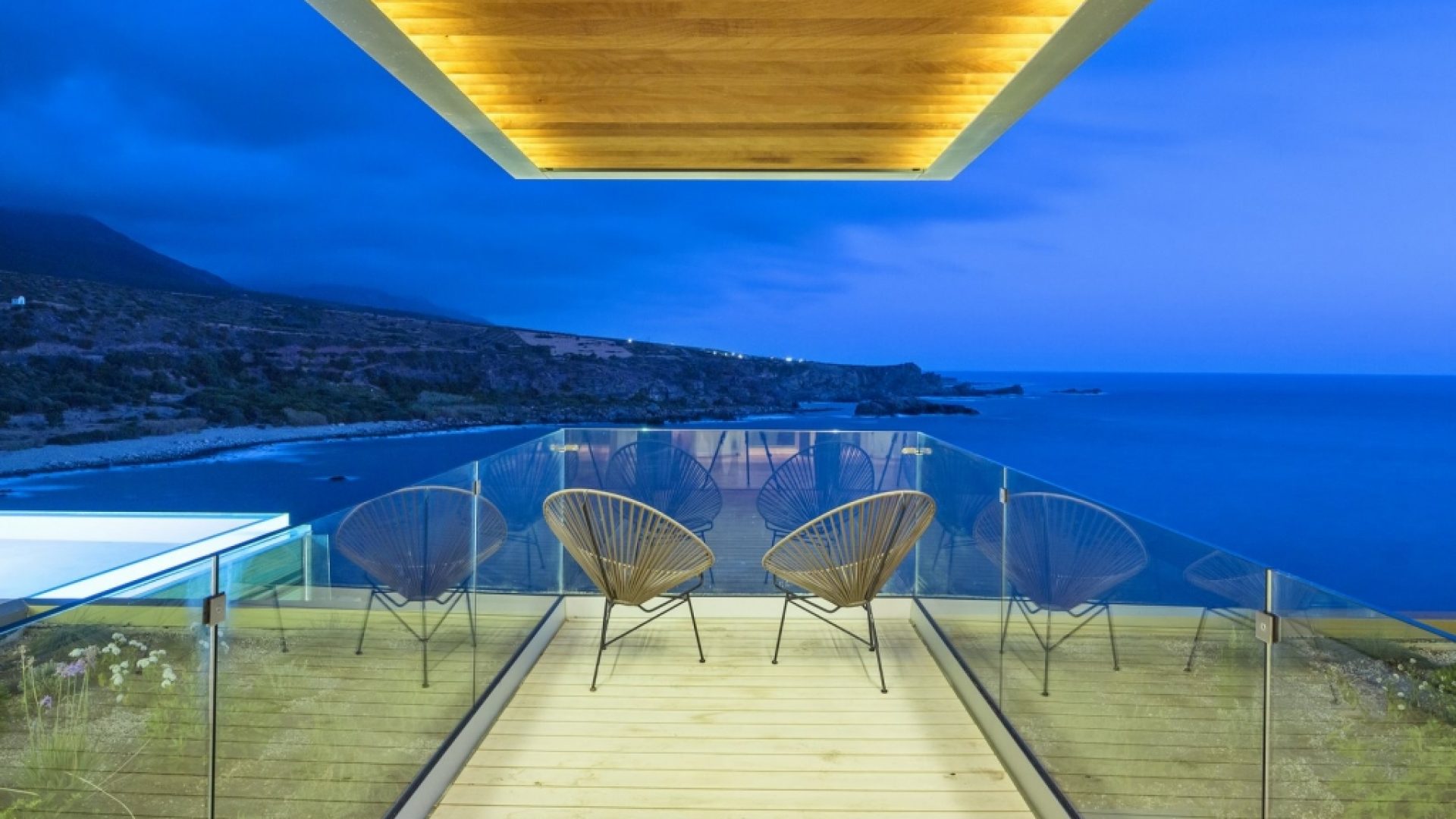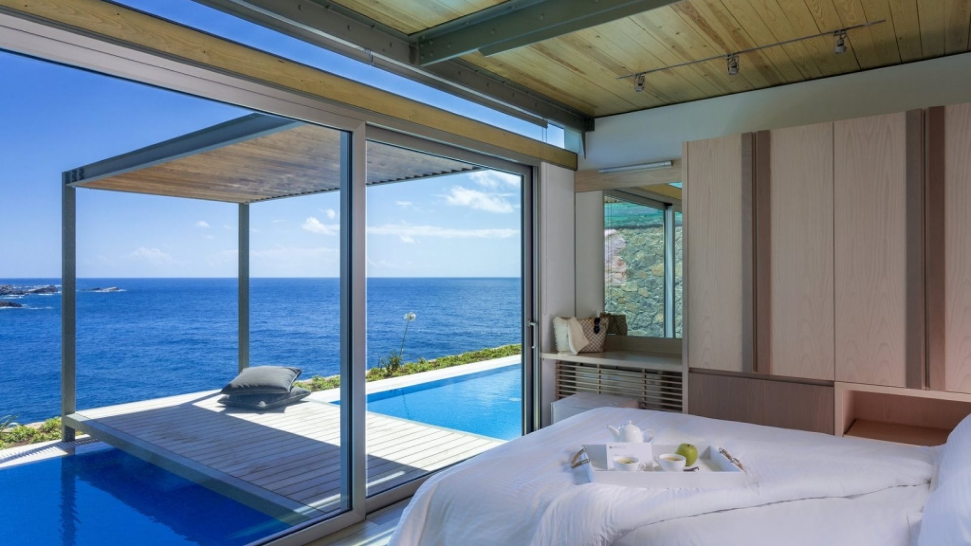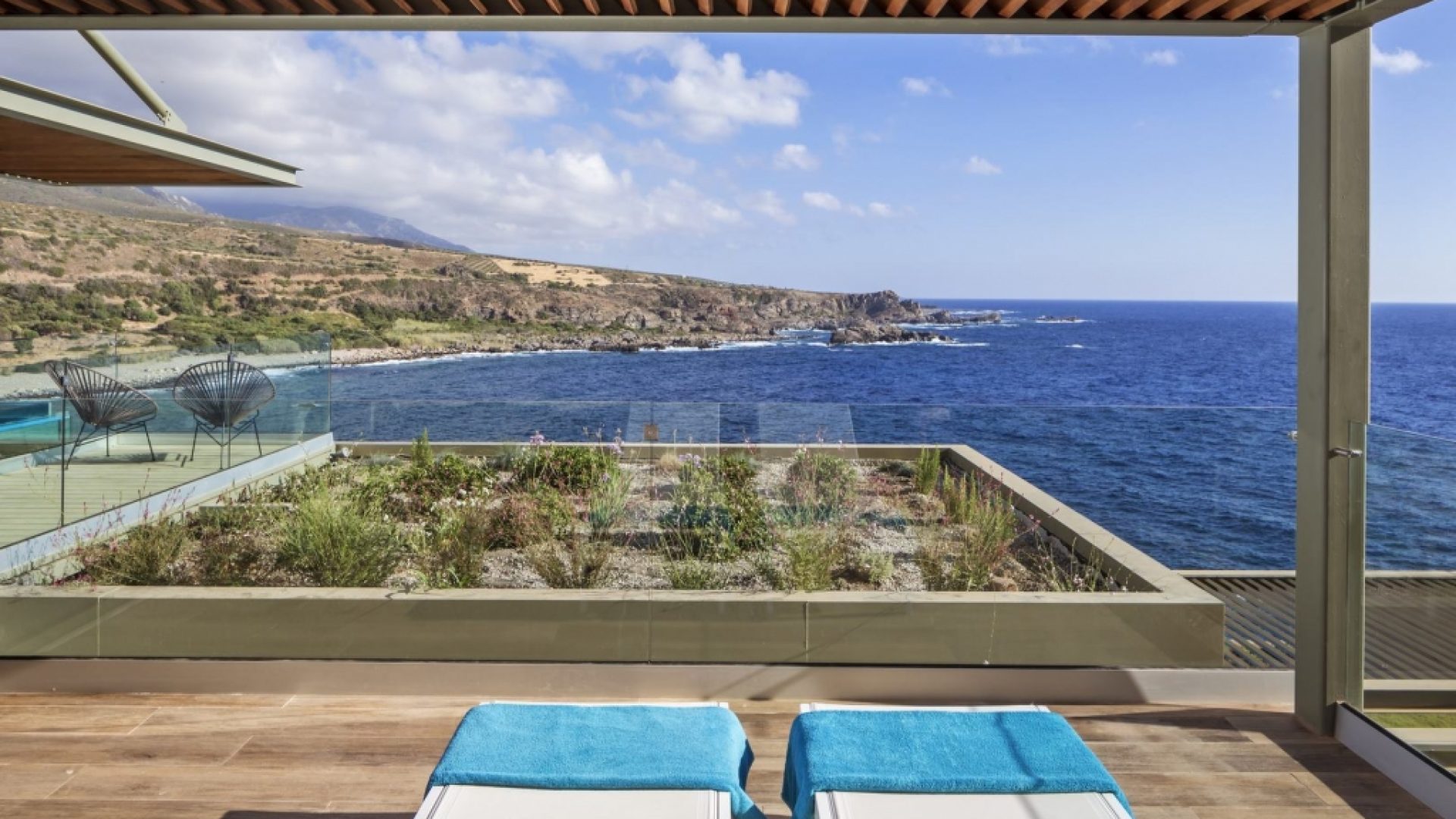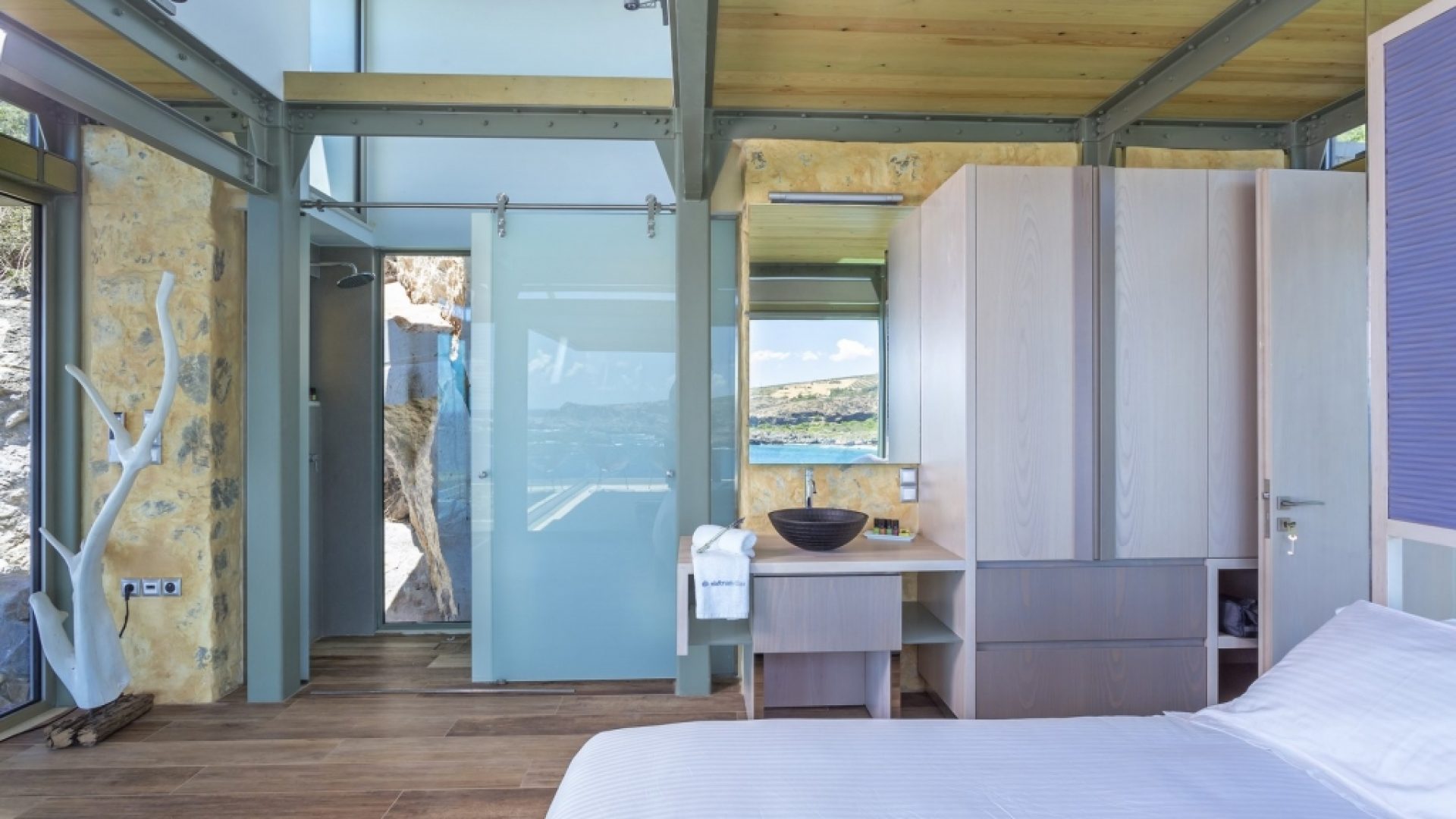The entire property has been designed to blur the boundaries between the building and its stunning natural surroundings. Completely stripped of any superfluous décor, emphasizing the vista across the rugged coastline of Crete, the ever-so-cool monochrome interiors blend harmoniously with the rough, wild Cretan landscape. Wooden floors and minimalist furnishing in light wood paired with glass walls, steel and rock elements offer a twist that allows guests to remain focused on the views.