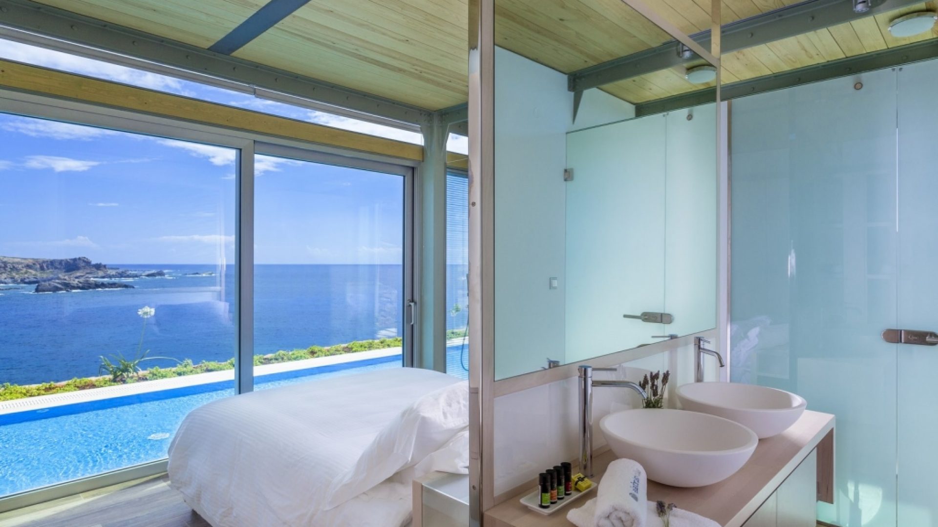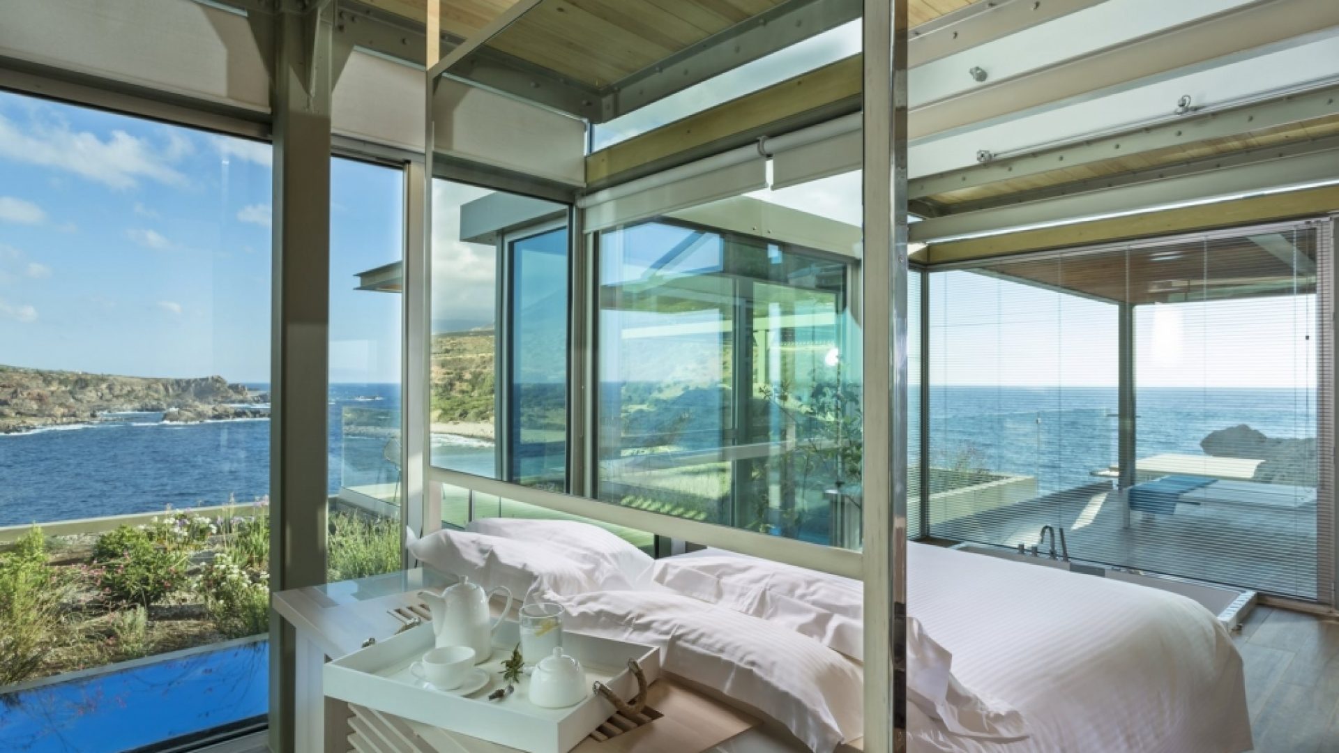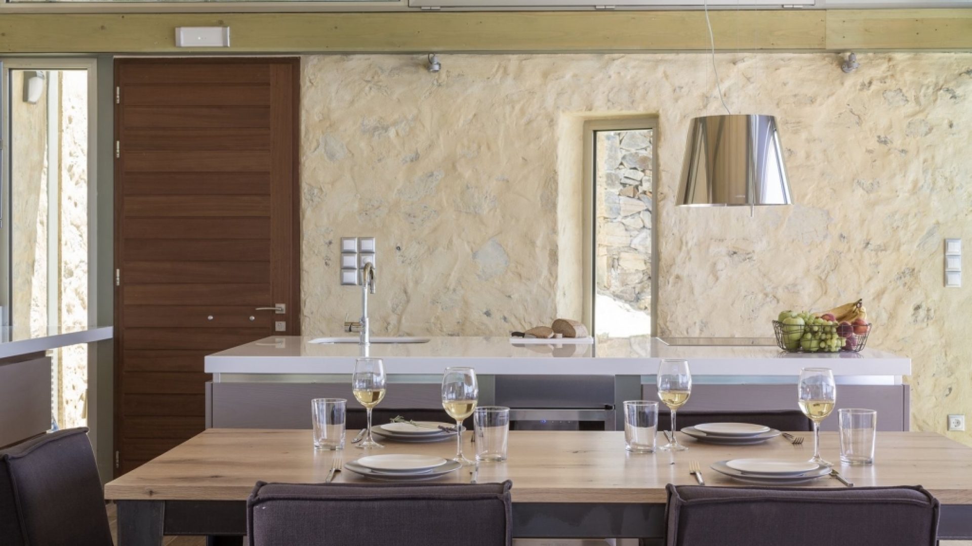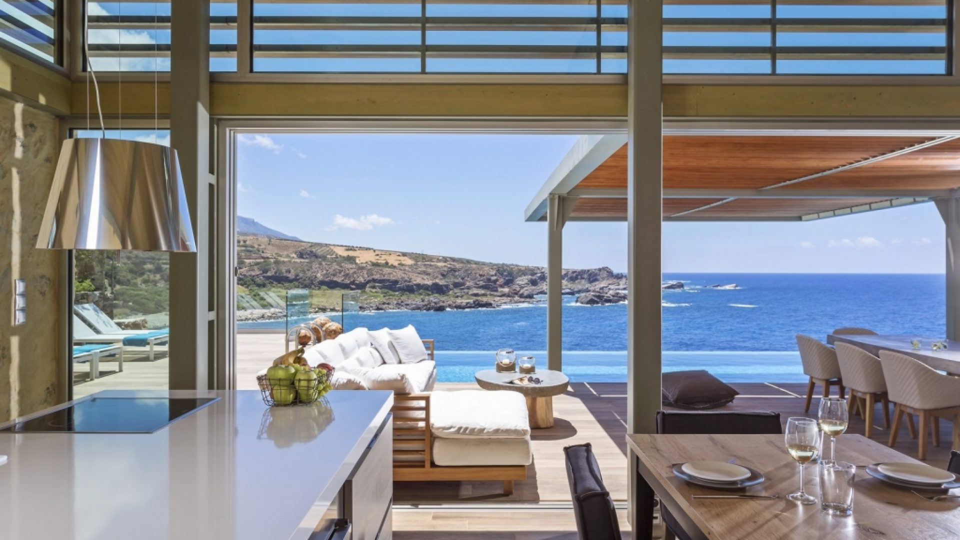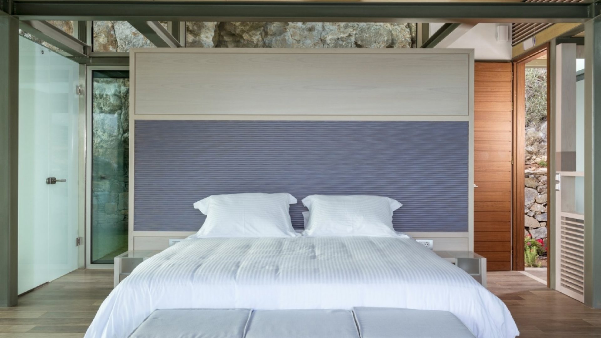 The entire property has been designed to blur the boundaries between the building and its stunning natural surroundings. Completely stripped of any superfluous décor, emphasizing the vista across the rugged coastline of Crete, the ever-so-cool monochrome interiors blend harmoniously with the rough, wild Cretan landscape. Wooden floors and minimalist furnishing in light wood paired with glass walls, steel and rock elements offer a twist that allows guests to remain focused on the views.