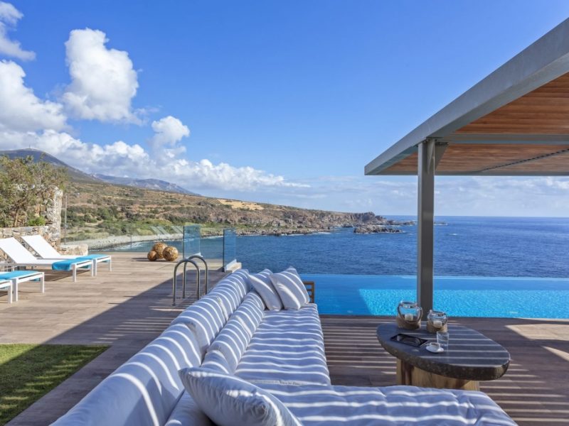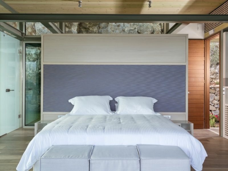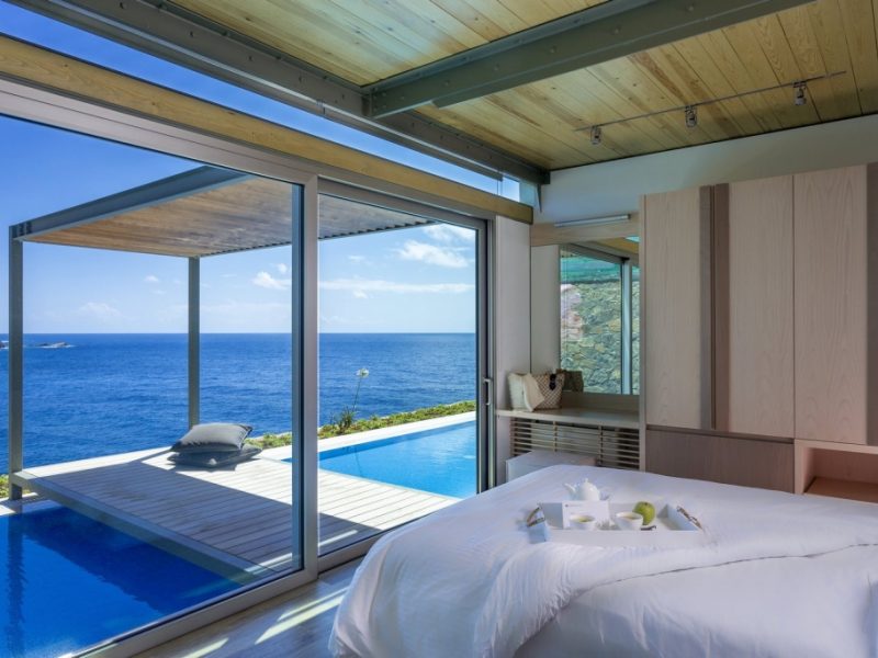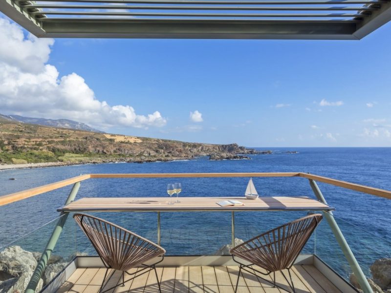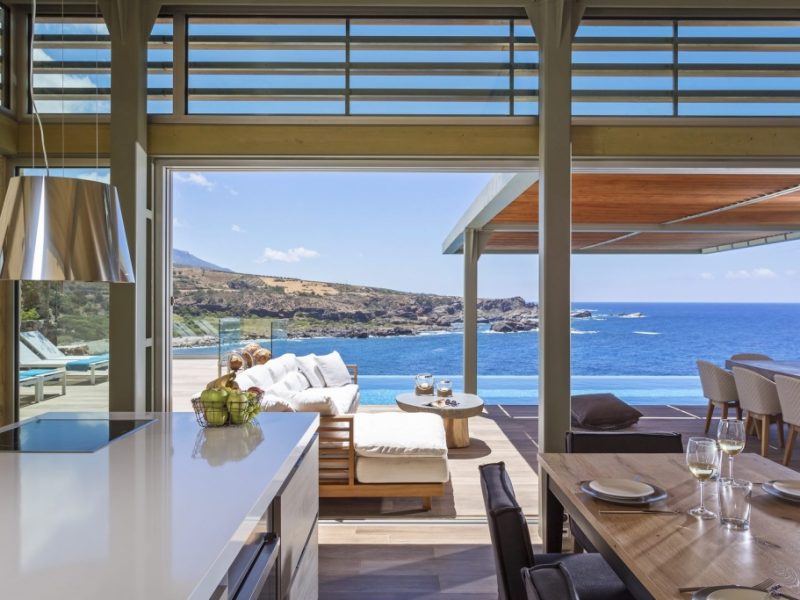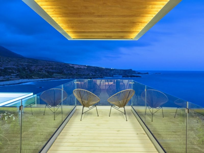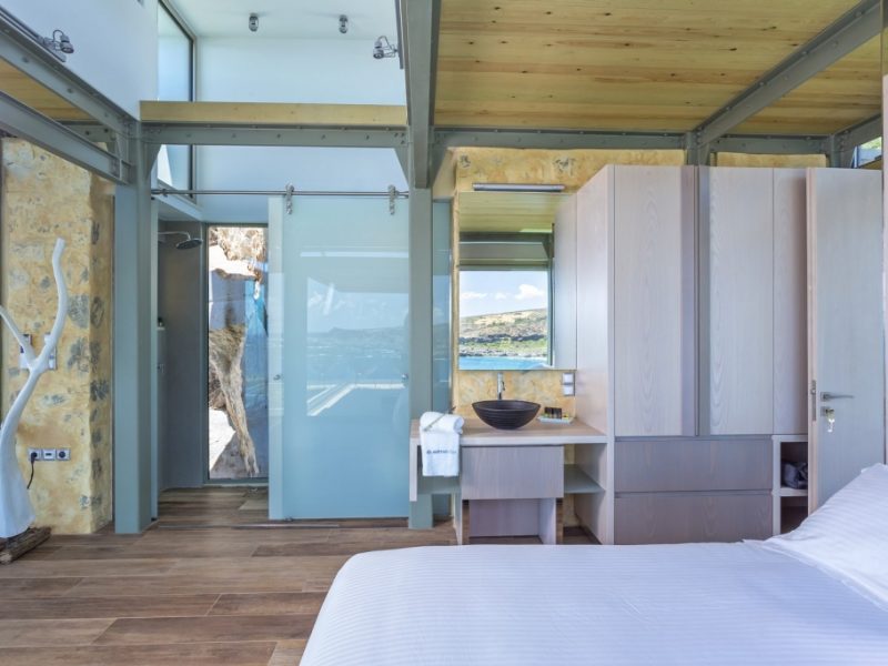 The entire property has been designed to blur the boundaries between the building and its stunning natural surroundings. Completely stripped of any superfluous décor, emphasizing the vista across the rugged coastline of Crete, the ever-so-cool monochrome interiors blend harmoniously with the rough, wild Cretan landscape. Wooden floors and minimalist furnishing in light wood paired with glass walls, steel and rock elements offer a twist that allows guests to remain focused on the views.