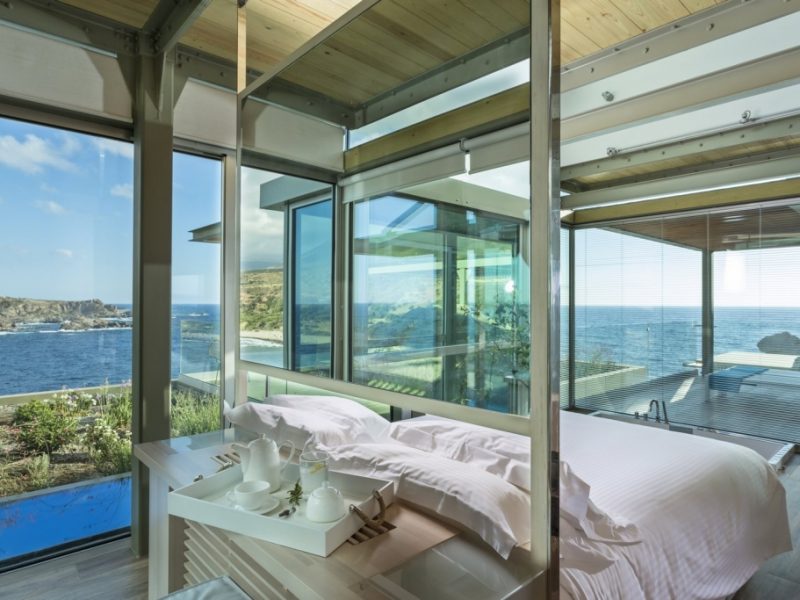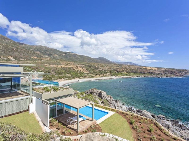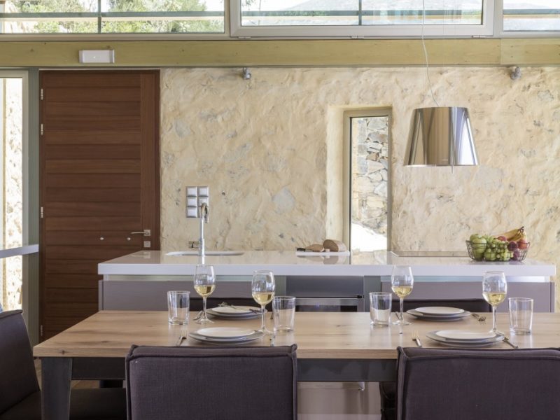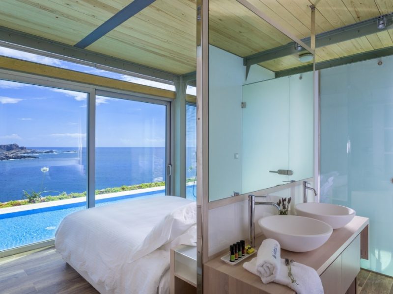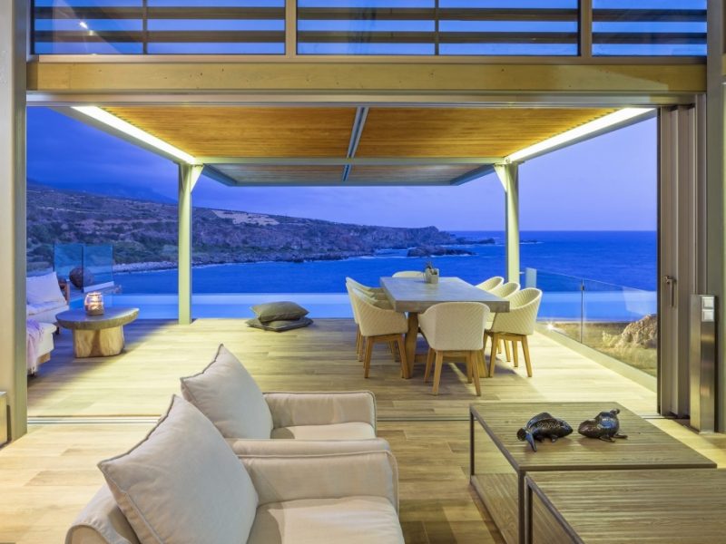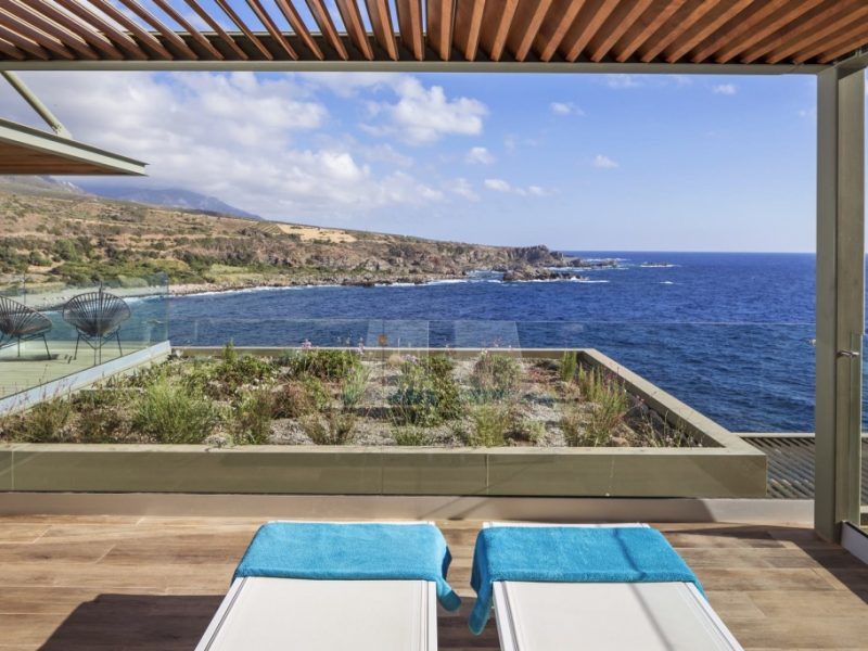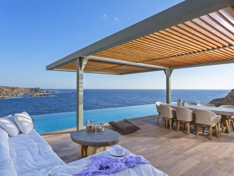 The entire property has been designed to blur the boundaries between the building and its stunning natural surroundings. Completely stripped of any superfluous décor, emphasizing the vista across the rugged coastline of Crete, the ever-so-cool monochrome interiors blend harmoniously with the rough, wild Cretan landscape. Wooden floors and minimalist furnishing in light wood paired with glass walls, steel and rock elements offer a twist that allows guests to remain focused on the views.