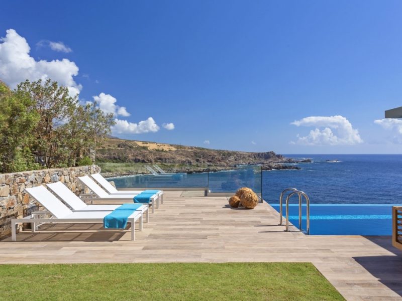 Layering itself down the side of a rocky cliff, the villa is cut into the landscape effortlessly embracing the elements of nature. Details, such as the big rock which has been turned into an element of the structure, or the small waterfall linking the property’s main pool with a plunge pool a level below, create a restful sanctuary of peace and serenity just a stone’s throw from the beach. Meanwhile, the pool’s glass edge makes you feel as though the water flows right into the sea! Throughout the villa guests are encouraged to indulge in a joyful sense of harmony, which appeals to devotees of the Cretan spirit.