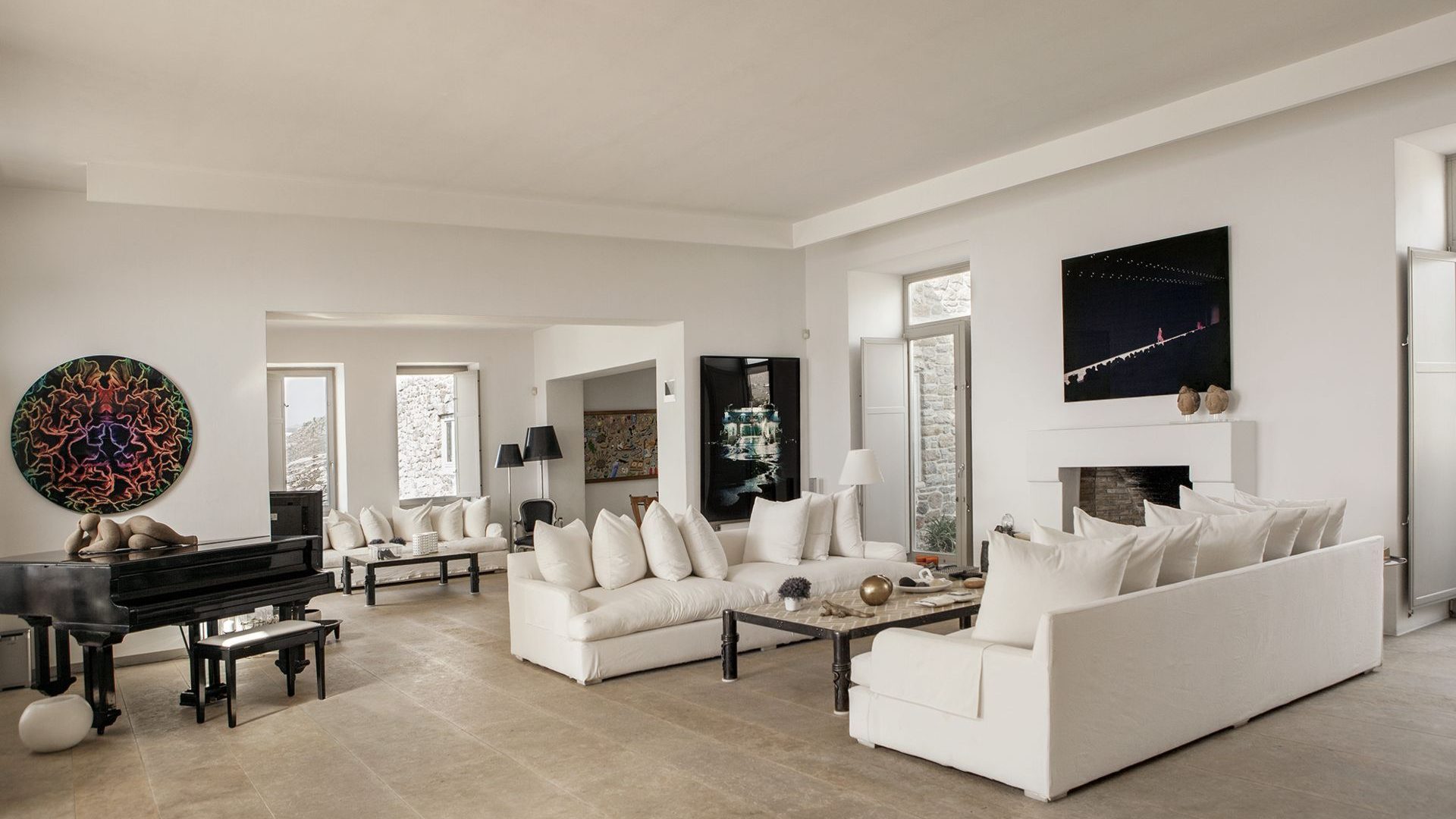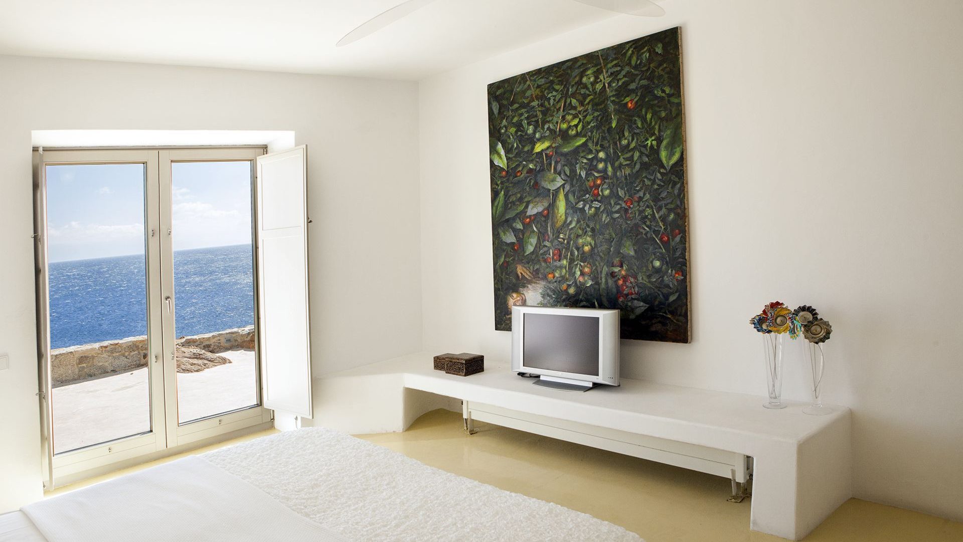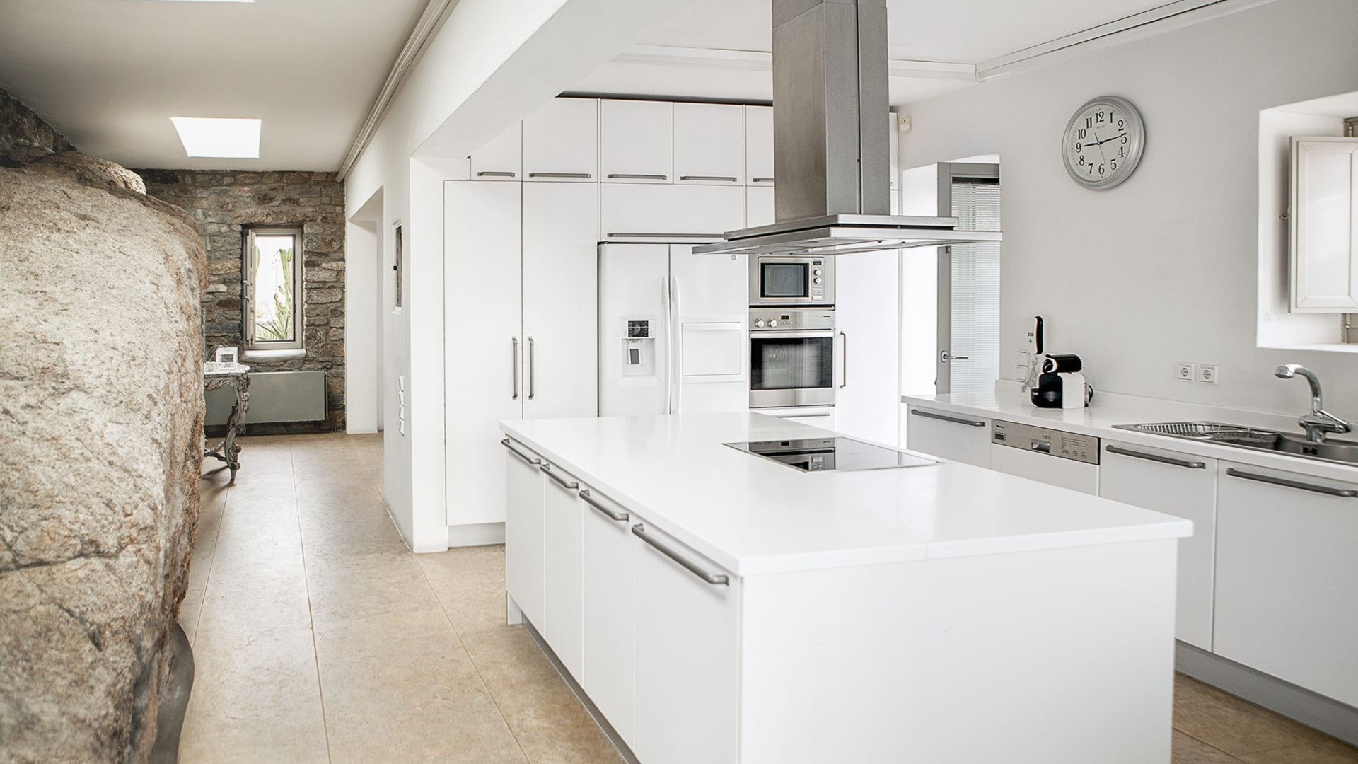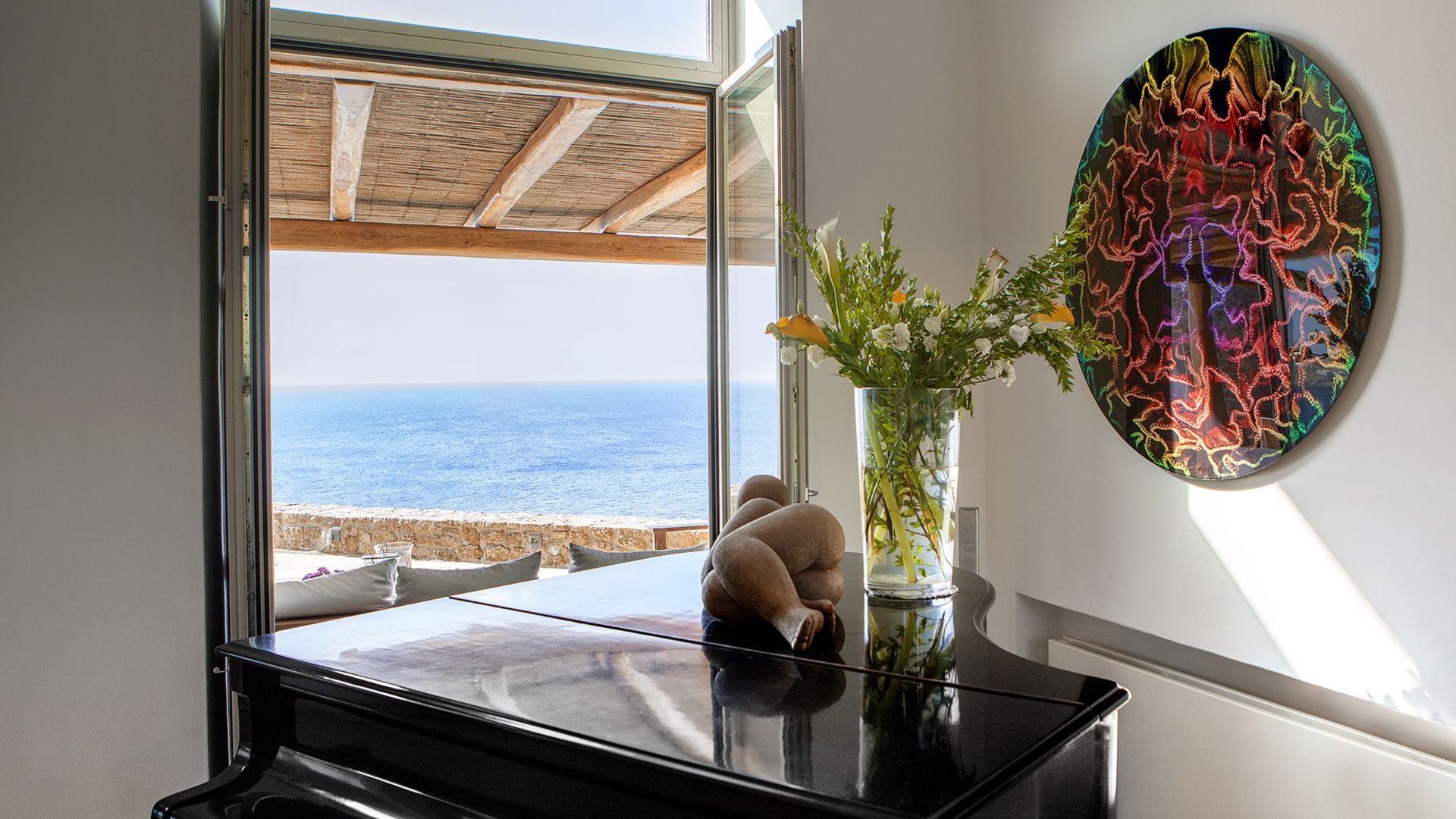 The property has a beautiful contemporary décor with an impressive collection of artworks. Big rocks of the existing natural environment blend in with the all-white modern kitchen area and the formal dining area. Big French style doors open directly to the outdoor dining area and the luxurious front pool terrace. The bedrooms are situated in two levels of the property. The master bedroom also has a unique cave-like shower bathroom. All bedrooms have access to the pool terrace and have magical extensive sea views both indoors and outdoors.