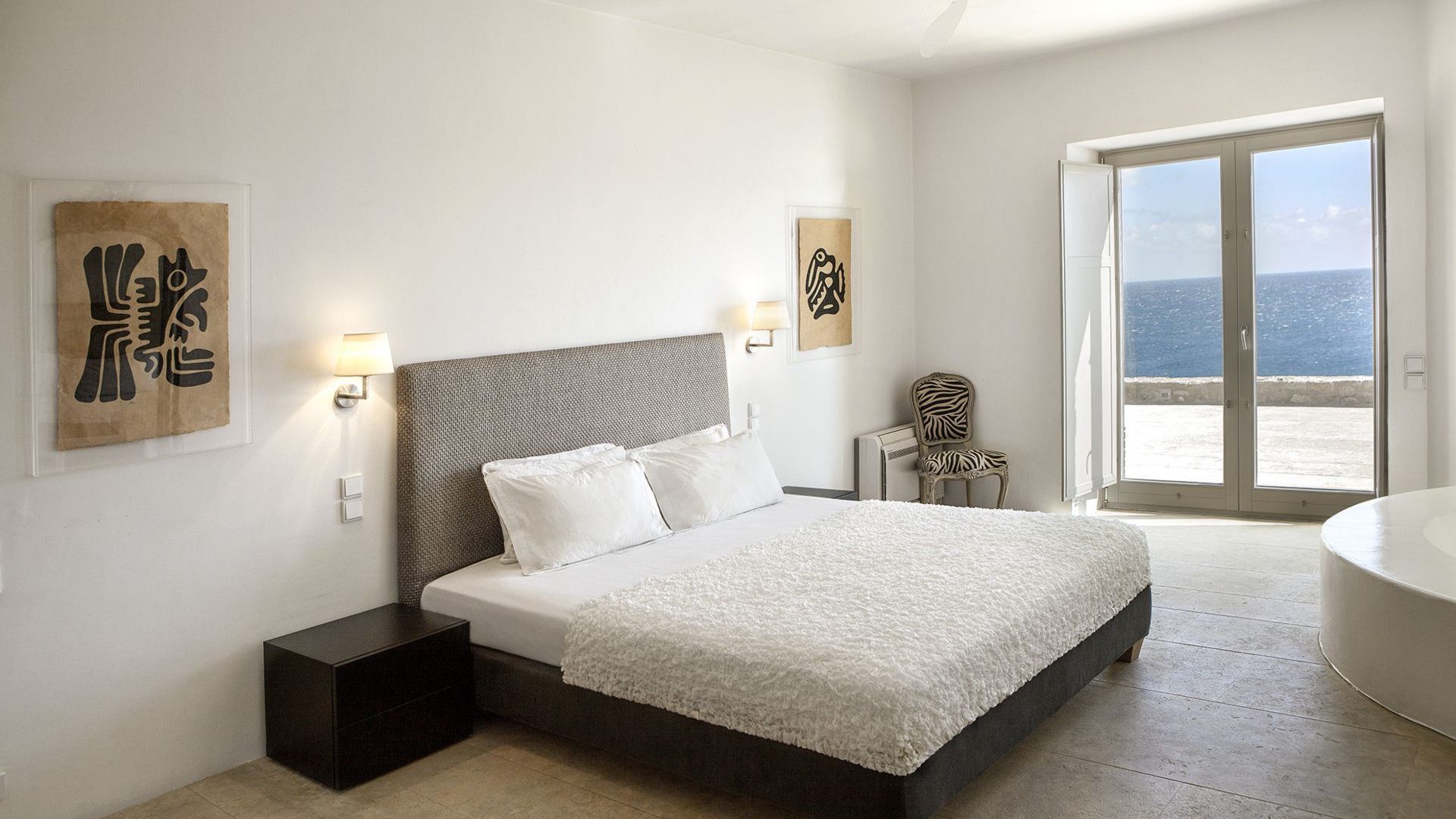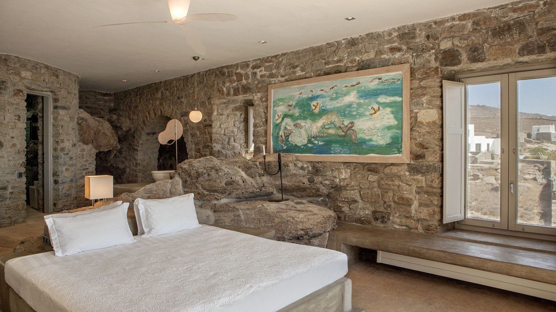 1 Master Bedroom with double bed, A/C, en-suite open bathroom with shower surrounded with natural rocks, direct access to terrace and pool area via French doors, sea view.