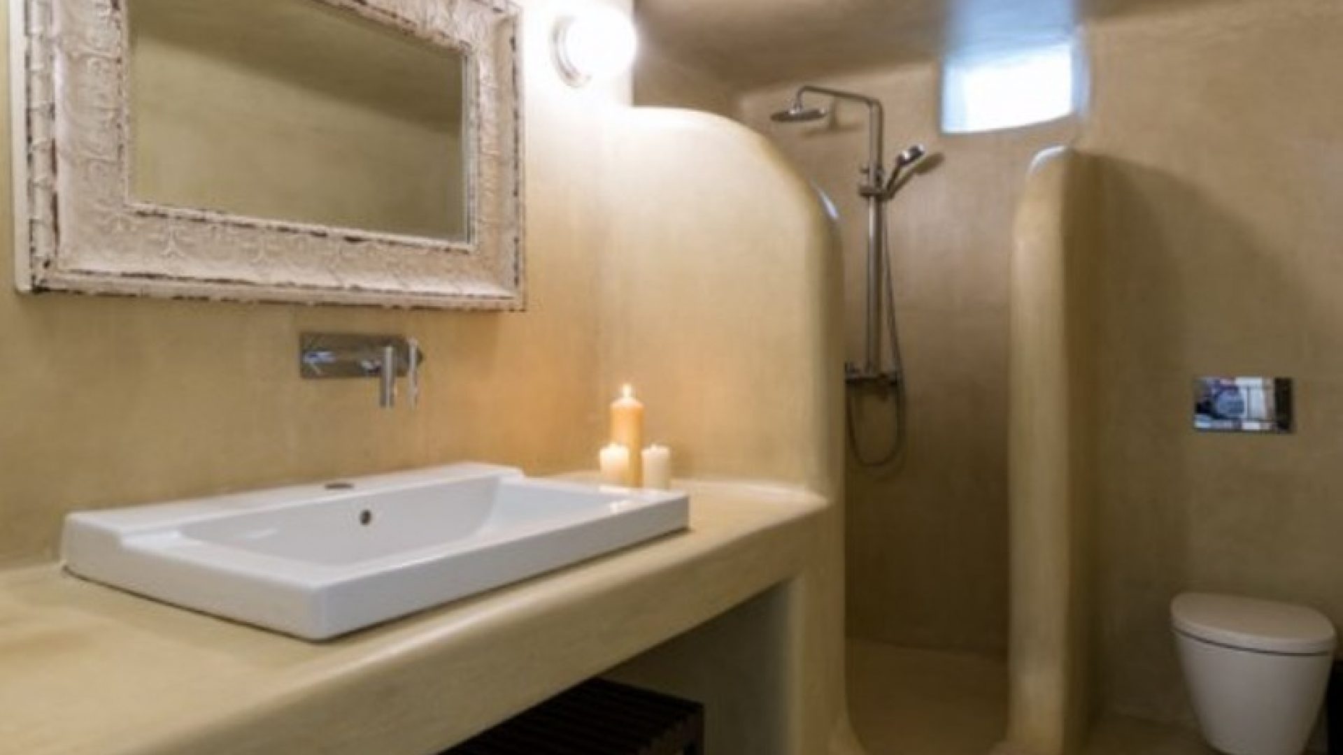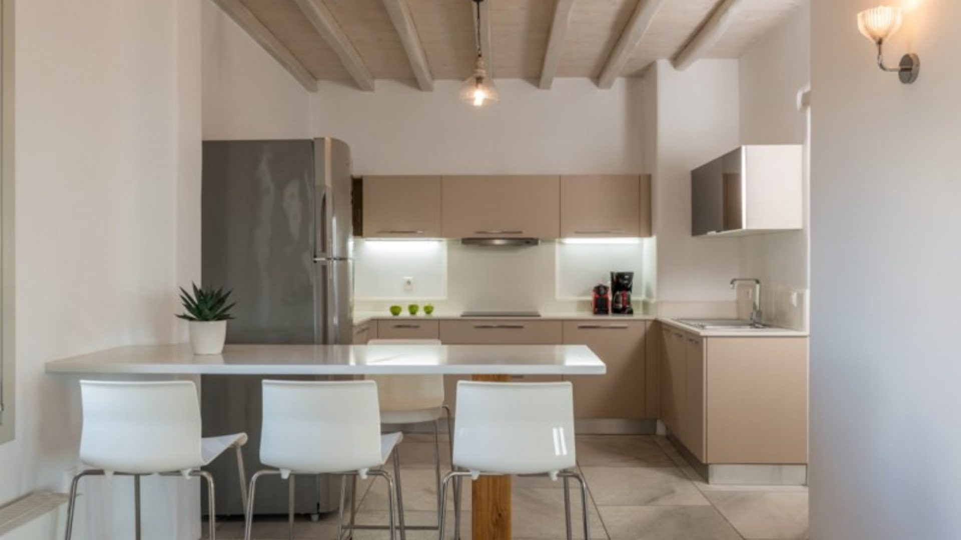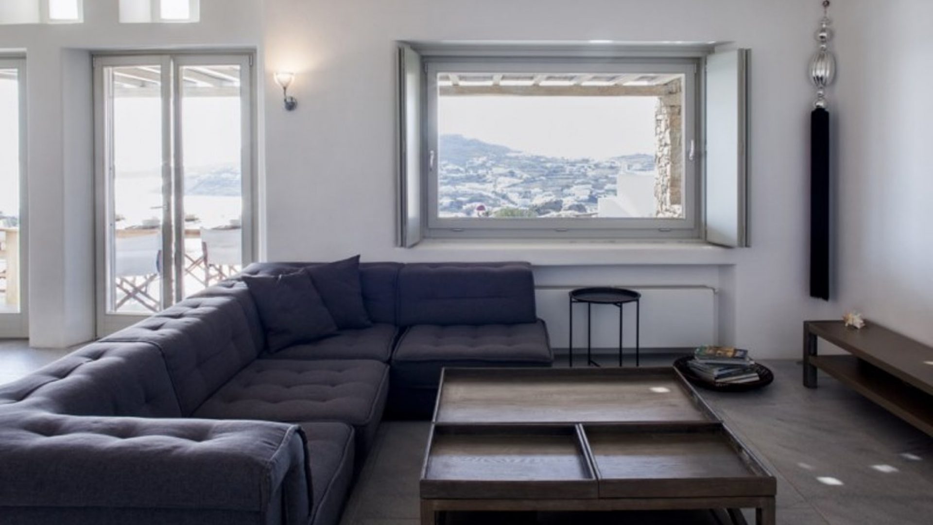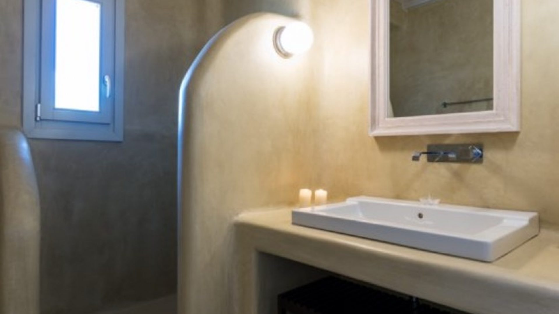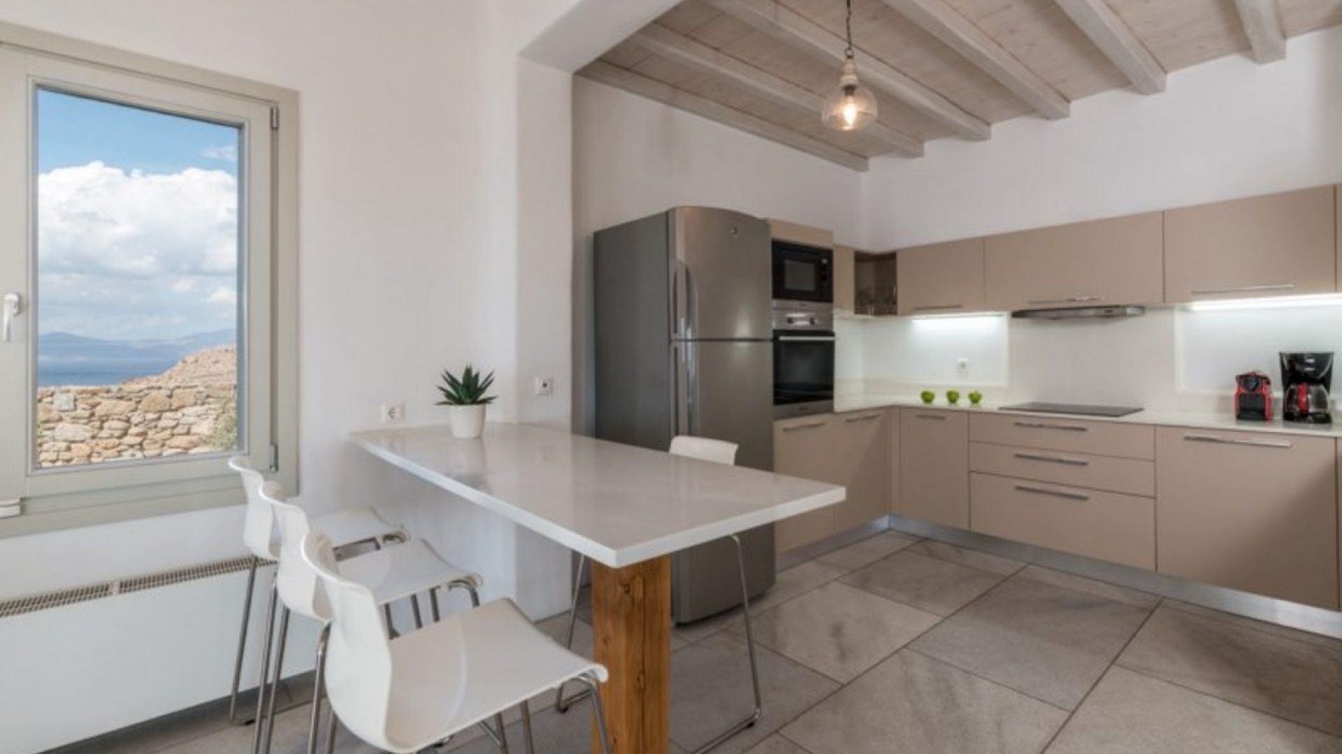 Indoor and outdoor luxury is foremost in these villas to delight in Mykonos style. The grand covered outdoor terrace commands a spectacular view which you can enjoy seating in the outdoor dining area or conversation in the comfortable outdoor living area. Inside, enjoy casual snacks or morning coffee at the breakfast table next to the modern kitchen.