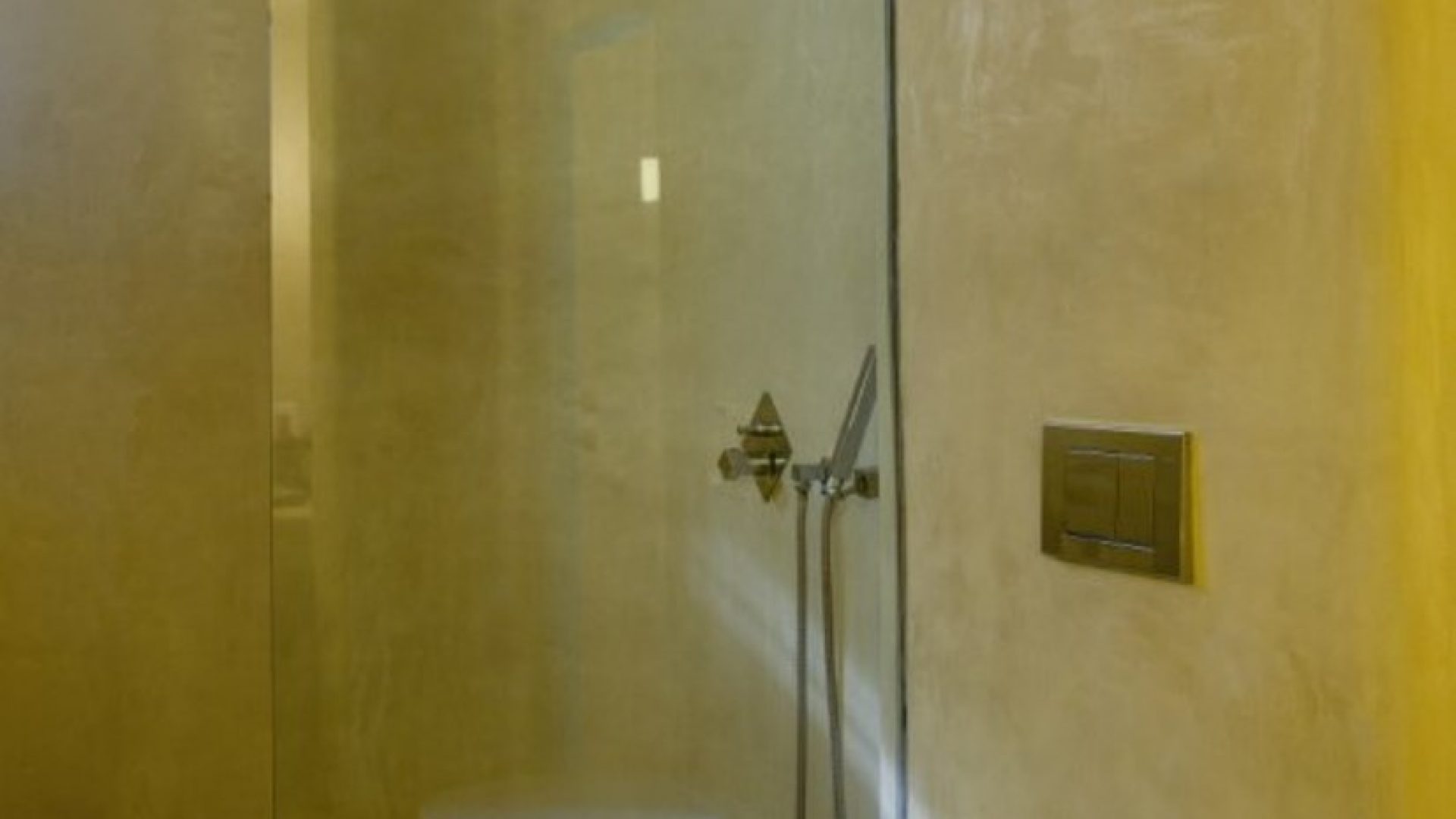 Stairs lead to the ground floor which consists of a vast (60 sq.m) Queen Size master bedroom with an additional sofa bed and en suite bathroom. French doors lead to the private patio of the room