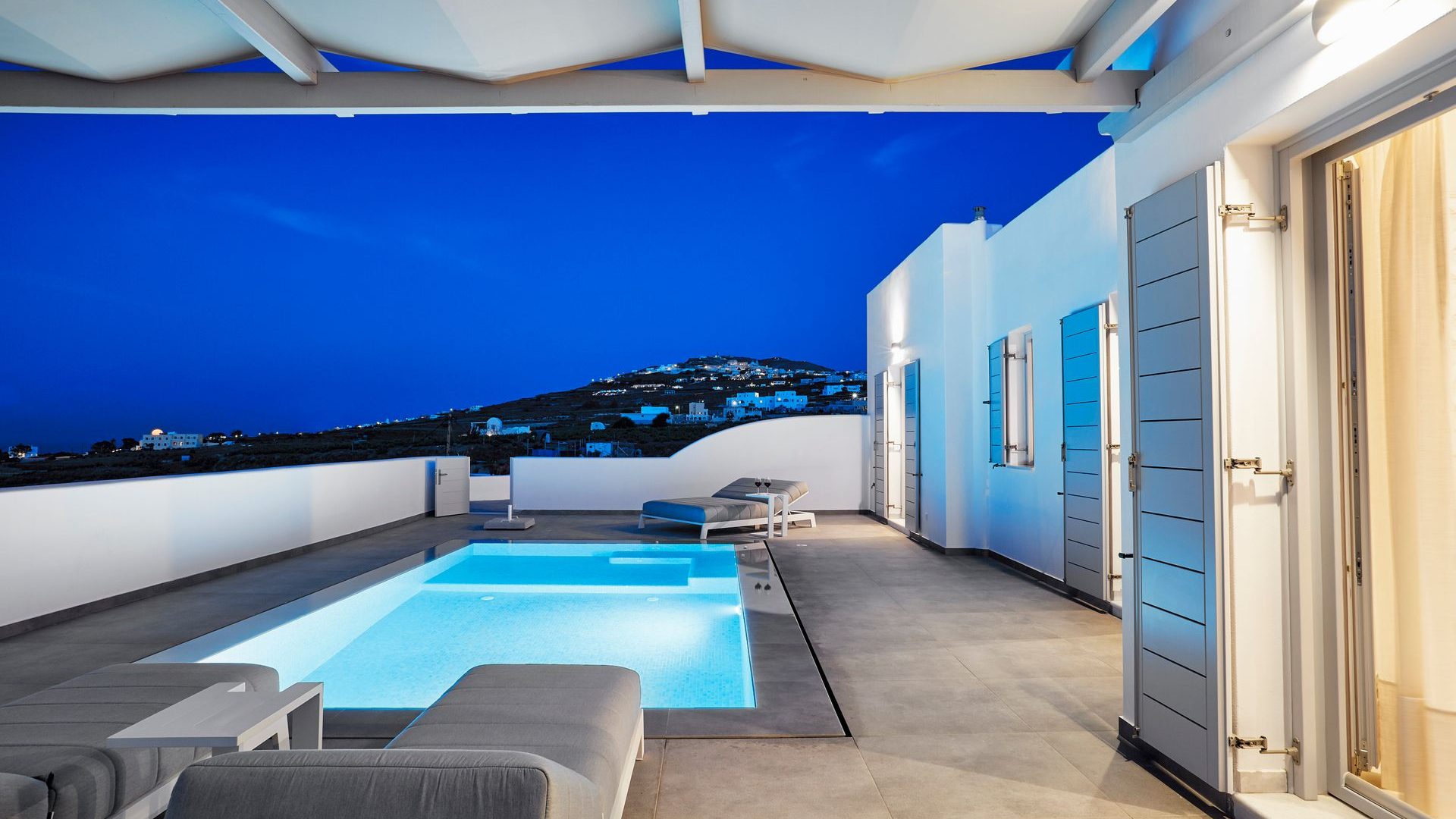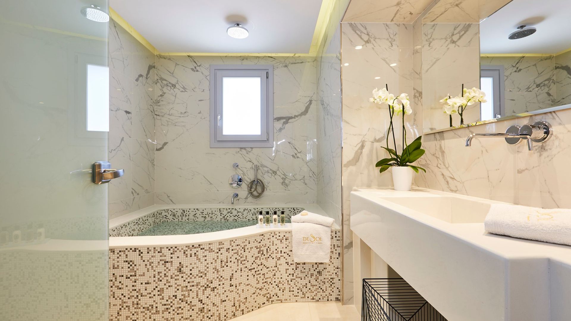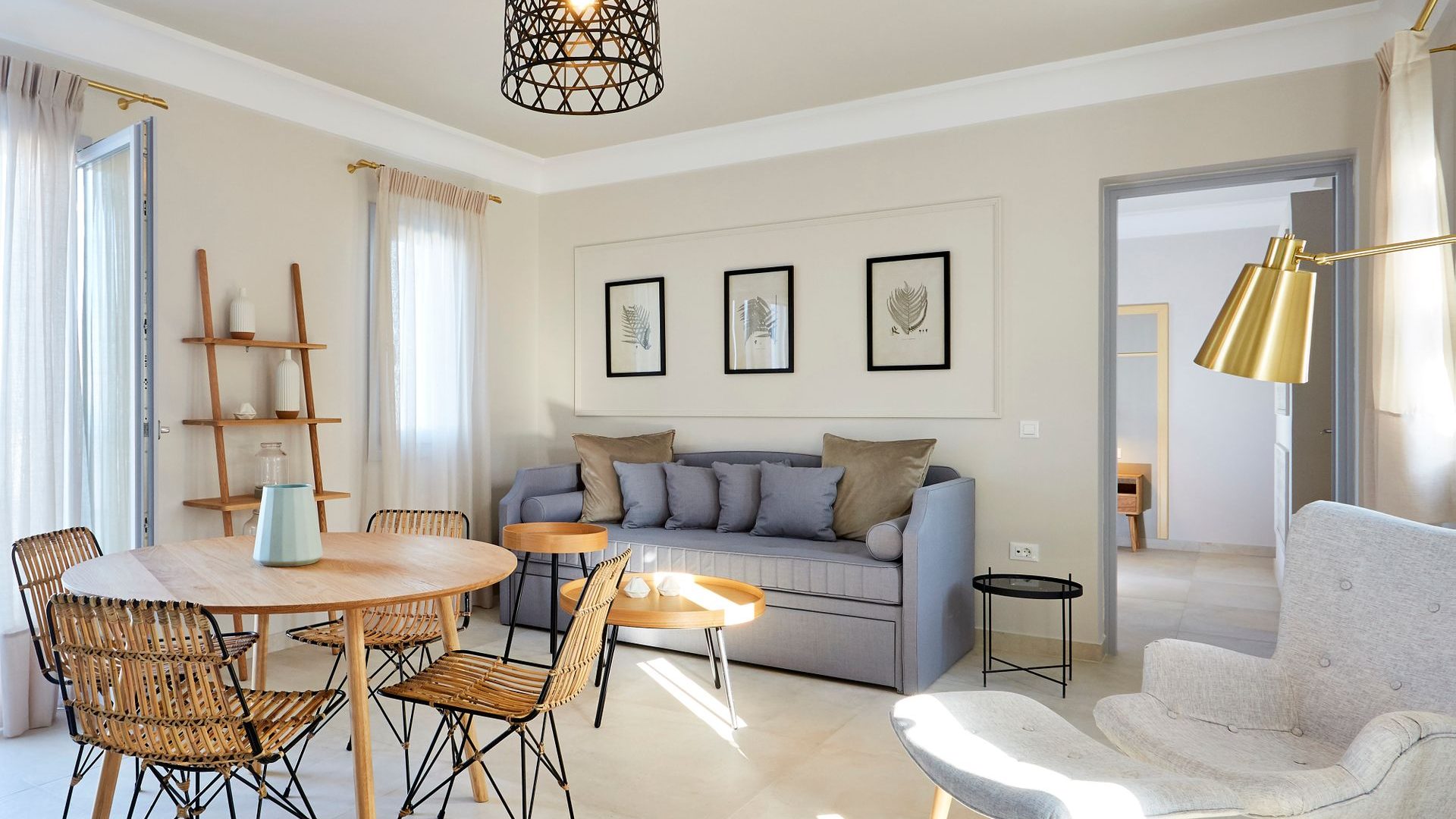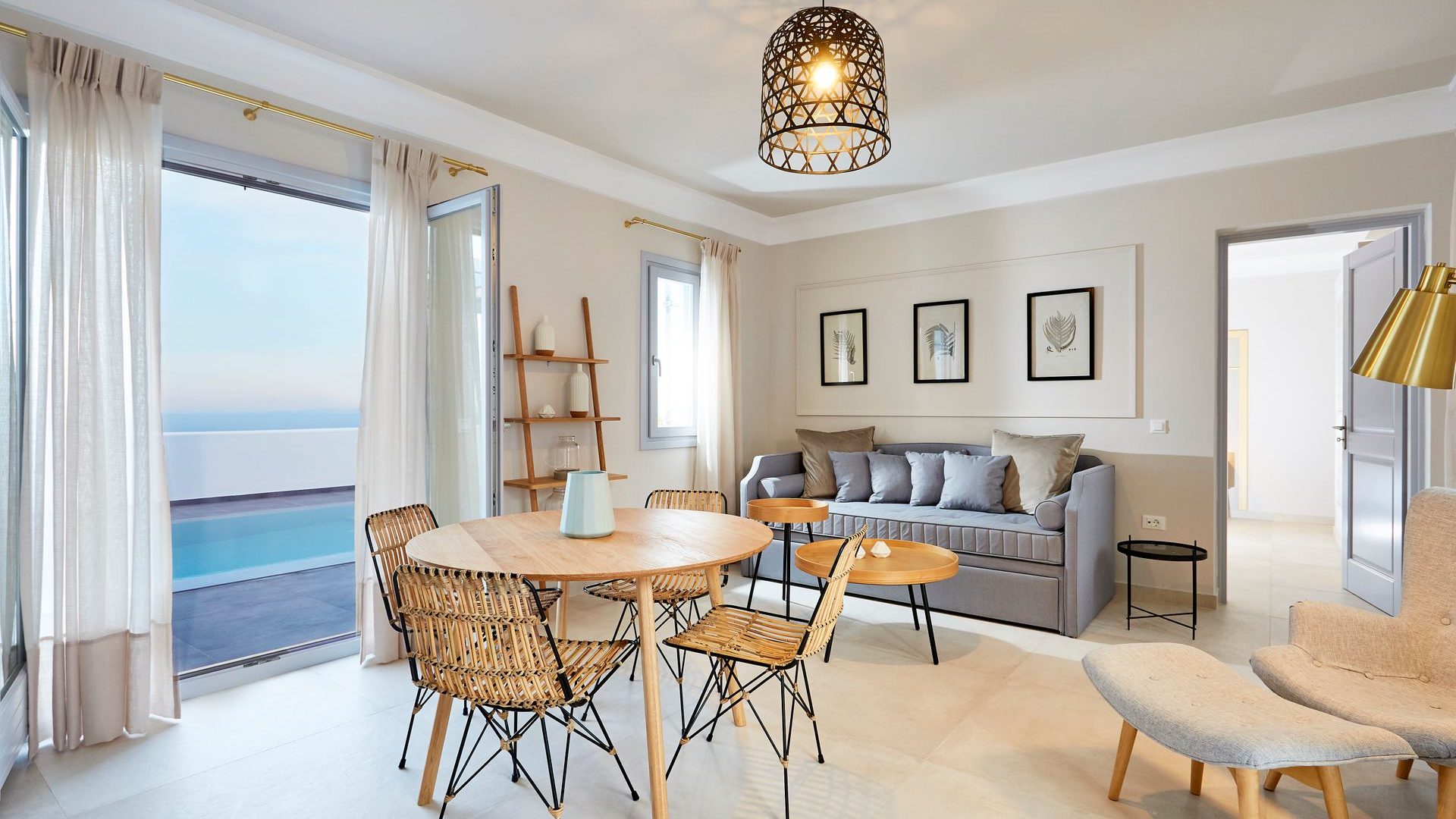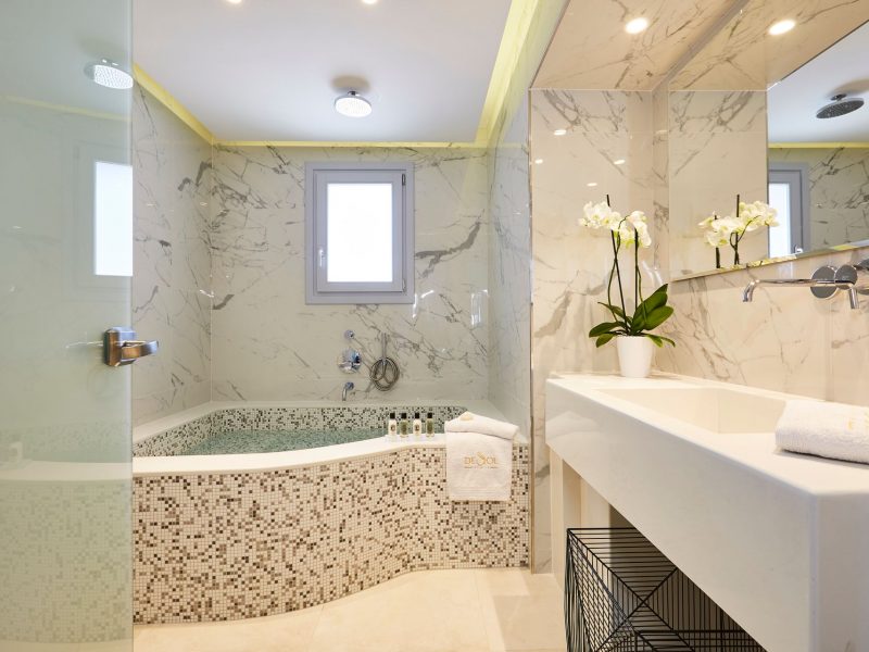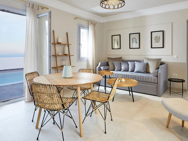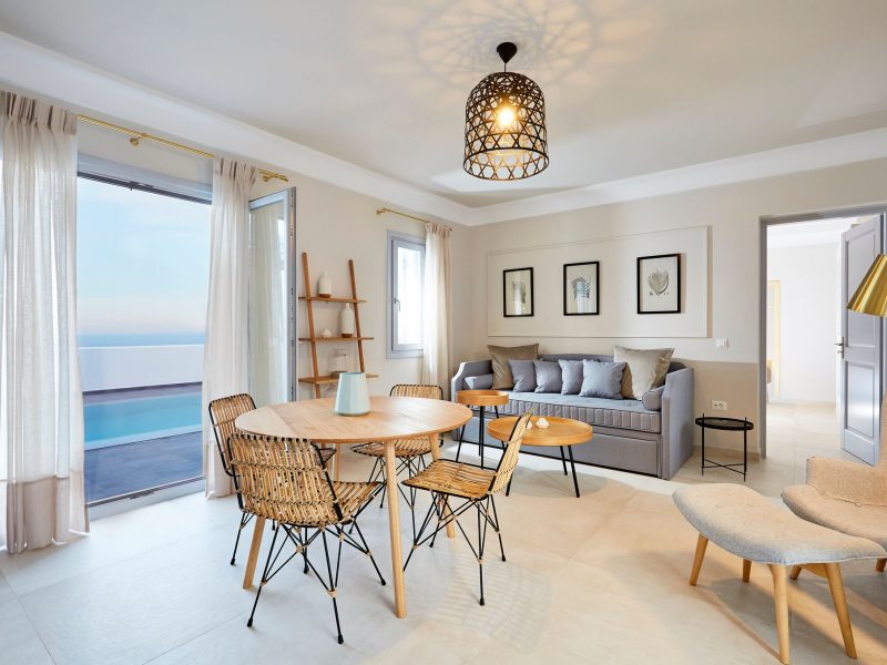 The epitome of luxury living, the Deluxe Villa Aria incorporates everything you have dreamt of regarding your stay. In the vastness of its 100 square meters, Deluxe Villa Aria comes with two Master Bedrooms (each with Private Bathroom with Jacuzzi) and 1 Bathroom with Shower at the Lounge Room. A secluded sanctuary of lavishness and ingenuous extravaganza where you can relax and surrender to the everlasting Greek sun’s bliss!