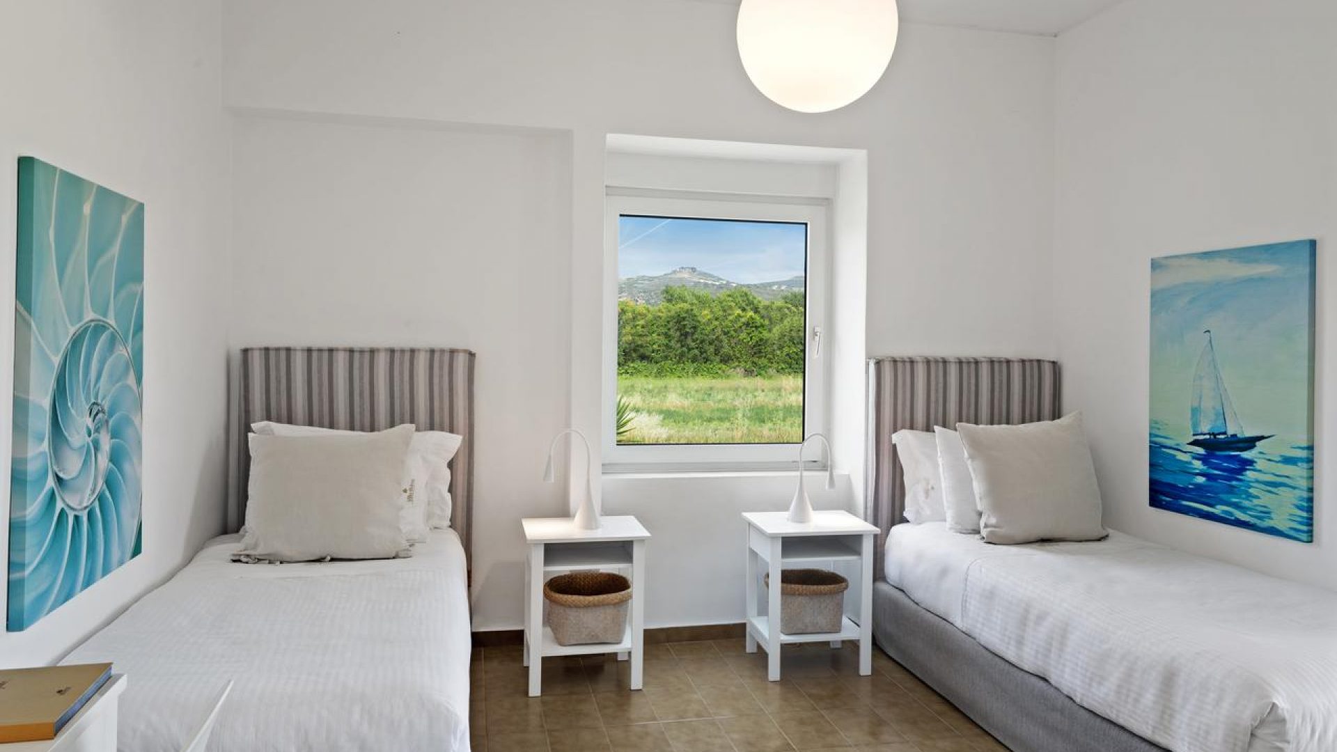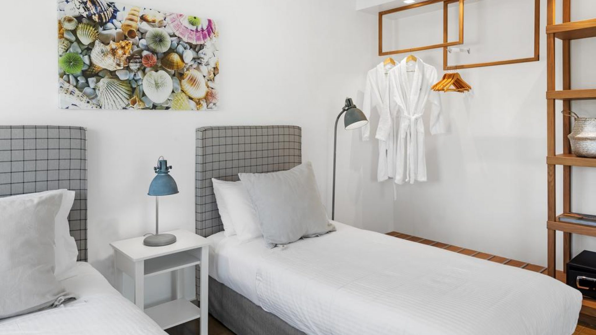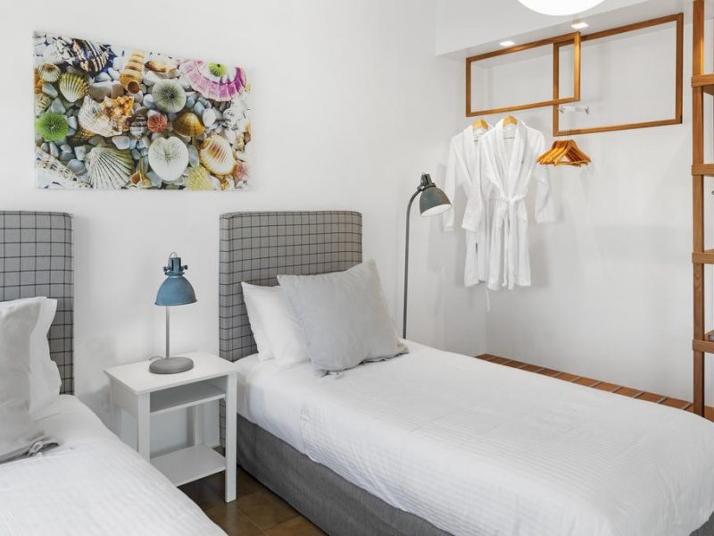 Bedroom No 3 with 2 single beds which, if put together, can provide a bigger one. Situated on the first floor, this bedroom has a big balcony which is shared with those staying in Bedroom No 2. It includes an independent air-conditioning unit and a spacious wardrobe