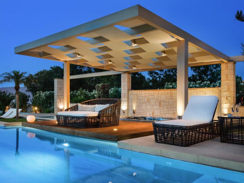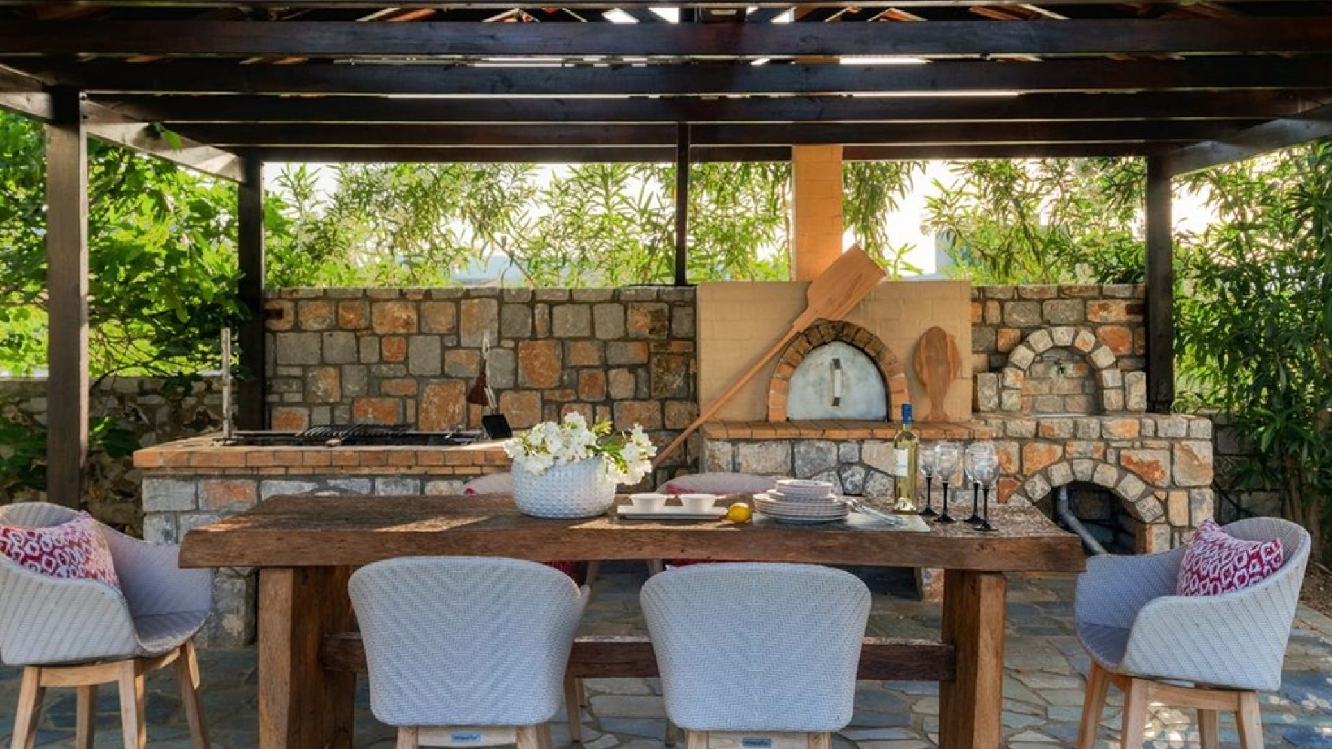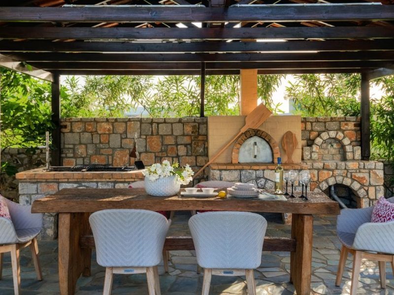 The exterior of the villa is equally stunning. It is comprised of porches, stone-made sofas and furniture, suitable for both your relaxation and your indulging in your meals. There is also a big stone-built barbecue situated under the cool, welcome shade of the vine