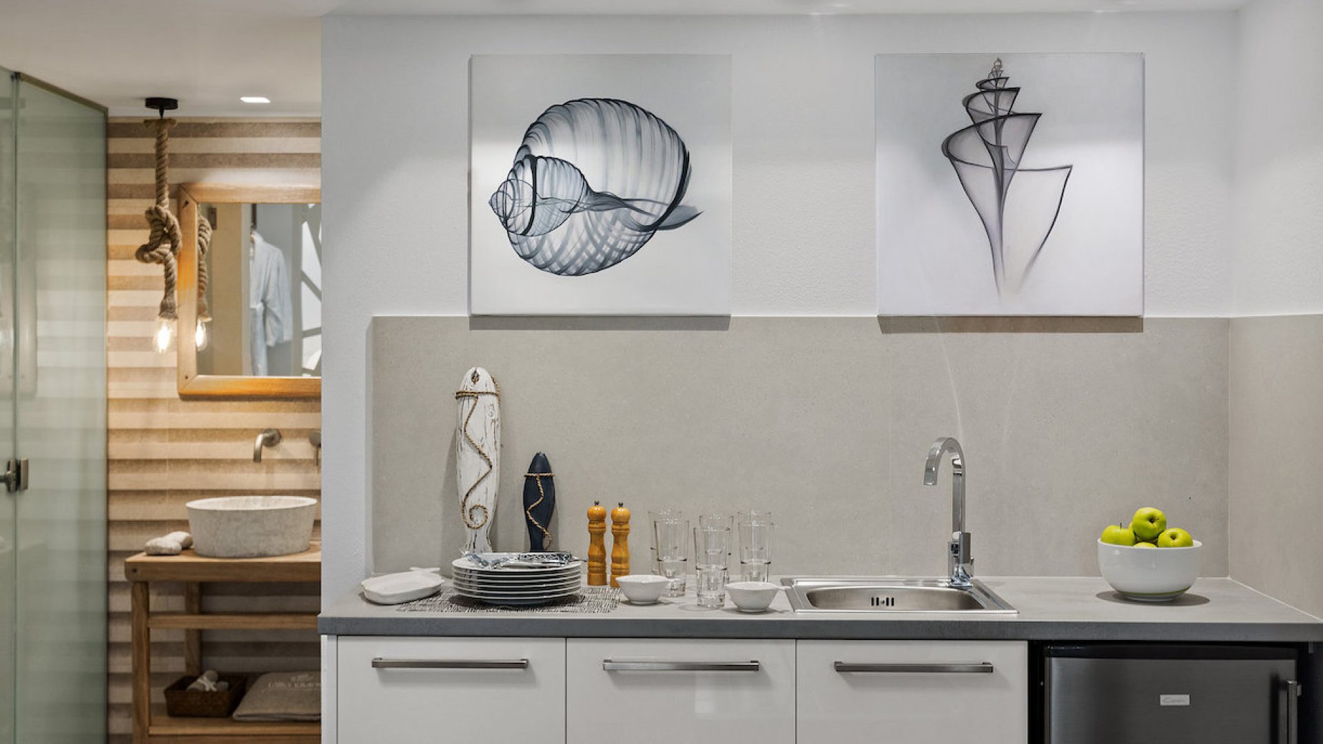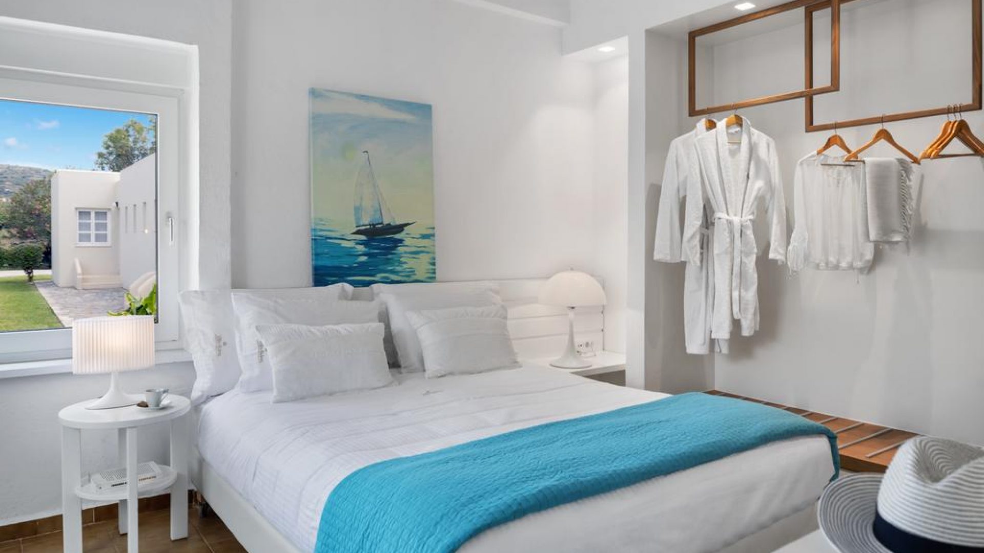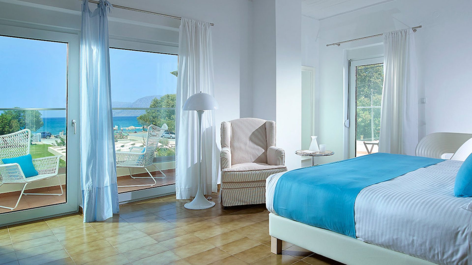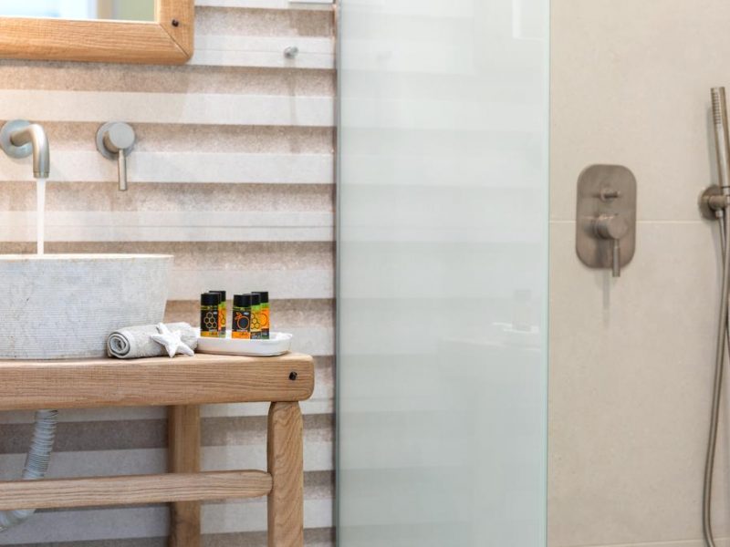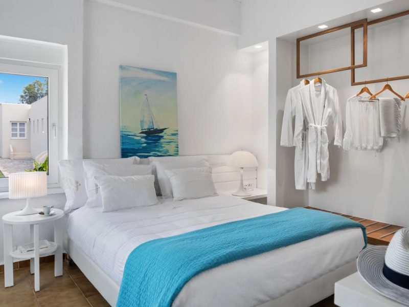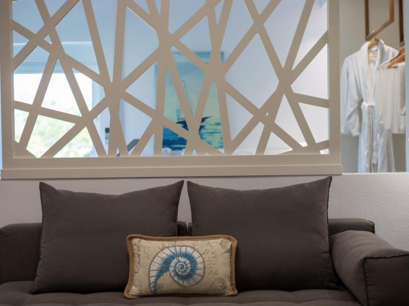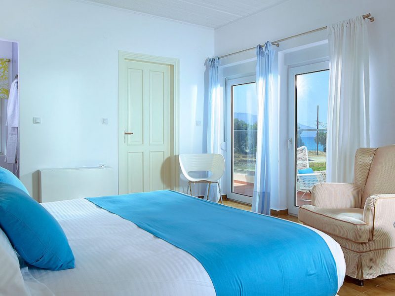 It consists of 2 floors and includes mainly open-air spaces so that you can sense the feeling of fresh air and the sea breeze dominating all over the place. The pale colors, the discreetly decorated style of the interior as well as the modern and elegantly furnished rooms, supplement the general sense of relaxation.