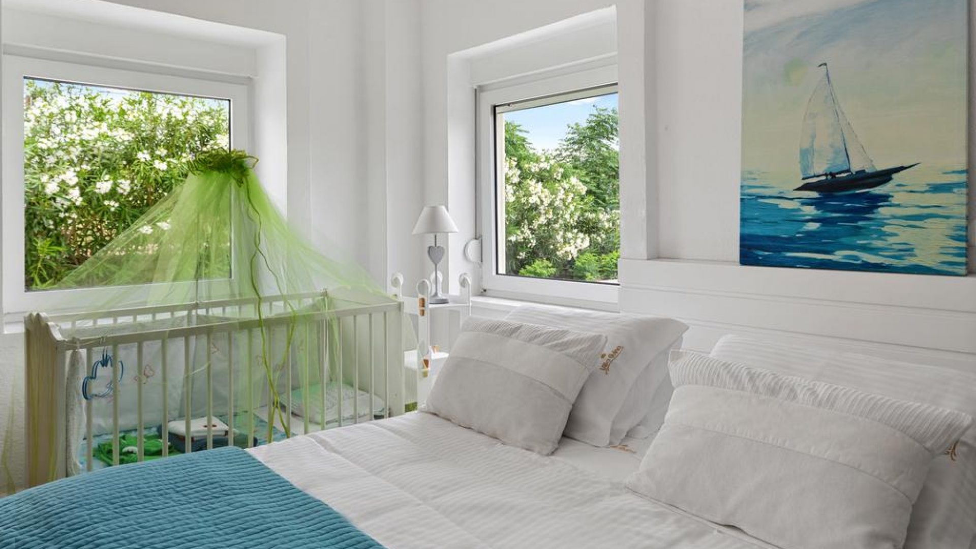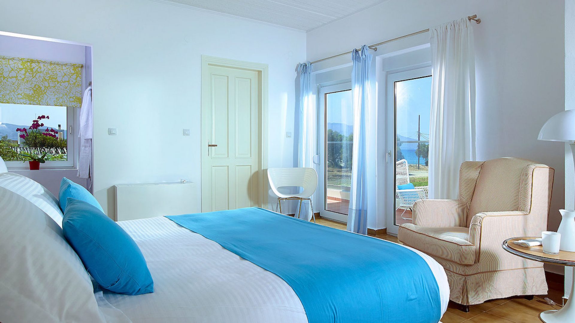 Bedroom No 1 with a double bed. Situated on the first floor, this bedroom has big balconies providing a panoramic view of the sea, the pool and the garden. There is also a separate, but incorporated into the bedroom area which functions as a beauty salon for women, with its own dressing table and a spacious wardrobe. Additionally, this room includes a bathroom and an independent air-conditioning unit