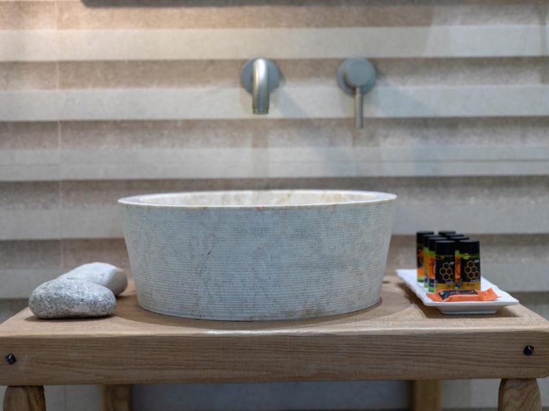 Bedroom No 4 (studio type) with double bed. Integrated into the villa’s ground floor but with separate entrance door. Inside the bedroom there is a lounge consisting of 2 stone-built sofas and a small table. There is also a kitchenette with 2 electric rings, fridge, freezer, cupboards, a spacious wardrobe, an independent air-conditioning unit, and a bathroom including a stone-built shower