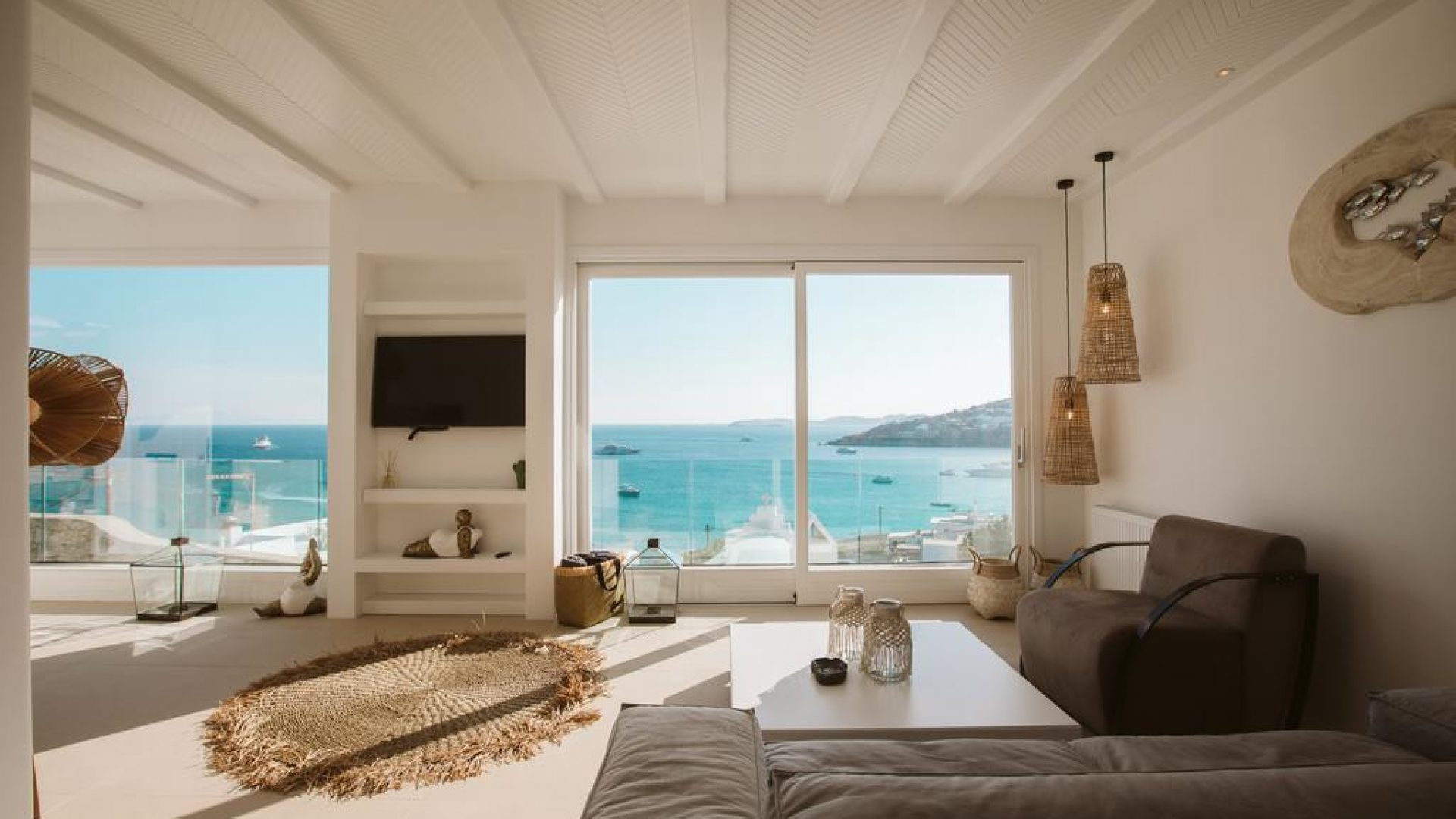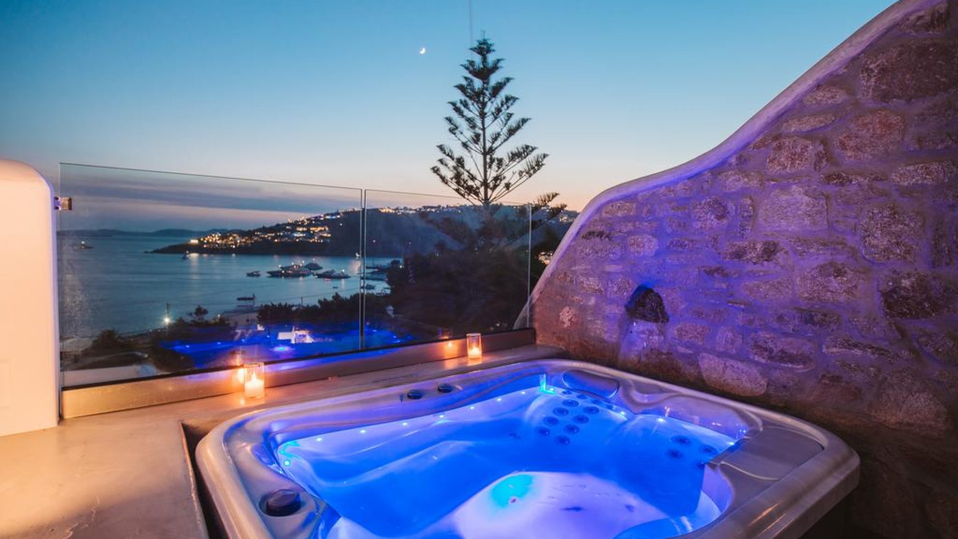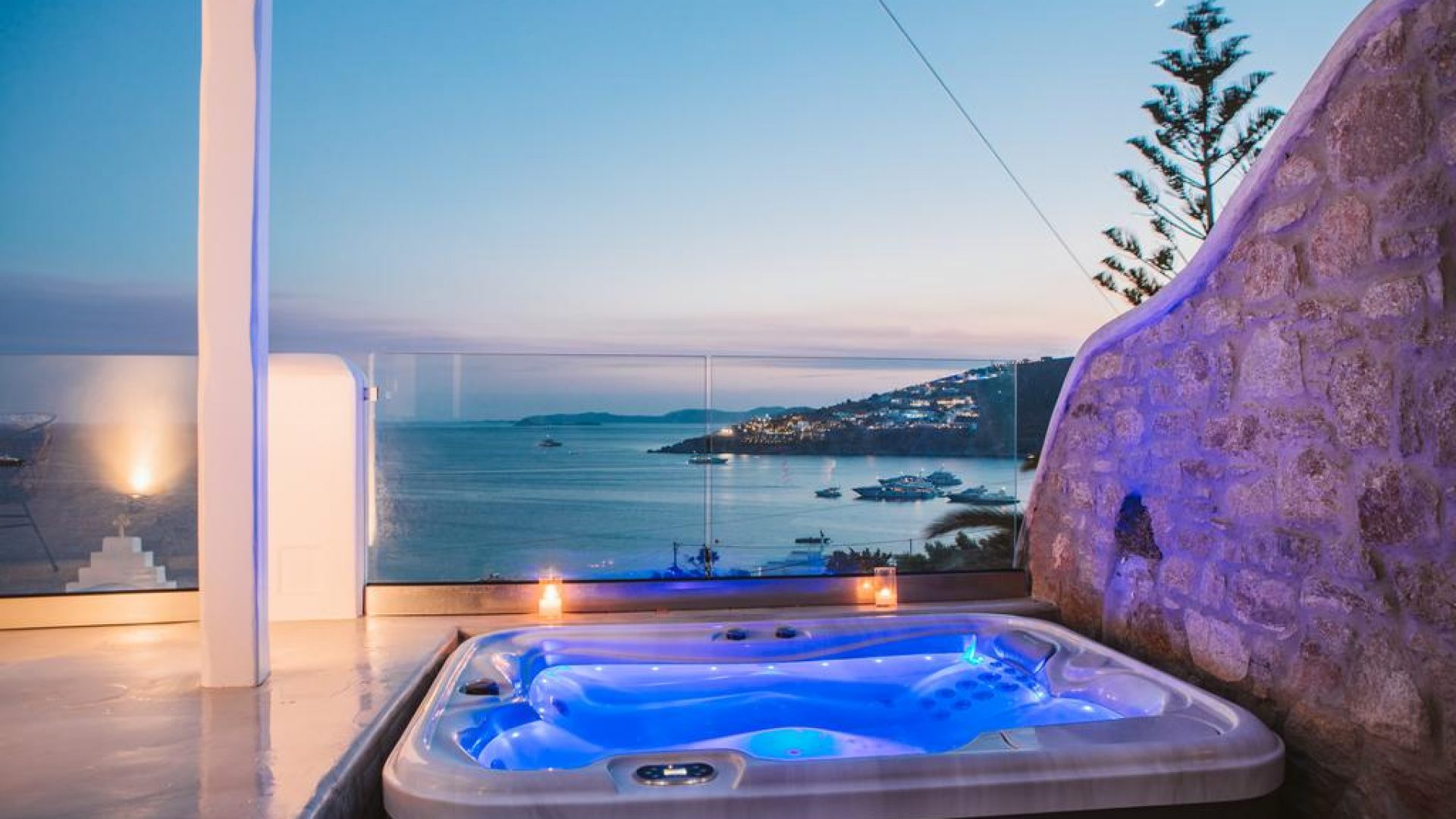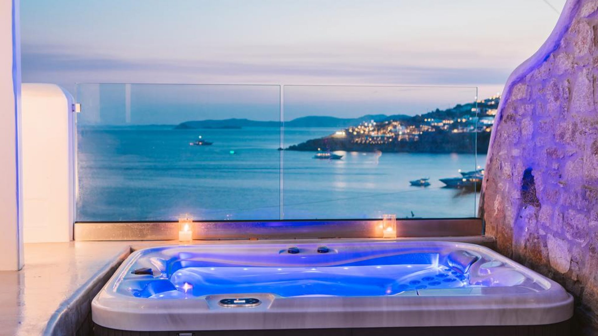 What’s more, you have a pool with minimalist-chic, designer sun loungers hovering above the water, a barbecue, a private, spacious, open-air jacuzzi, and plenty of seating, so you can enjoy the sea breeze along with the emblematic Mykonos panorama at any time of the day.