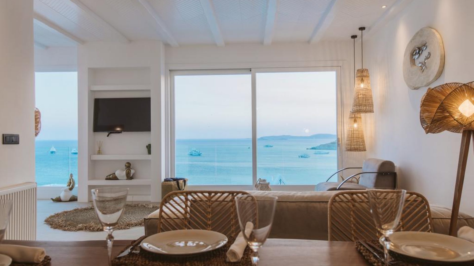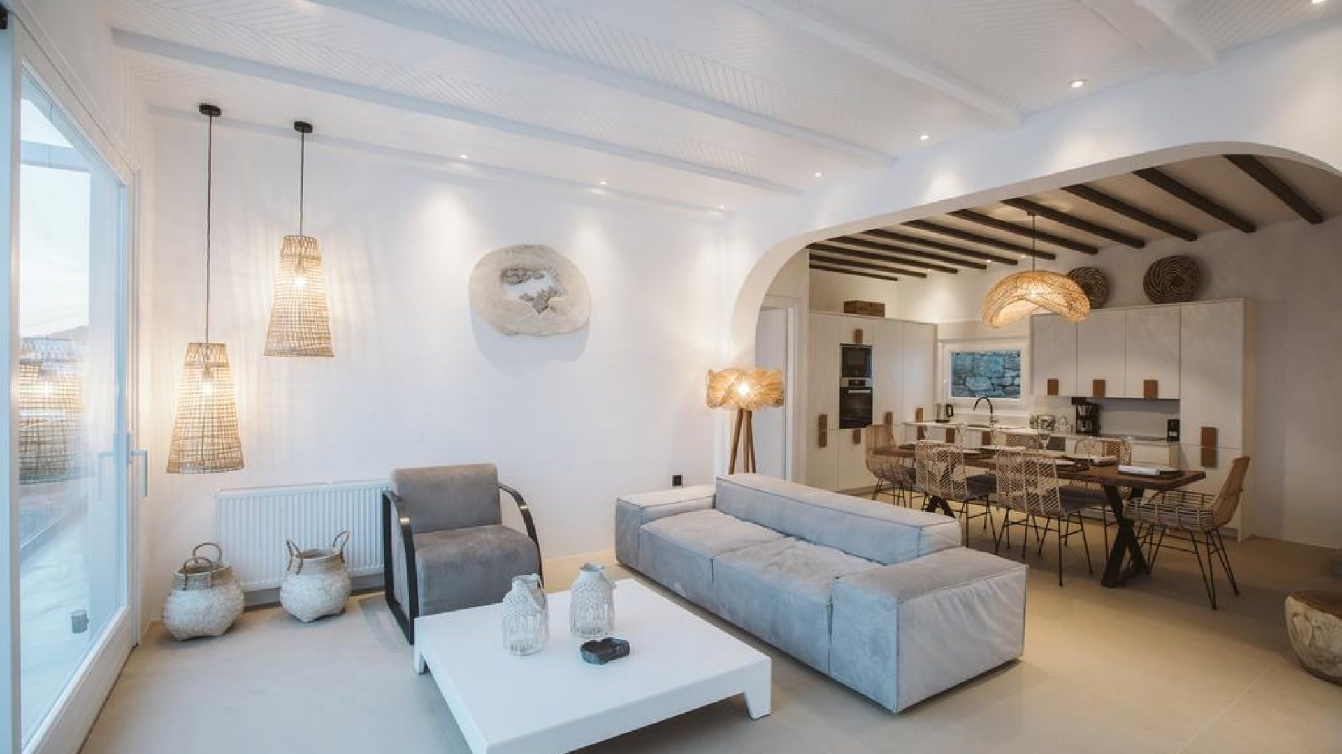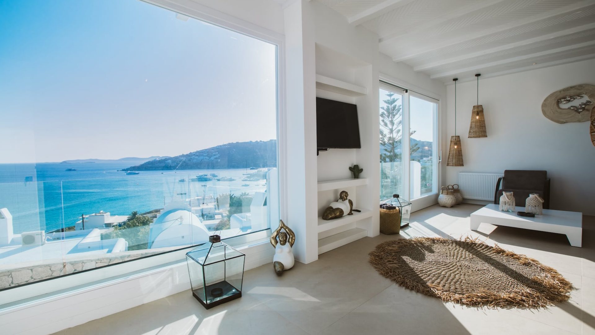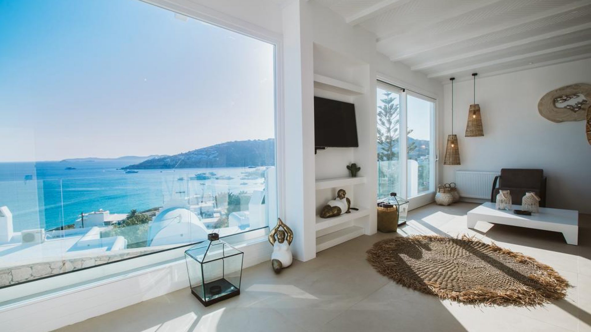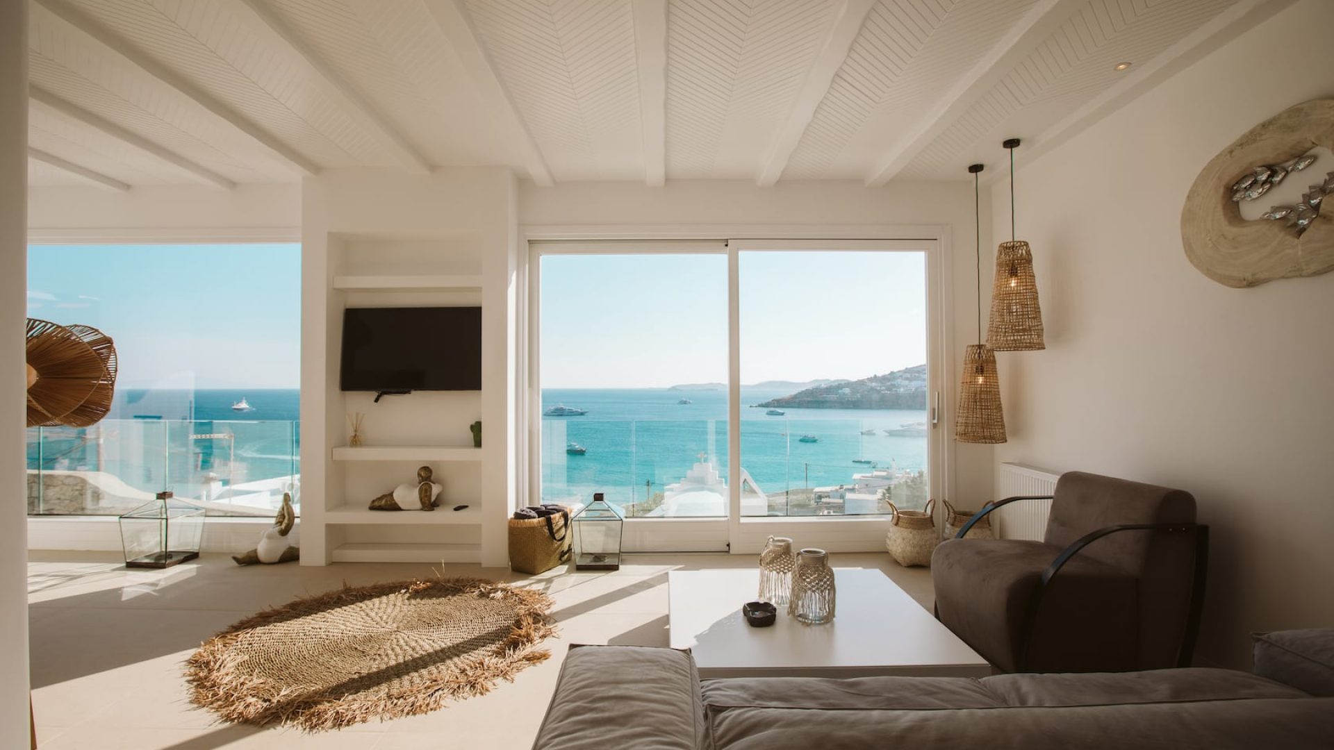 What’s more, you have a pool with minimalist-chic, designer sun loungers hovering above the water, a barbecue, a private, spacious, open-air jacuzzi, and plenty of seating, so you can enjoy the sea breeze along with the emblematic Mykonos panorama at any time of the day.
