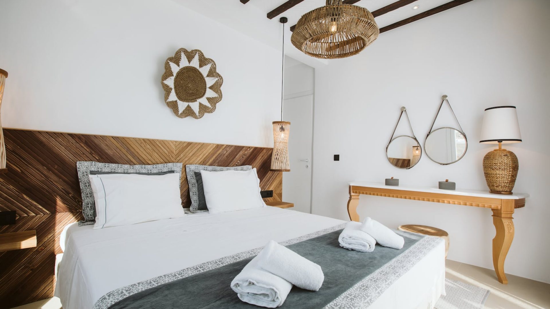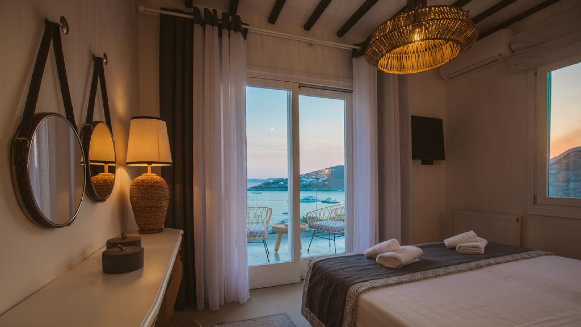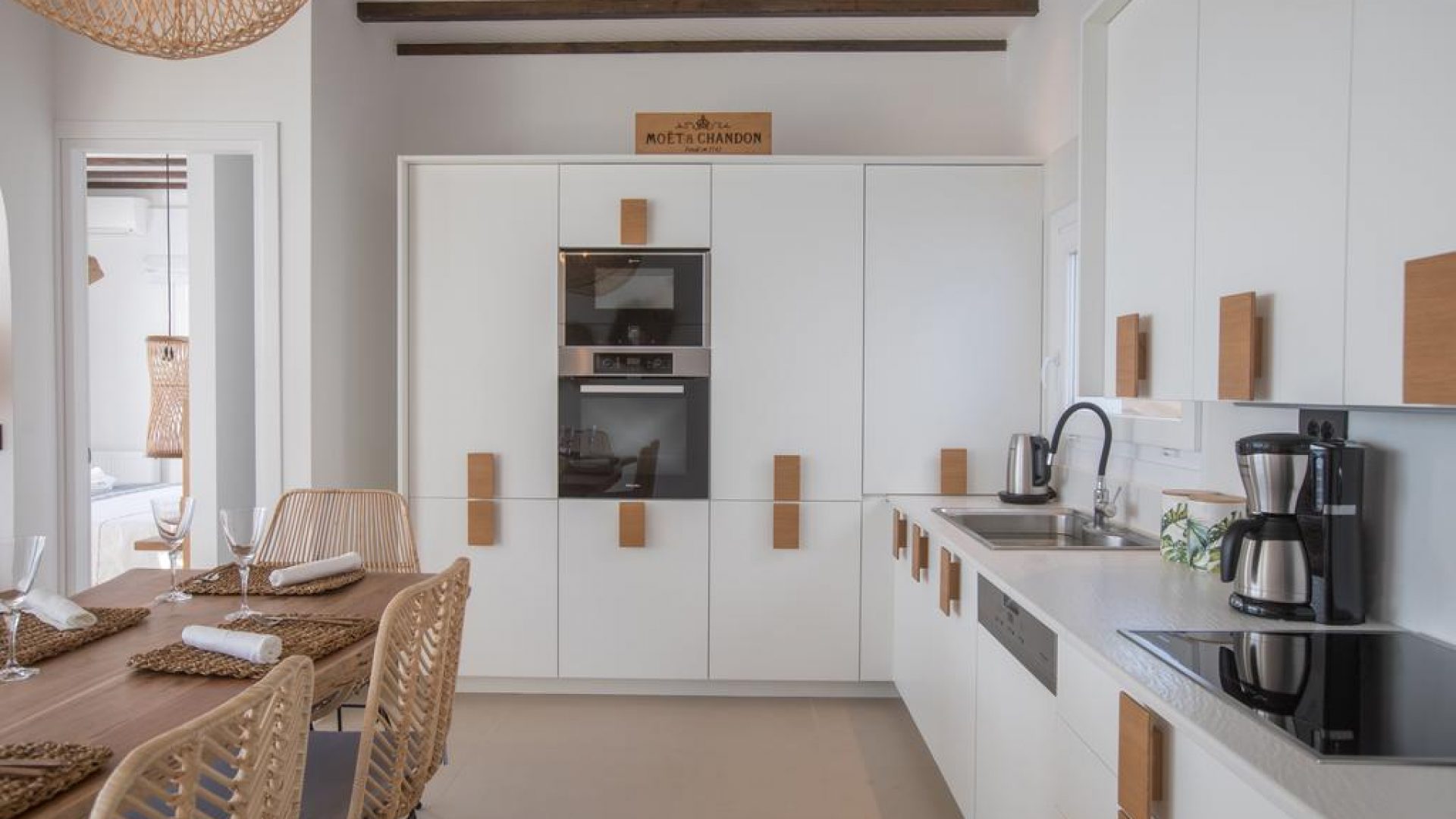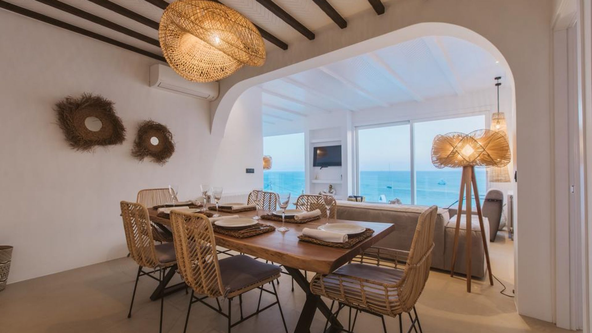 What’s more, you have a pool with minimalist-chic, designer sun loungers hovering above the water, a barbecue, a private, spacious, open-air jacuzzi, and plenty of seating, so you can enjoy the sea breeze along with the emblematic Mykonos panorama at any time of the day.
