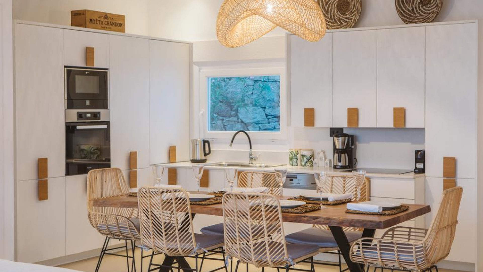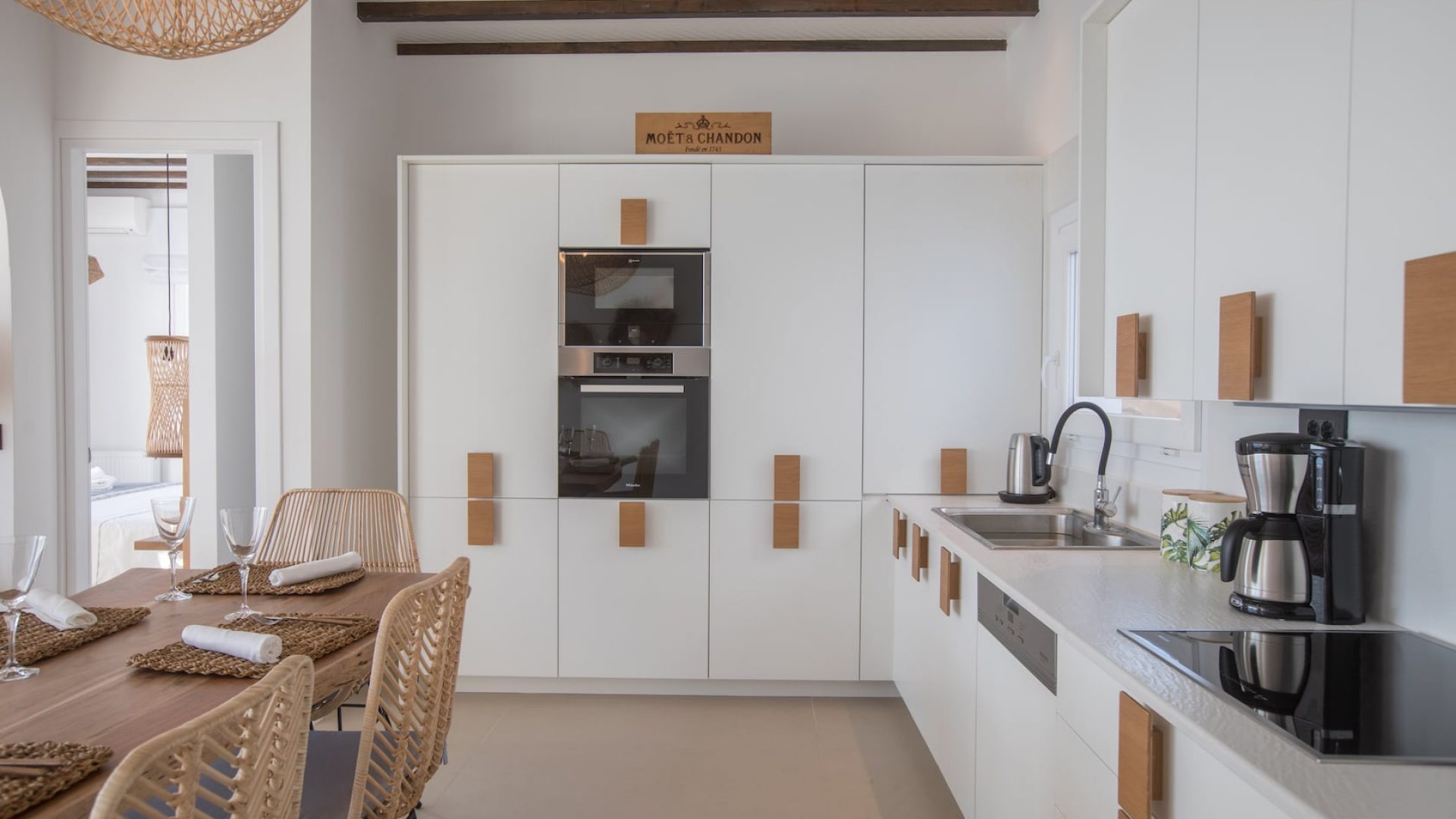 Inside, this cleverly designed, sumptuously appointed Mykonos villa offers accommodation for up to 8; plus, all the entertainment you could need, with plasma TVs with satellite channels and a surround sound music system, as well as lots of space to chill out or socialize with friends and family. There are comfortable sofas, designer furniture, and original works of art; an expansive dining table with an Aegean Sea view, and a well-equipped kitchen in the open-plan living area.