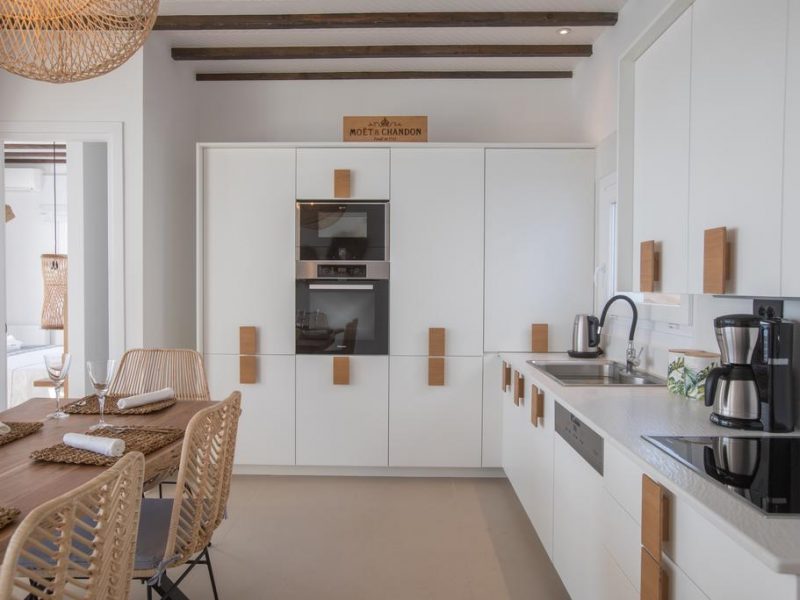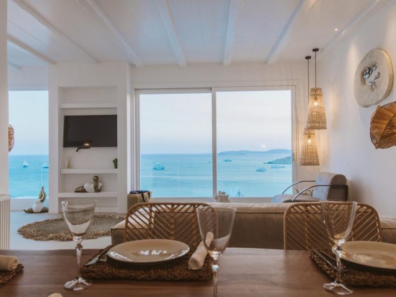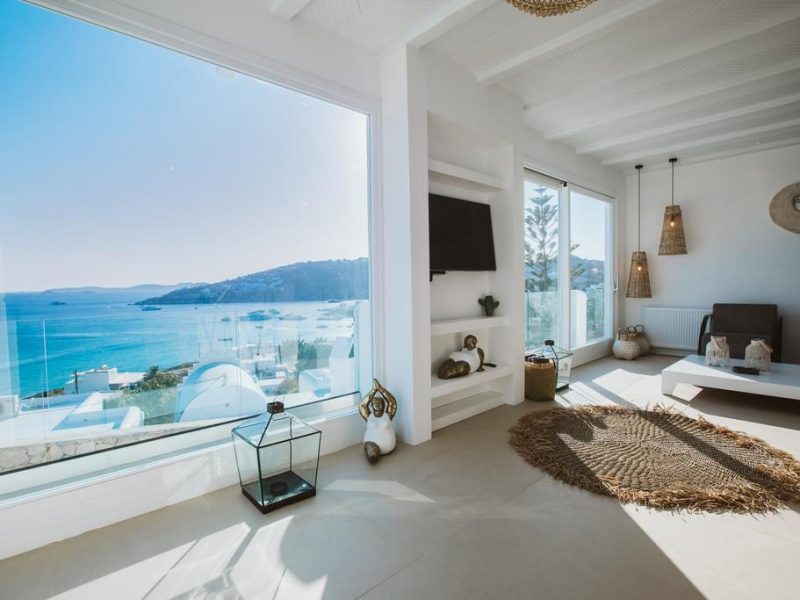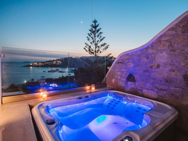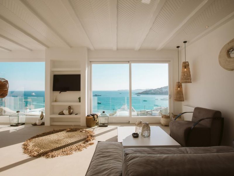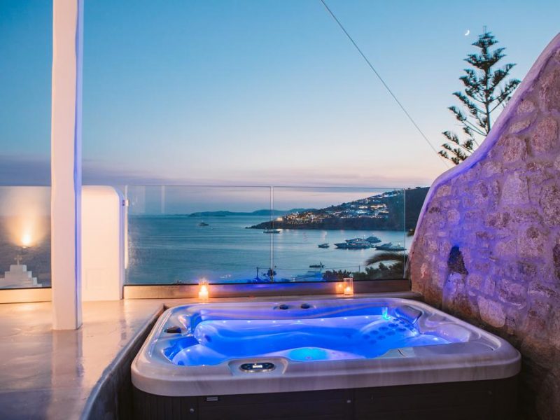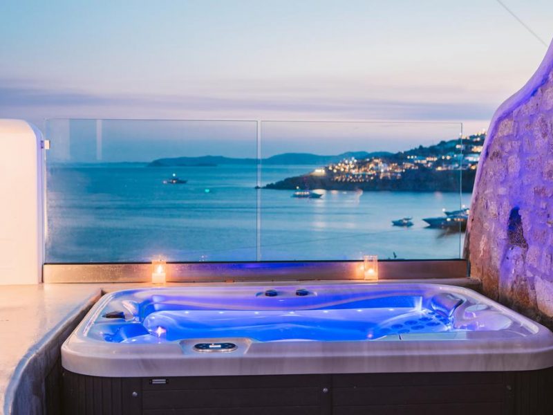 What’s more, you have a pool with minimalist-chic, designer sun loungers hovering above the water, a barbecue, a private, spacious, open-air jacuzzi, and plenty of seating, so you can enjoy the sea breeze along with the emblematic Mykonos panorama at any time of the day.