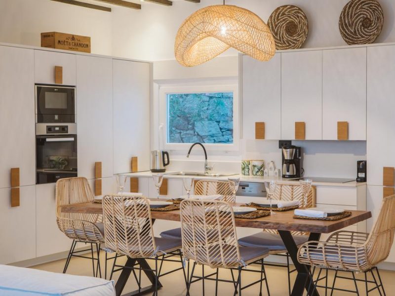 Inside, this cleverly designed, sumptuously appointed Mykonos villa offers accommodation for up to 8; plus, all the entertainment you could need, with plasma TVs with satellite channels and a surround sound music system, as well as lots of space to chill out or socialize with friends and family. There are comfortable sofas, designer furniture, and original works of art; an expansive dining table with an Aegean Sea view, and a well-equipped kitchen in the open-plan living area.