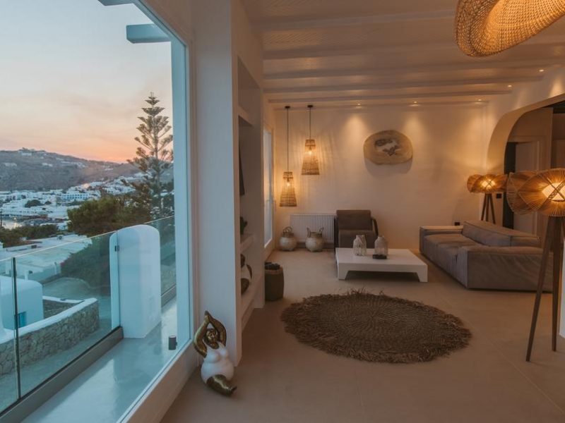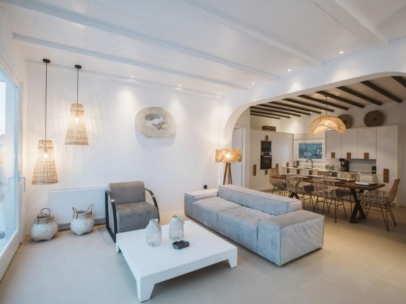 Just 4 km from Mykonos Chora, perched on the island’s southern hills, in synch with its surroundings, the new built, whitewashed Salt Life Mykonos Villa offers breathtaking sea vistas on to Platis Gialos, Agia Anna, and Paraga beaches, spellbinding sunset and sunrise views, manicured gardens, a jacuzzi, along with sumptuous, stylish interiors; all just a few minutes walks from the sandy, well organized, family-style Platis Gialos, but also the cosmopolitan, glamorous Paraga beach and the more intimate, quiet Agia Anna.