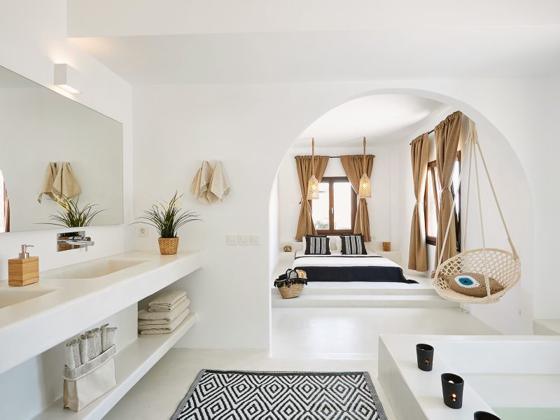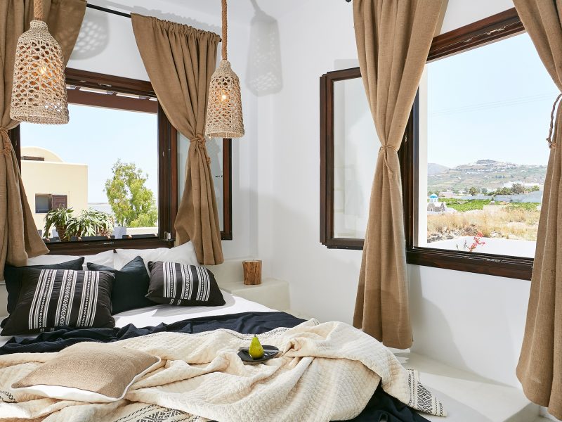 The resort is within 5 mins distance by car, from both the airport and Fira the capital city of the island. There the visitor will find restaurants, shops, museums, supermarkets, local stores and enjoy the best nightlife that the island has to offer. Between the property and Fira (almost 800 meters away), there is a village called Karterados, with cafeterias, supermarkets, laundry, restaurants, pharmacy, and many more shops. On the south end (1km away), Mesaria’ s center is located with even more stores.