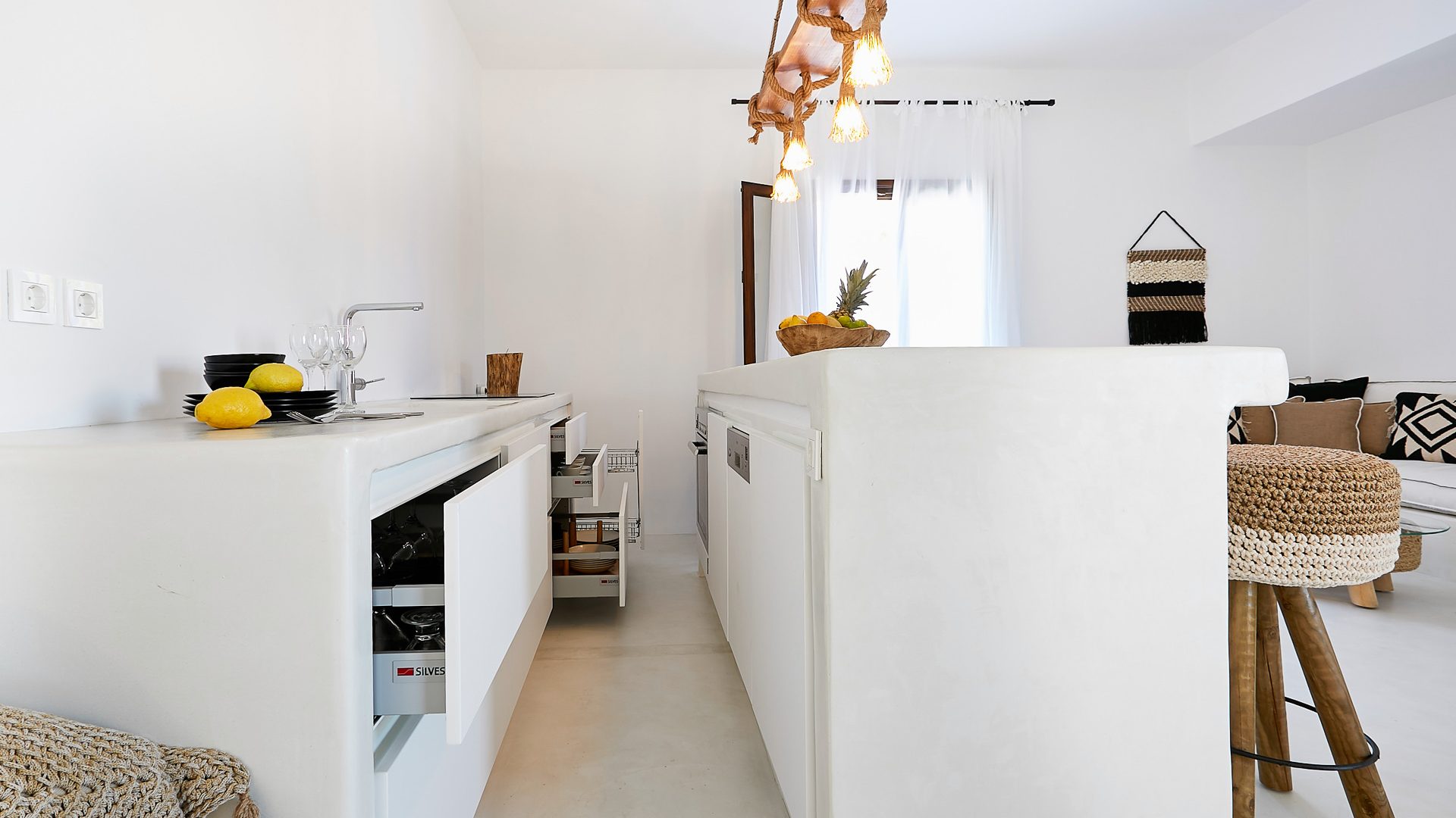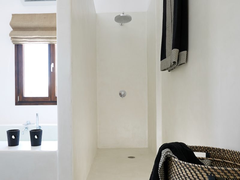 The main living spaces are in an open layout concept: 120 m² living dining and kitchen. Adjacent to the living room is the master bedroom with ensuite bathroom as well as the other two bedrooms with view to the magnificent village of “Pyrgos”. Windows run the length of the house, brightening the space with natural light.