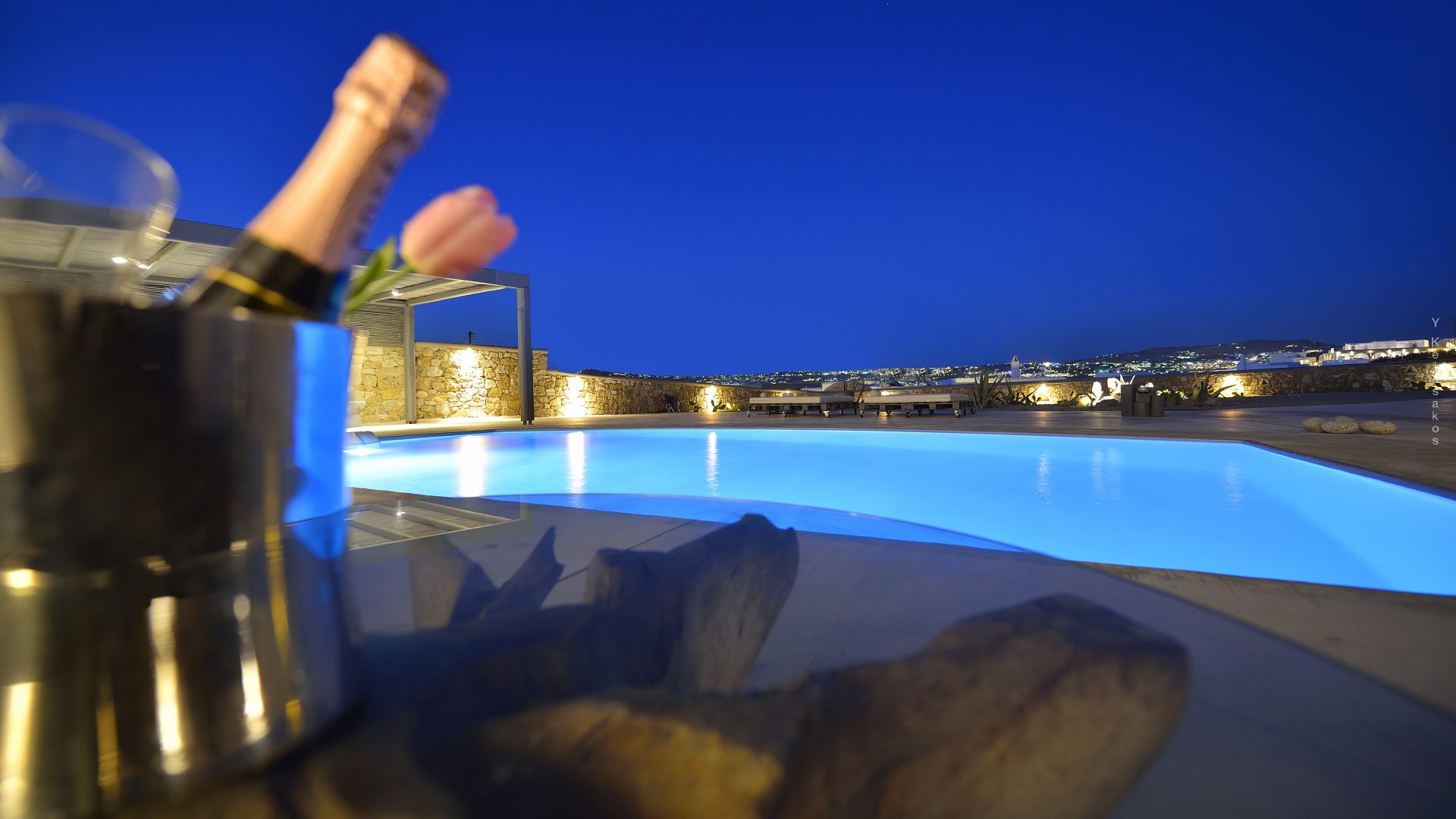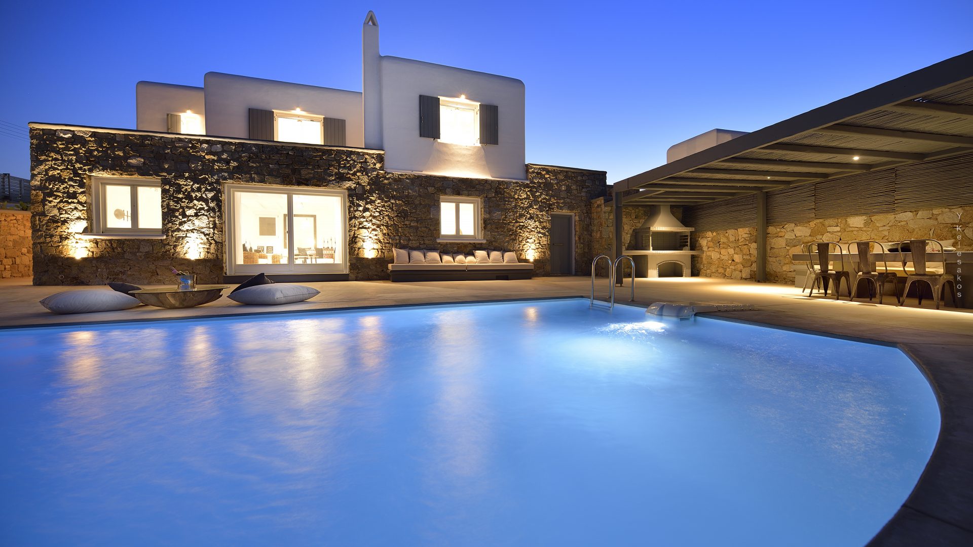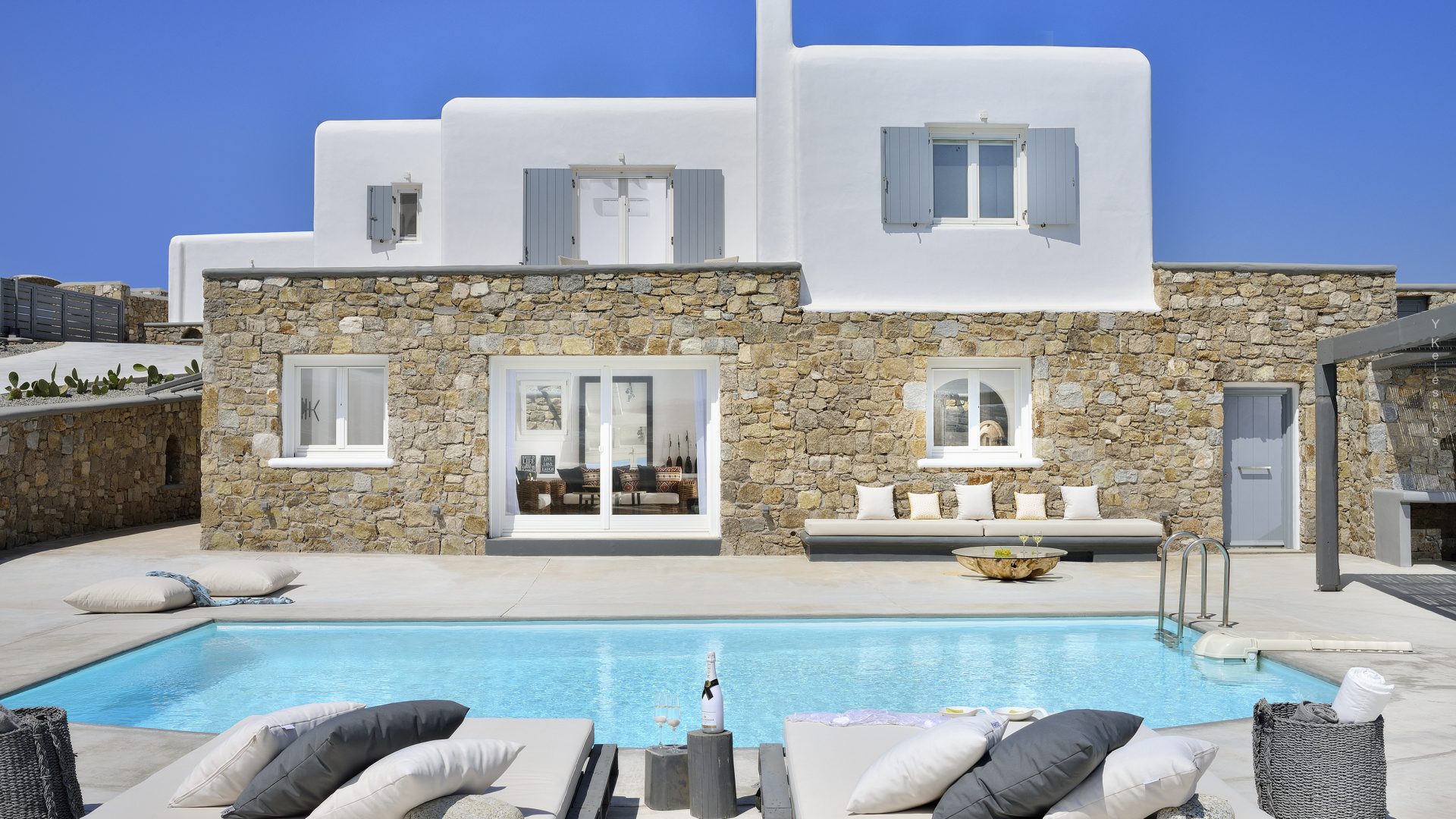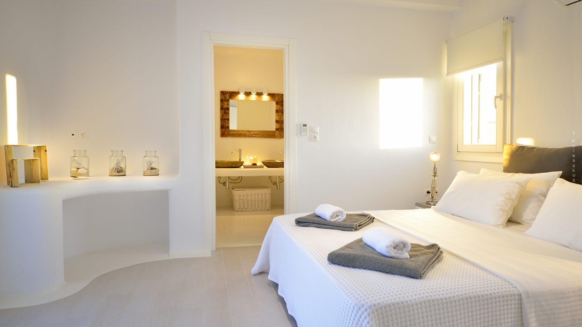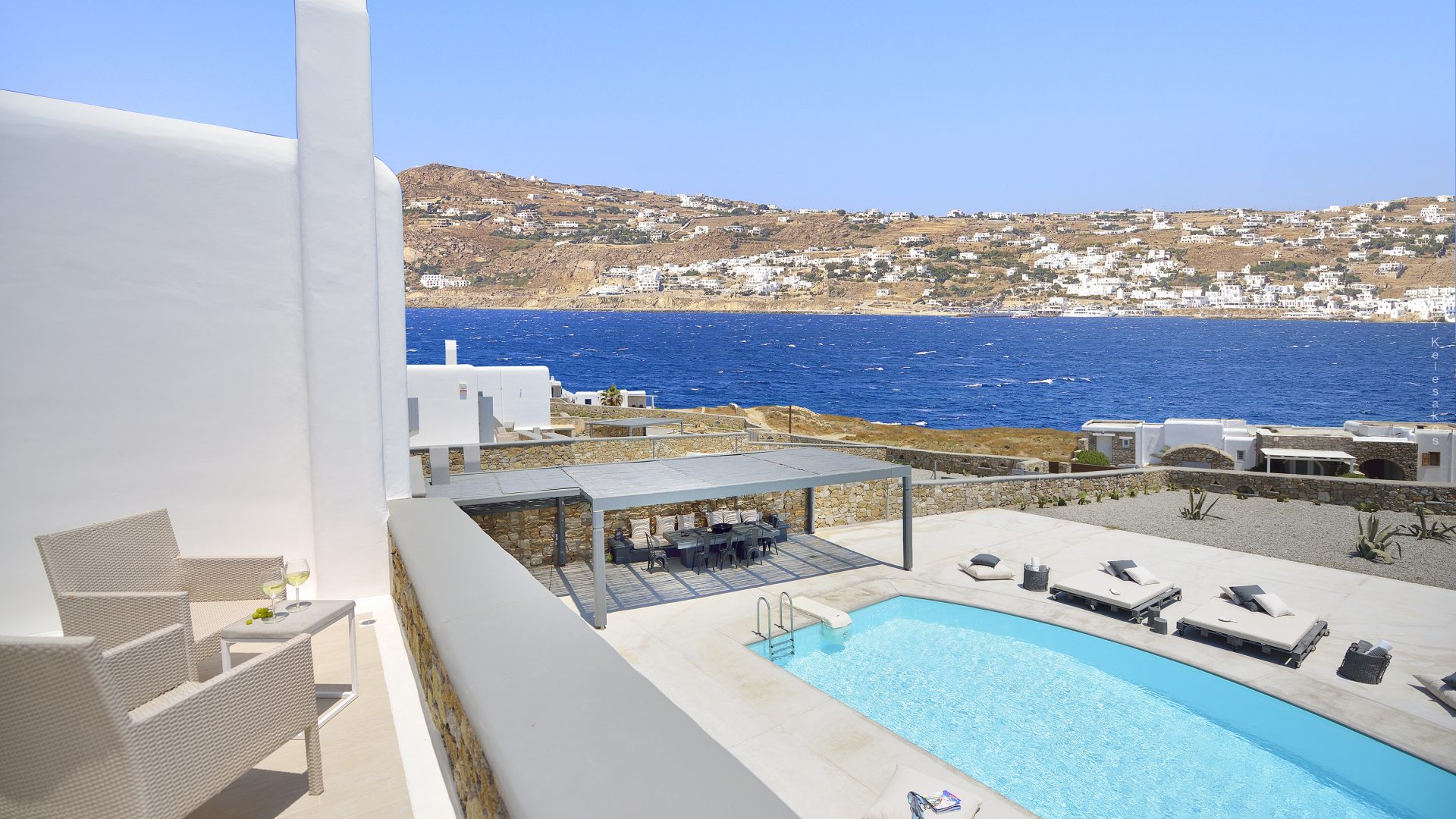 Villa Darling is located in Kanalia, only 150 metres from the sea. Built in a residence site of 1.900 m2, it has a view of Mykonos Town, Chora and Tinos Island. There is a sidewalk that leads to the sea in a few minutes and a swimming pool of 35 m2.