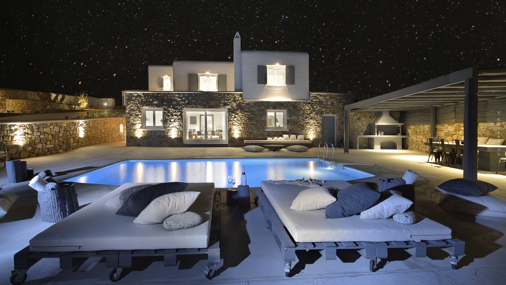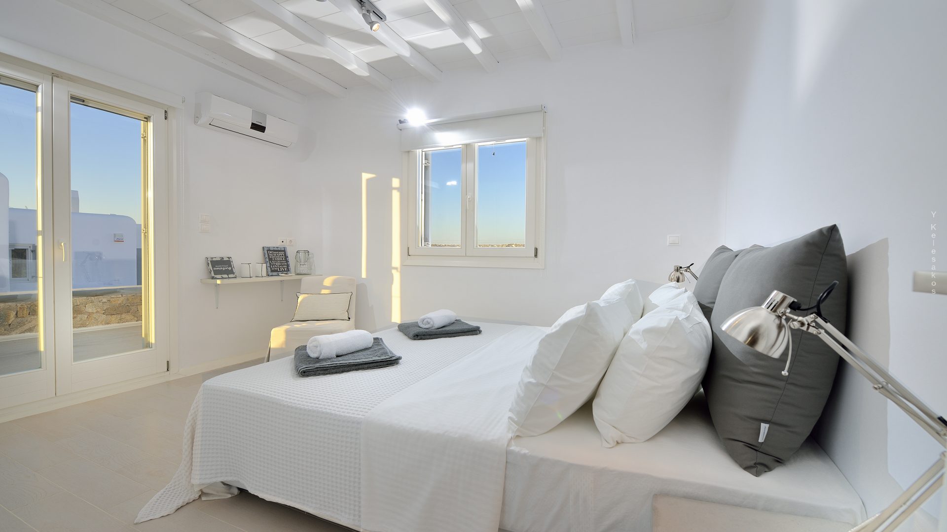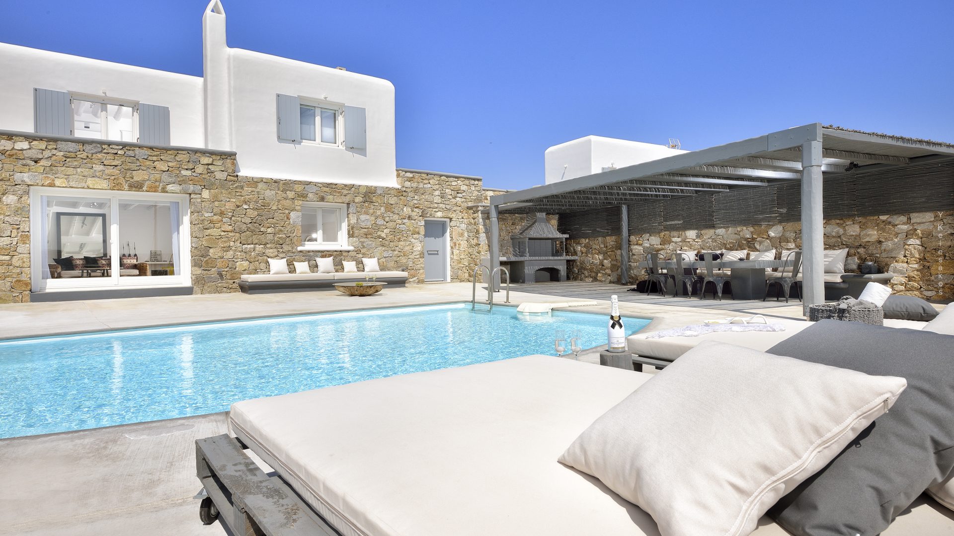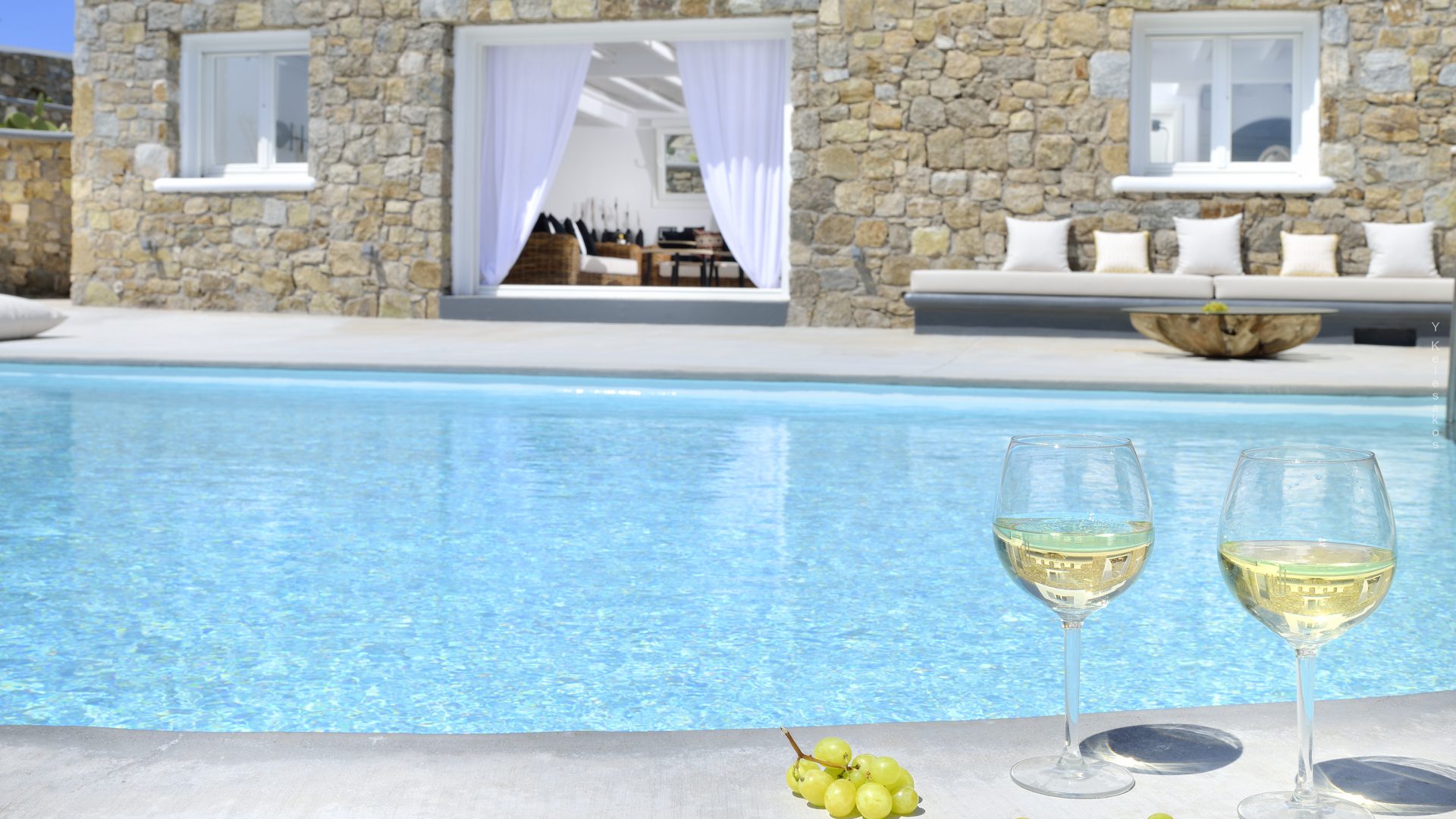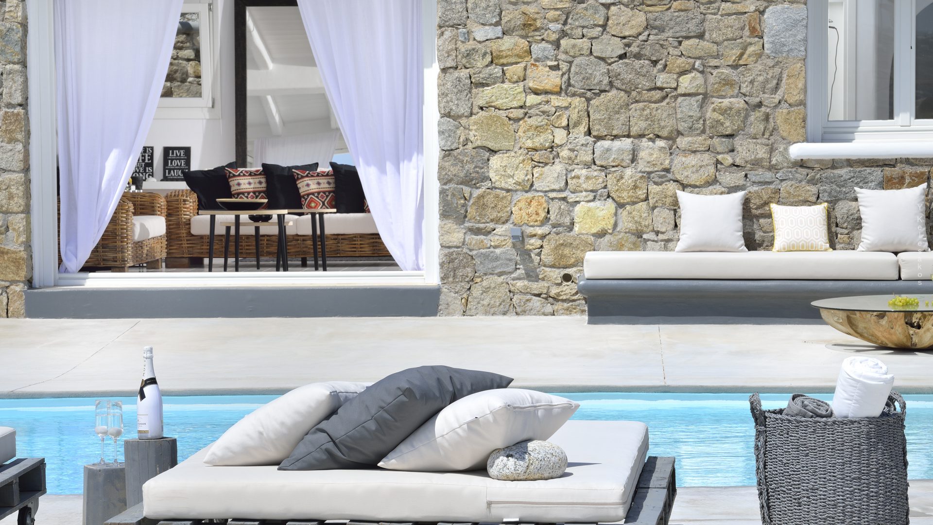 Villa Darling is located in Kanalia, only 150 metres from the sea. Built in a residence site of 1.900 m2, it has a view of Mykonos Town, Chora and Tinos Island. There is a sidewalk that leads to the sea in a few minutes and a swimming pool of 35 m2.