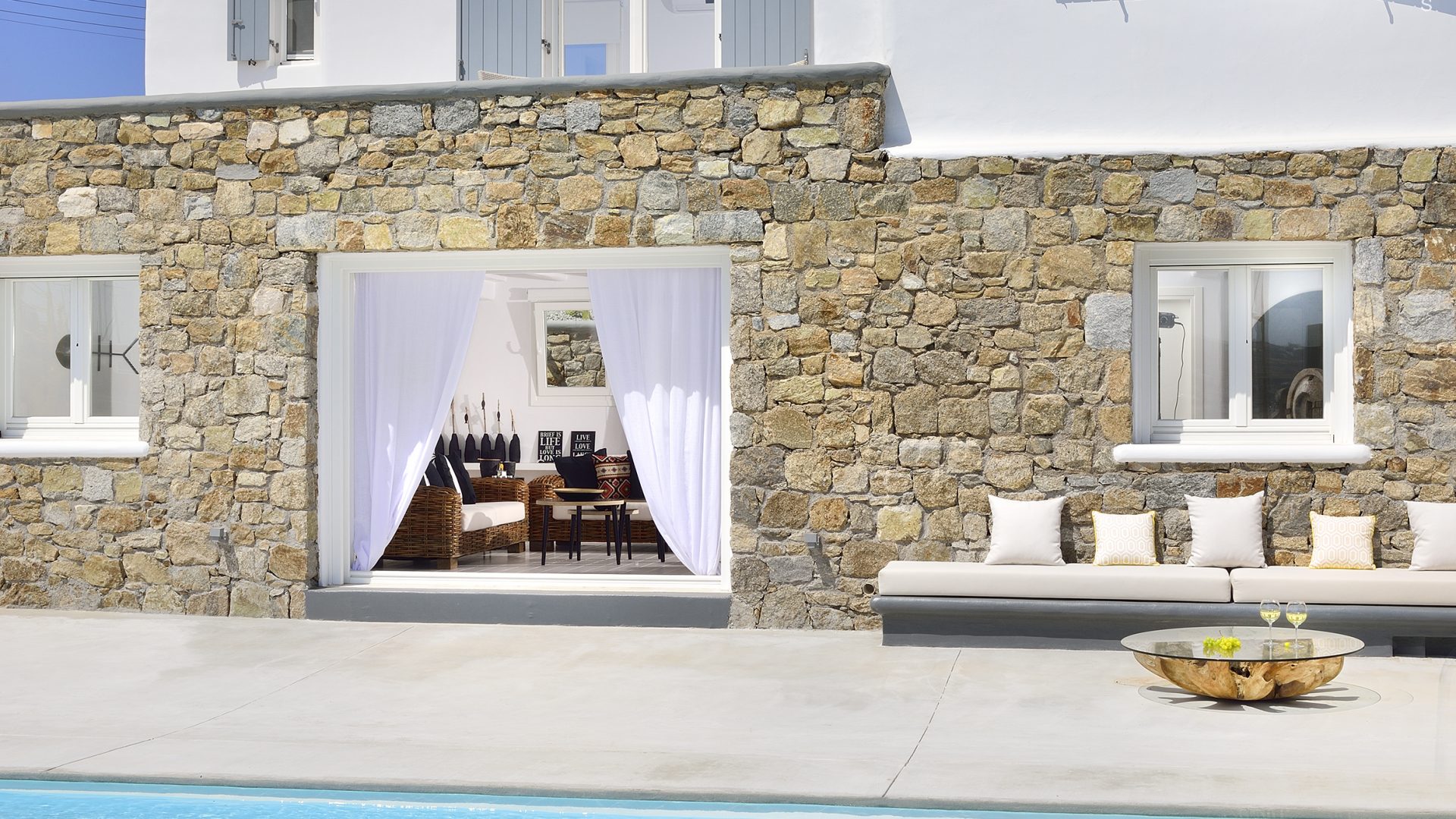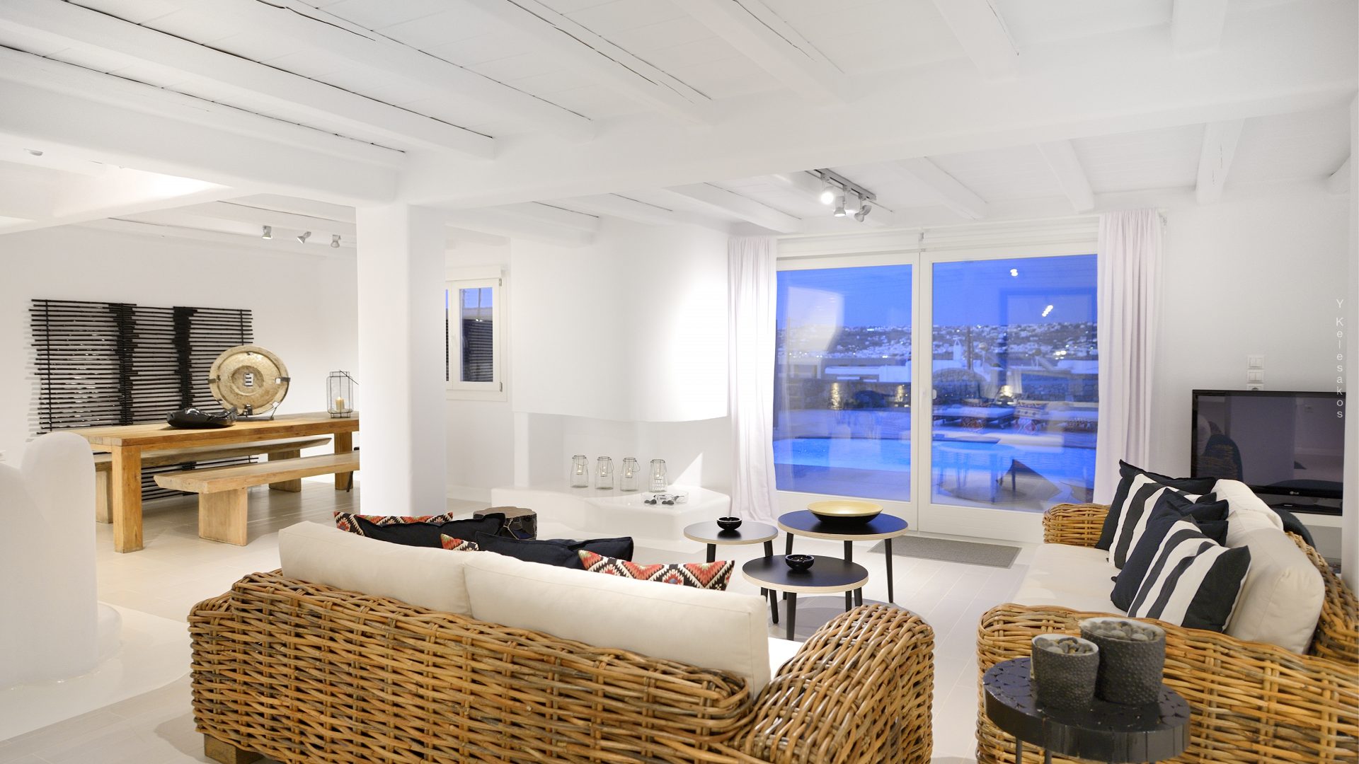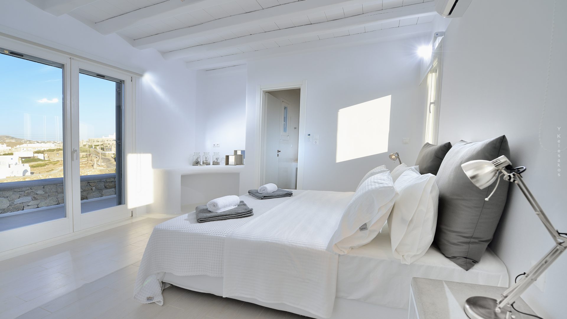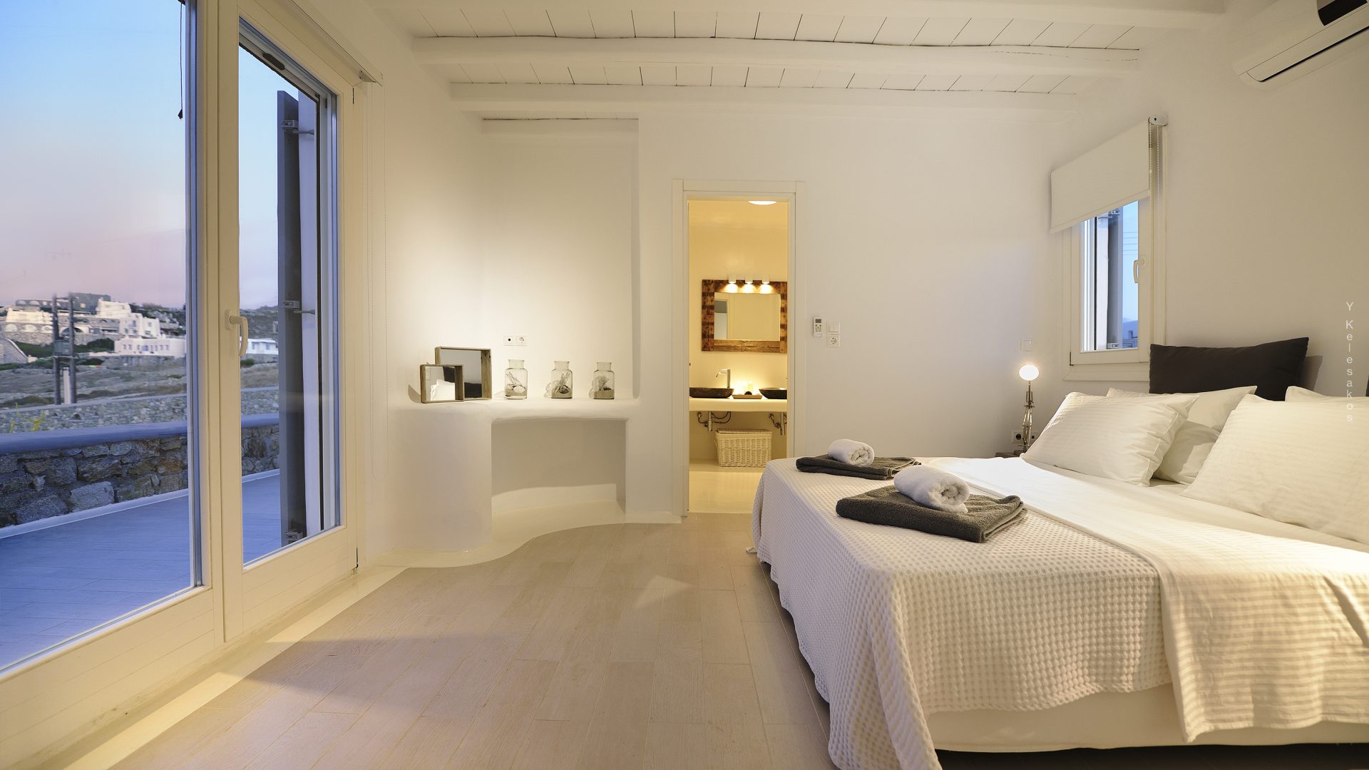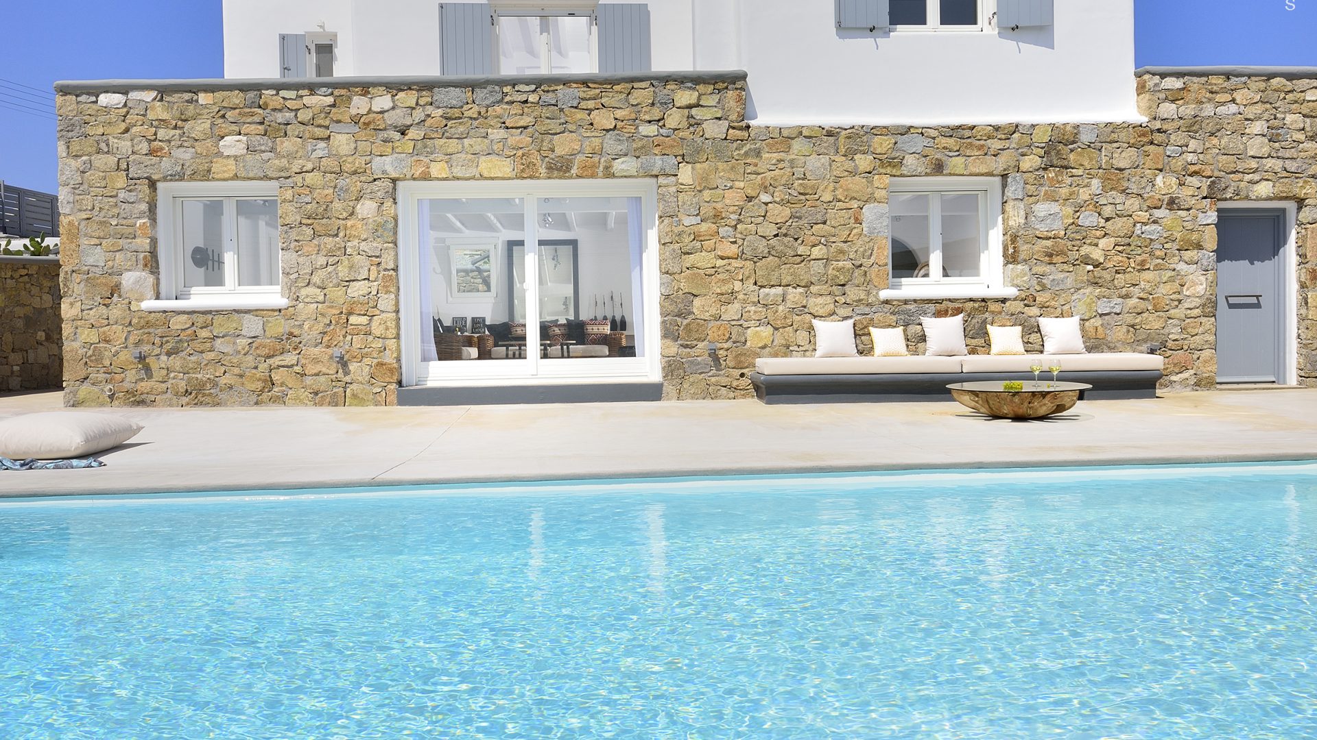 Villa Darling is located in Kanalia, only 150 metres from the sea. Built in a residence site of 1.900 m2, it has a view of Mykonos Town, Chora and Tinos Island. There is a sidewalk that leads to the sea in a few minutes and a swimming pool of 35 m2.