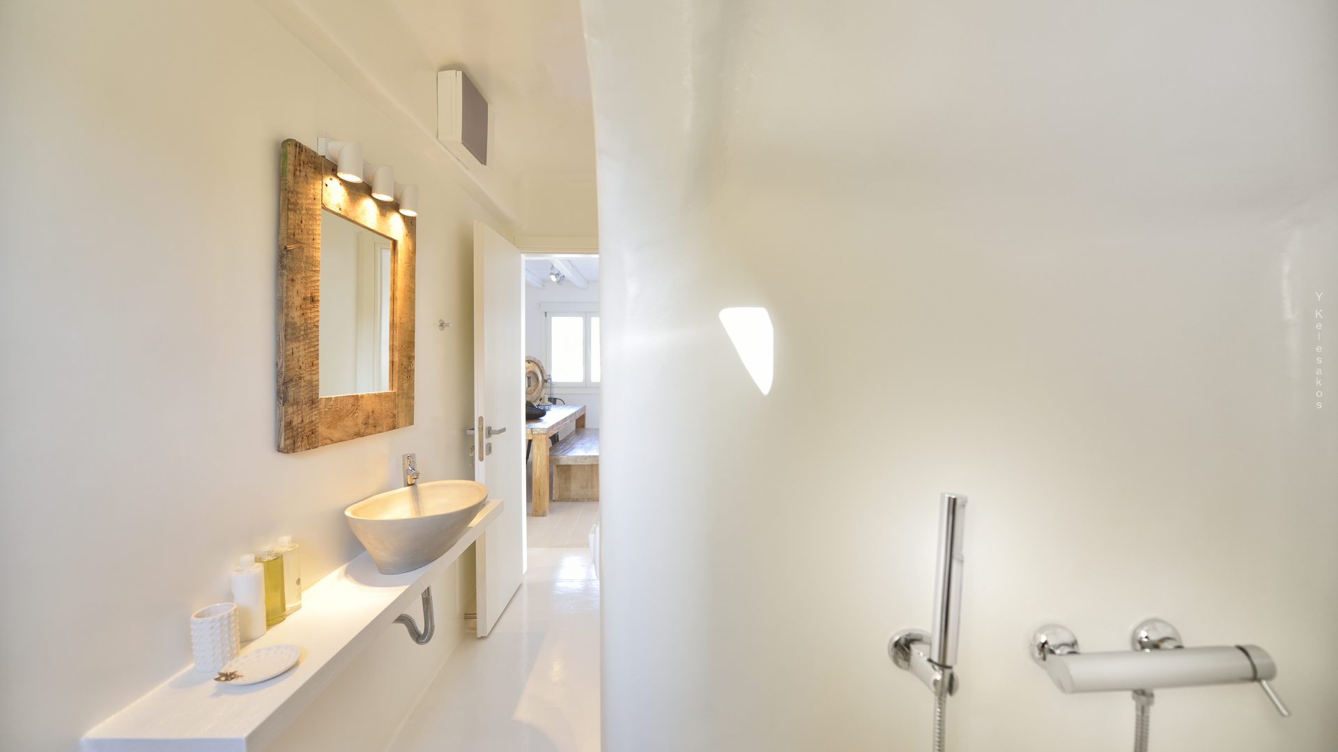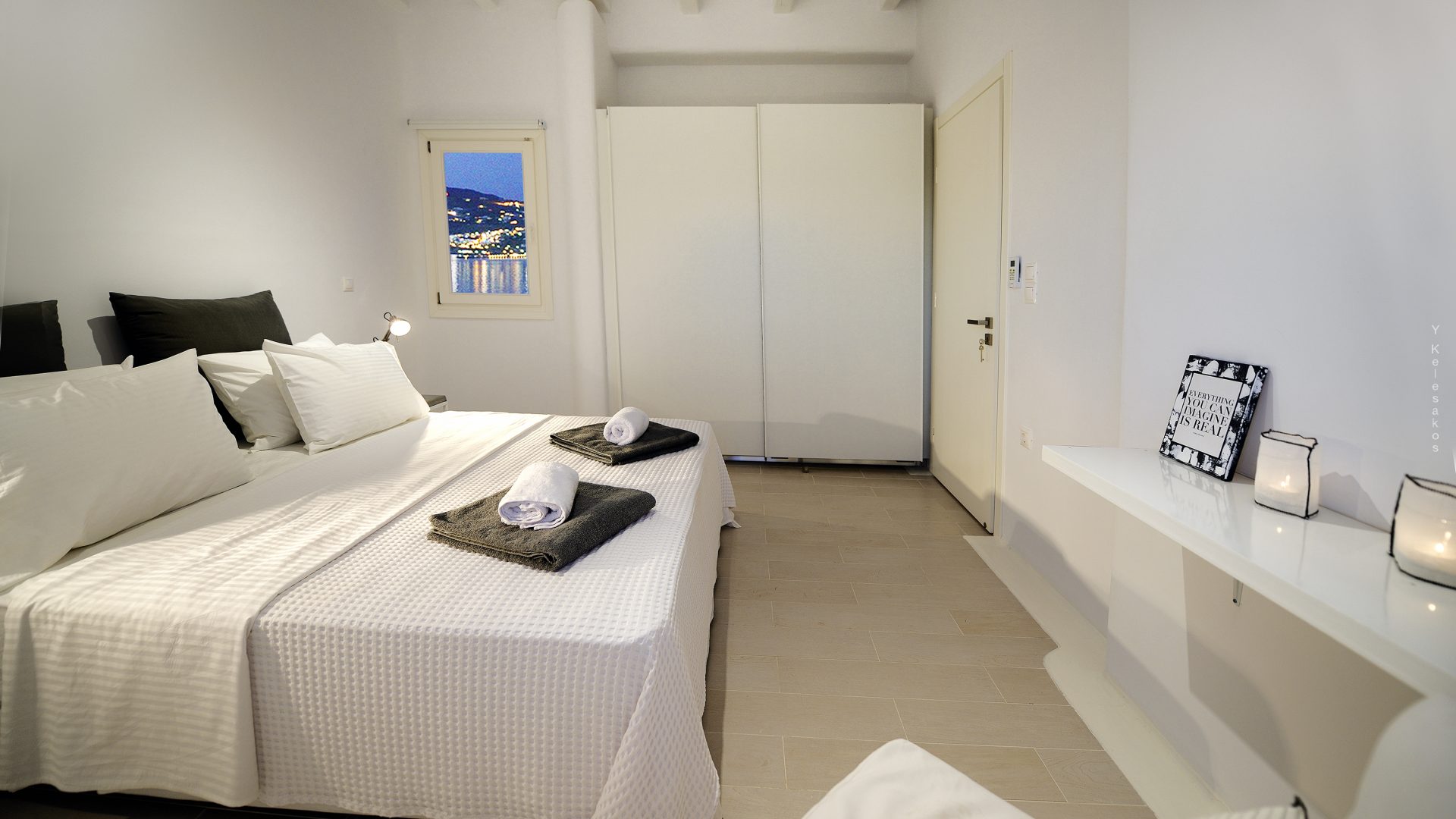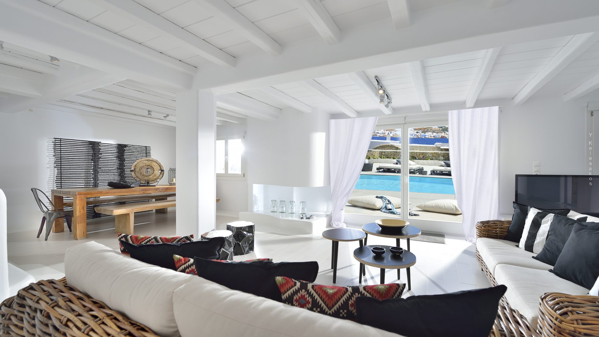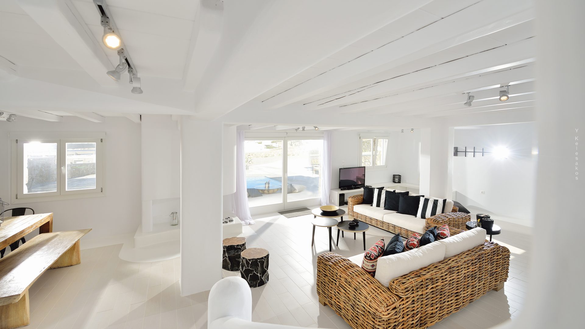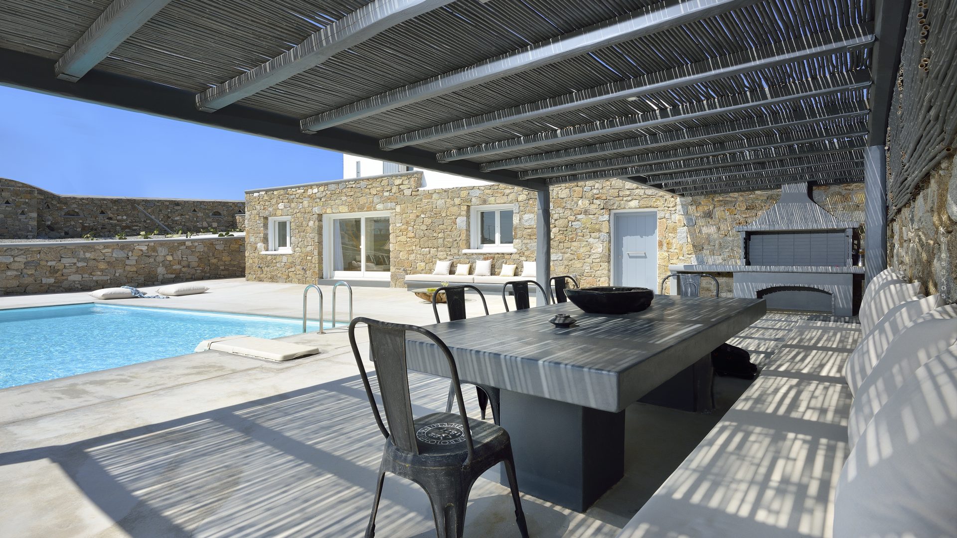 Villa Darling is located in Kanalia, only 150 metres from the sea. Built in a residence site of 1.900 m2, it has a view of Mykonos Town, Chora and Tinos Island. There is a sidewalk that leads to the sea in a few minutes and a swimming pool of 35 m2.
