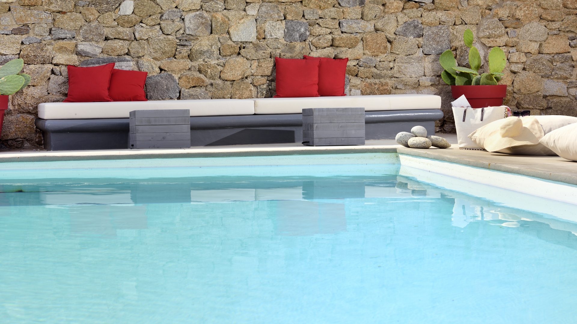 Outside there is a pool house, guest house and the surroundings are barbeque area built couches, dining table and chairs as well as pool towels.
