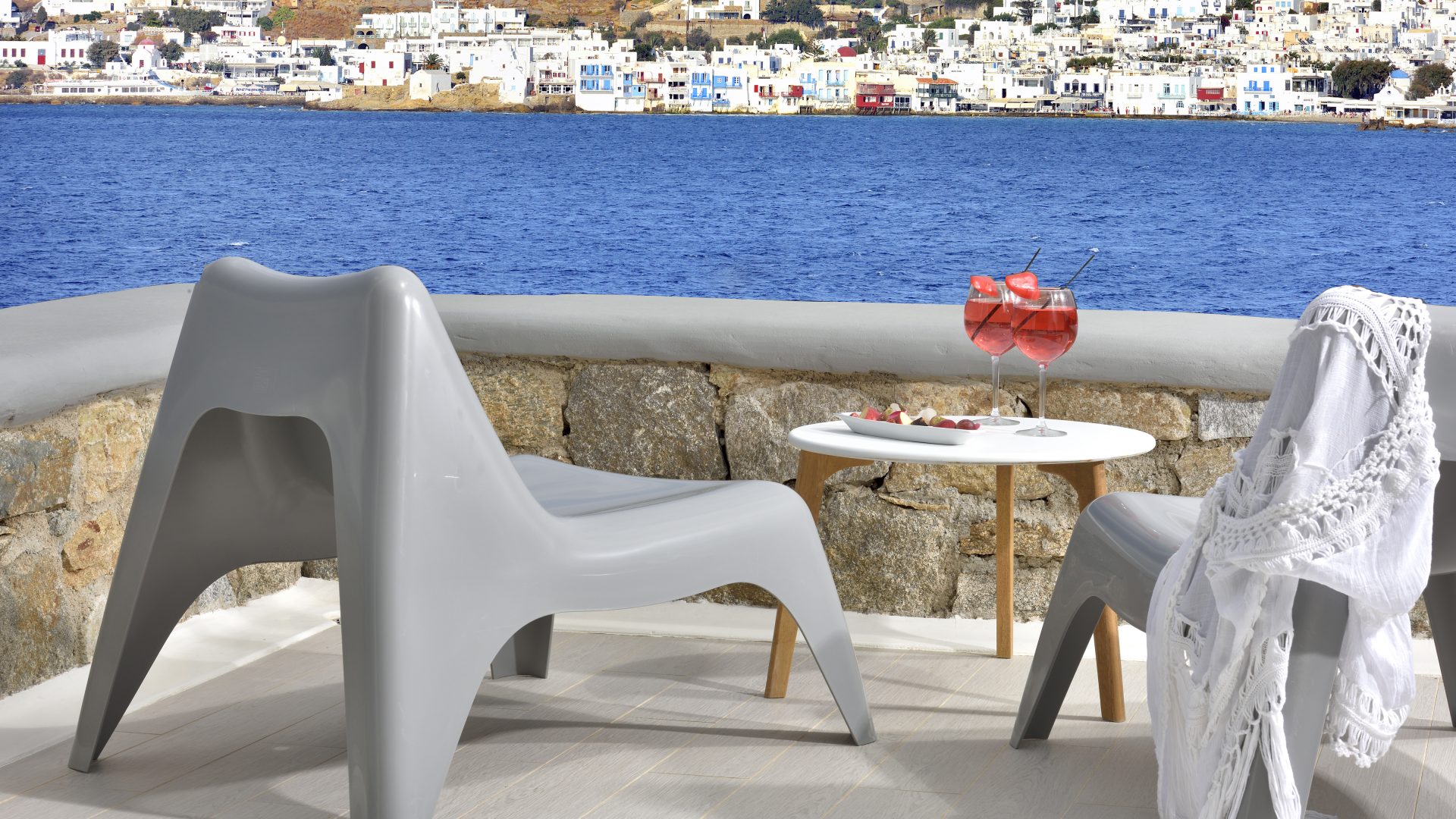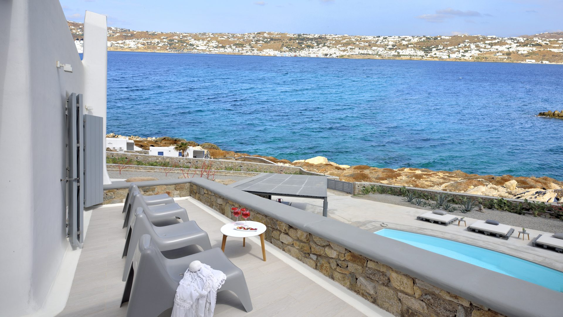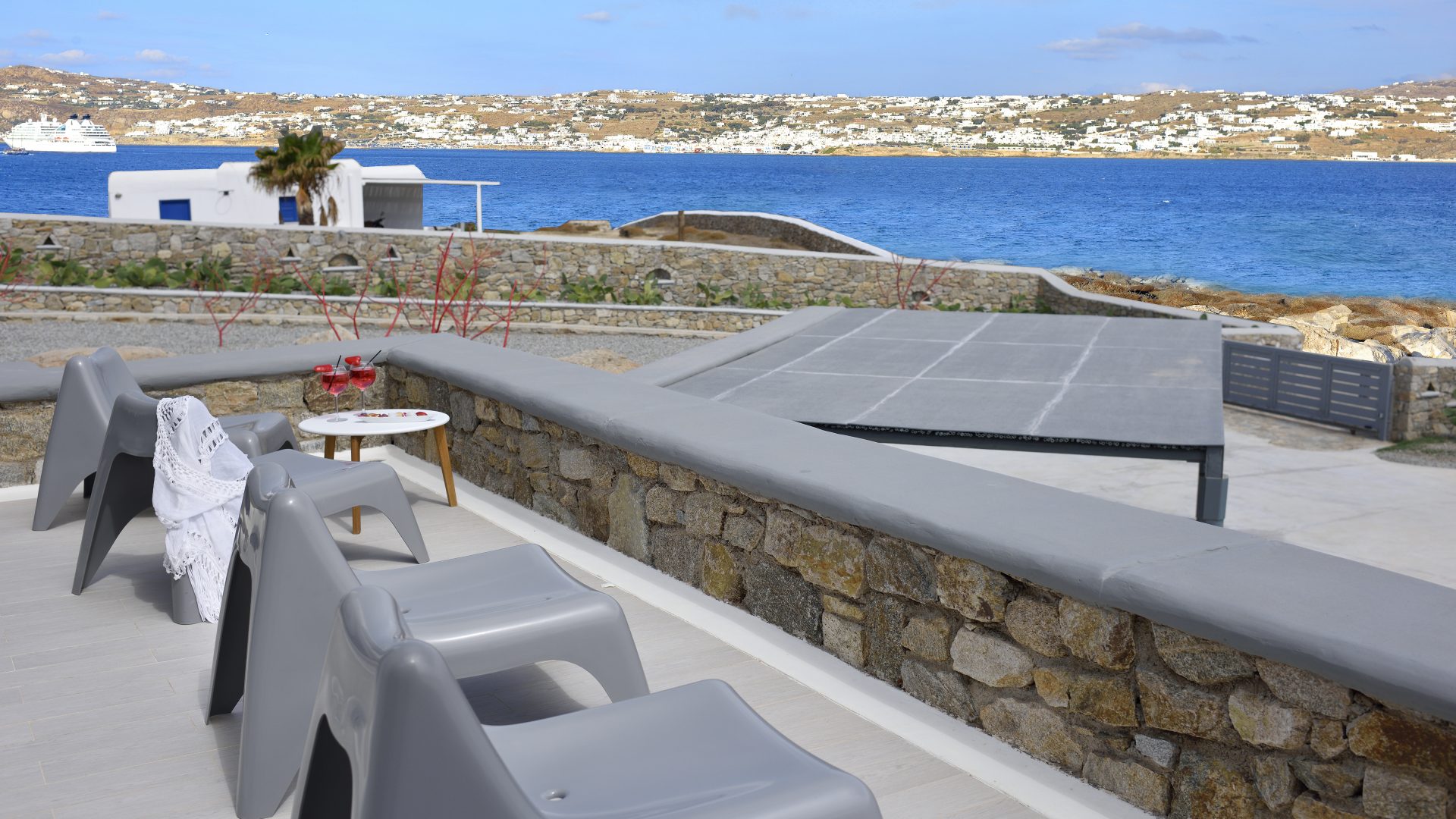 With panoramic view of Mykonos town, the old and new port and the island of Tinos.