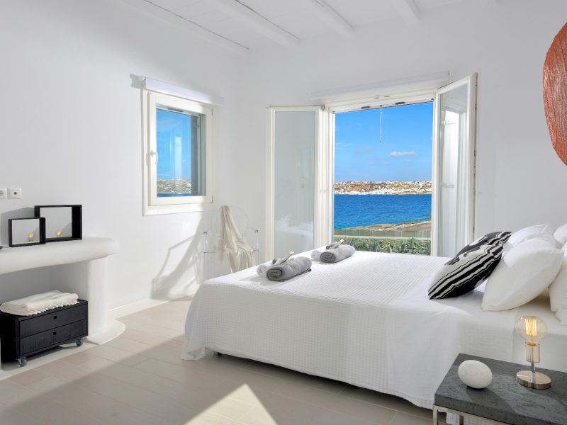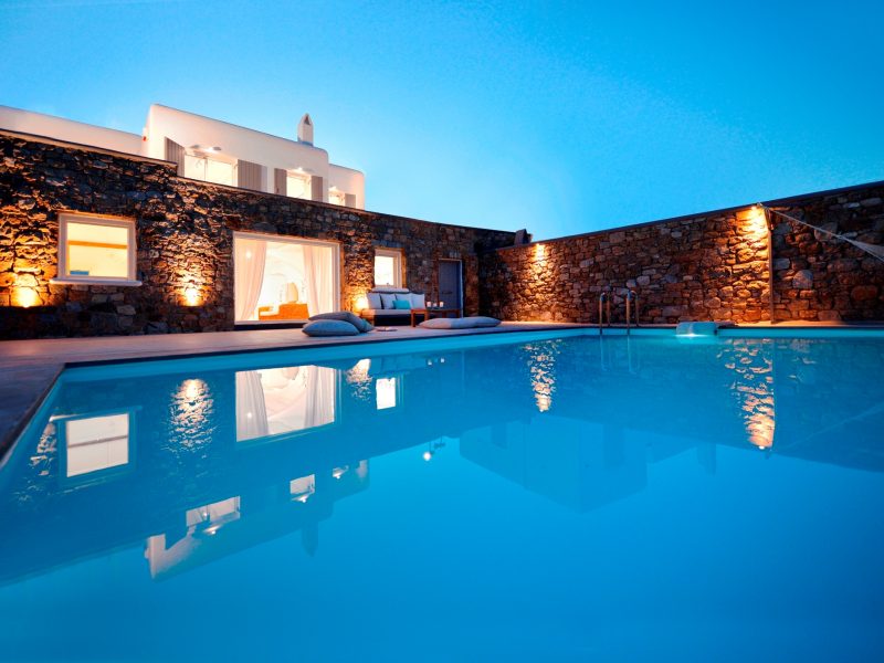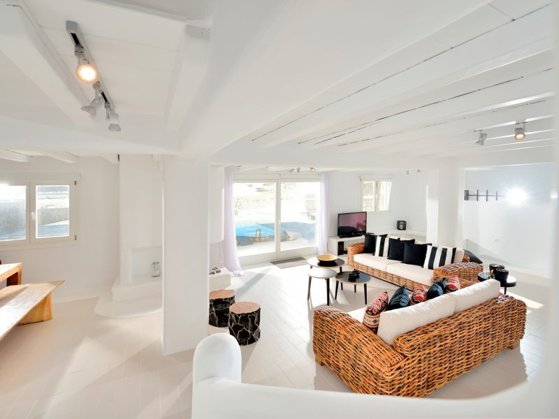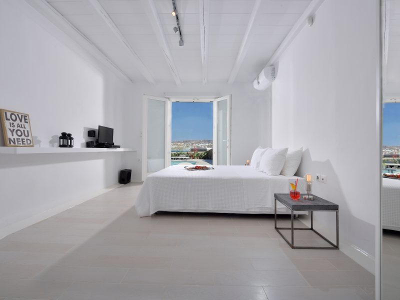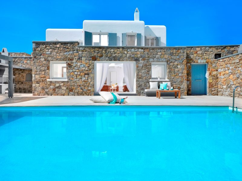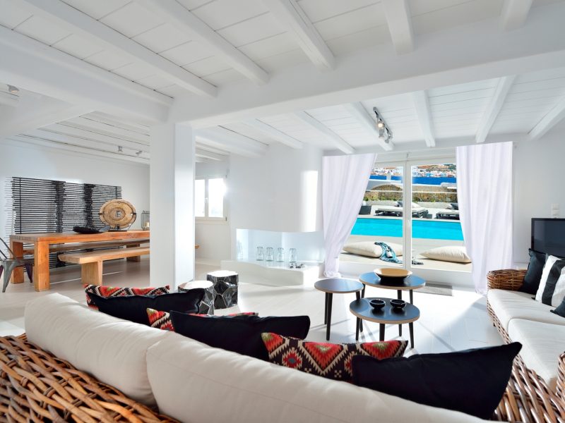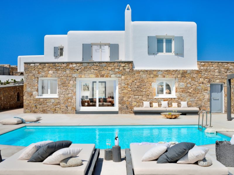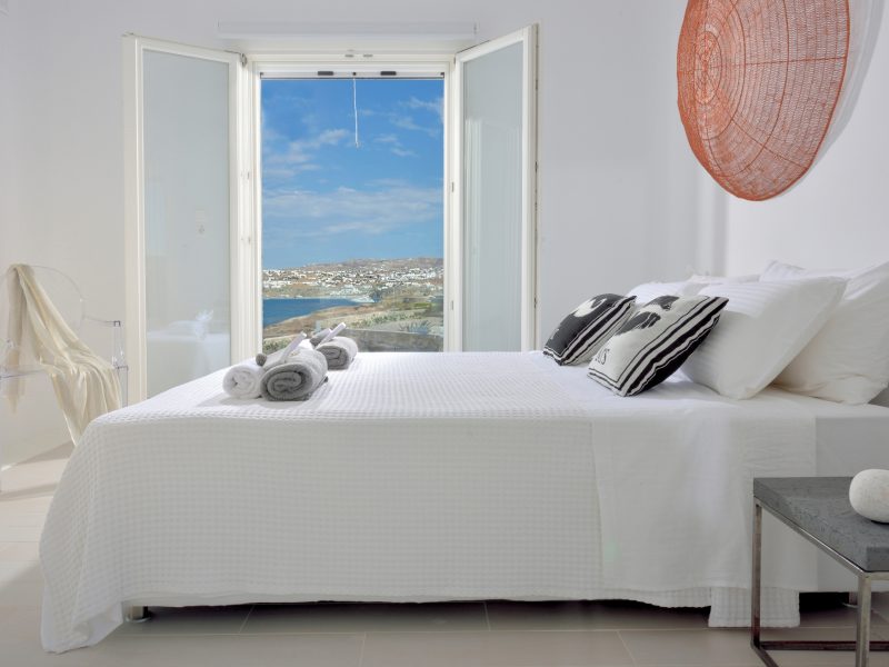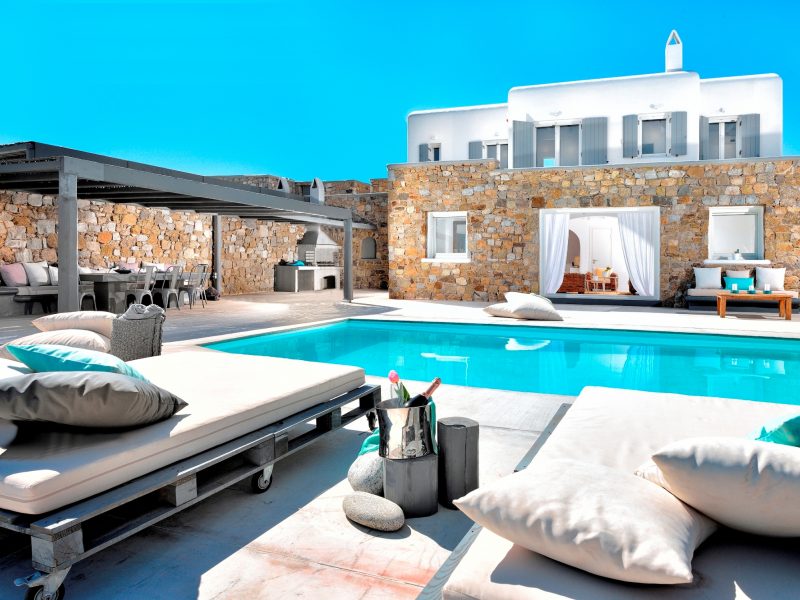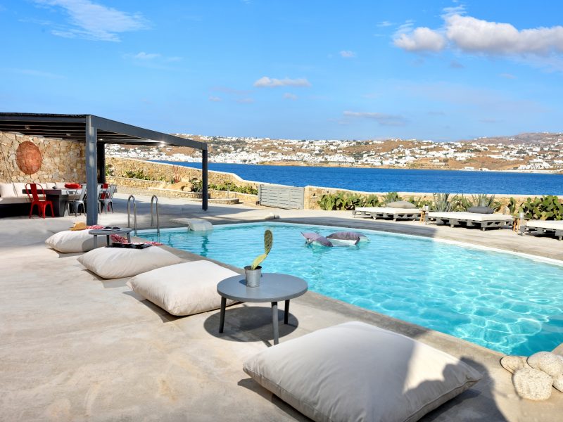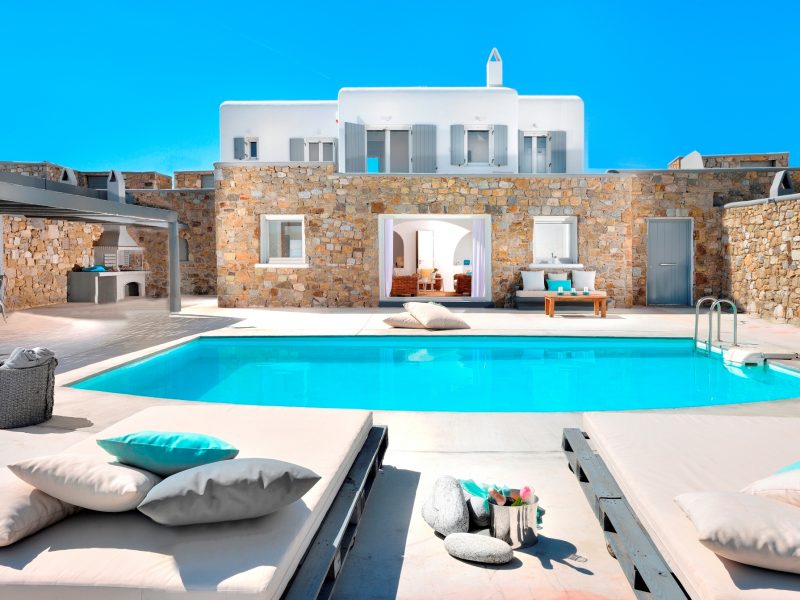 Diamond Villa is a 12-bedroom luxurious villa, located in Kanalia, only 150 meters from the sea. Built in a residence site of 4.800 m2, it has a view of Mykonos Town, Hora and Tinos Island. The villa features 12 bedrooms, 12 bathrooms, 1 extra sitting room with a sofa bed , 3 WC and large indoor and outdoor spaces.