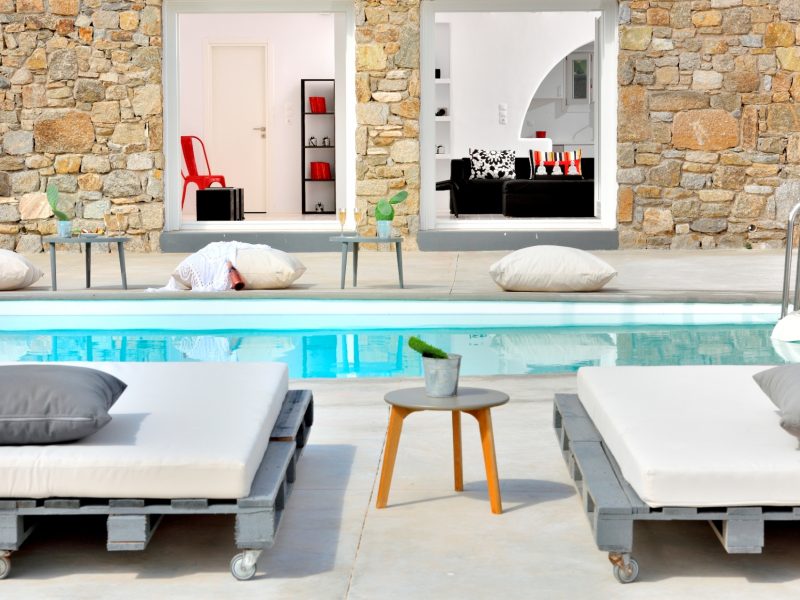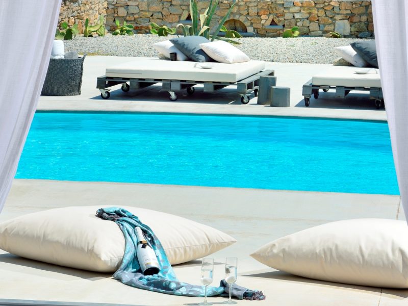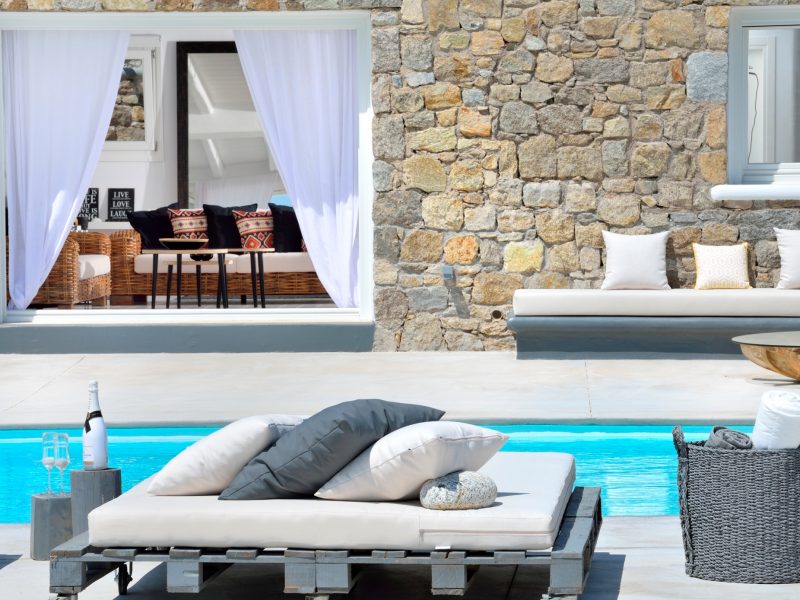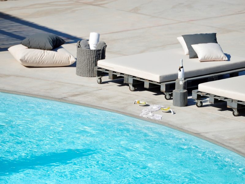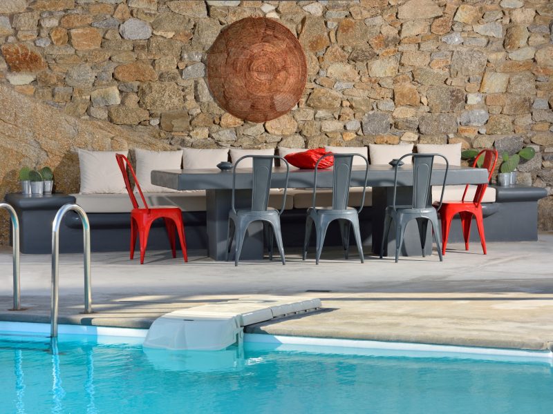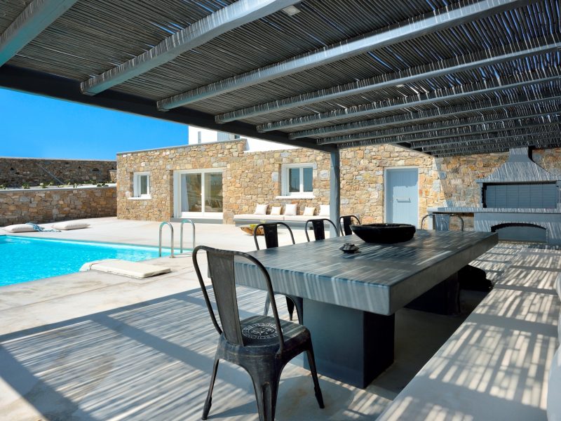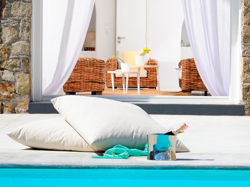 Outside there are pools, barbeque areas, built couches, dining tables and chairs as well as pool towels.