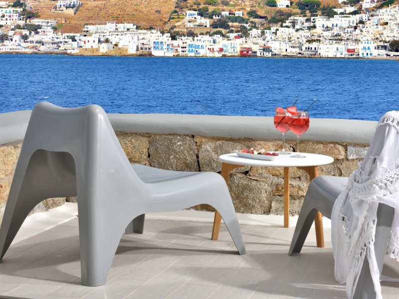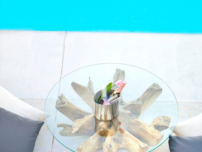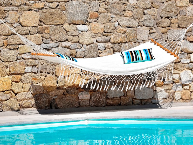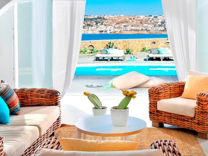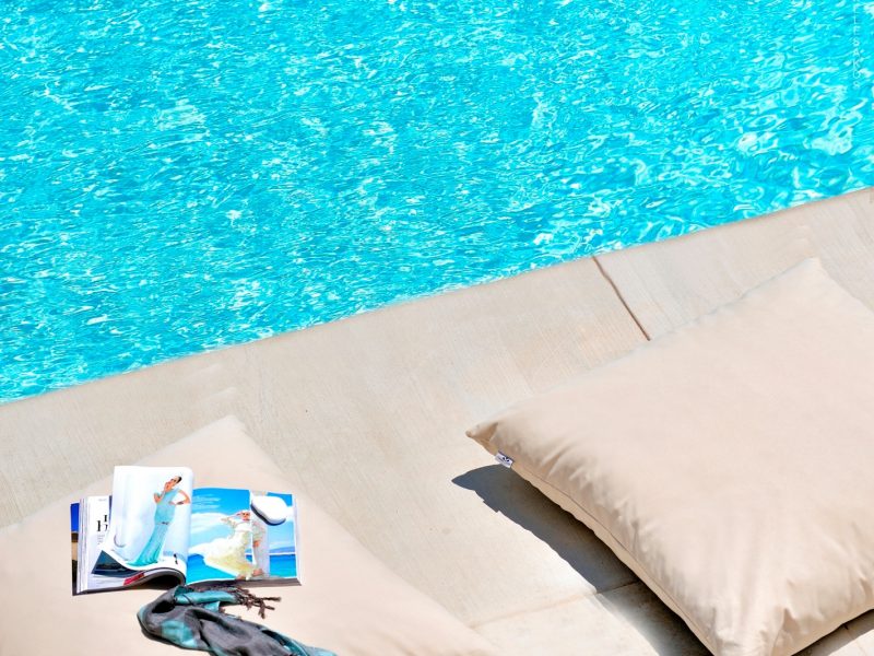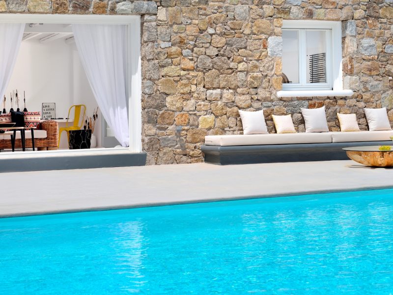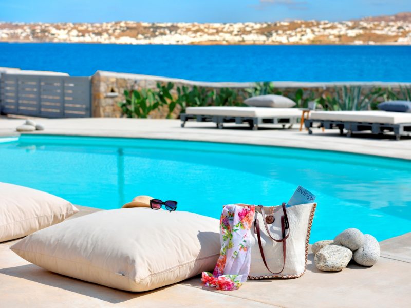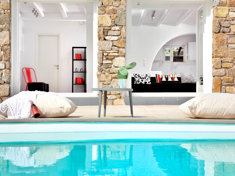 Outside there are pools, barbeque areas, built couches, dining tables and chairs as well as pool towels.